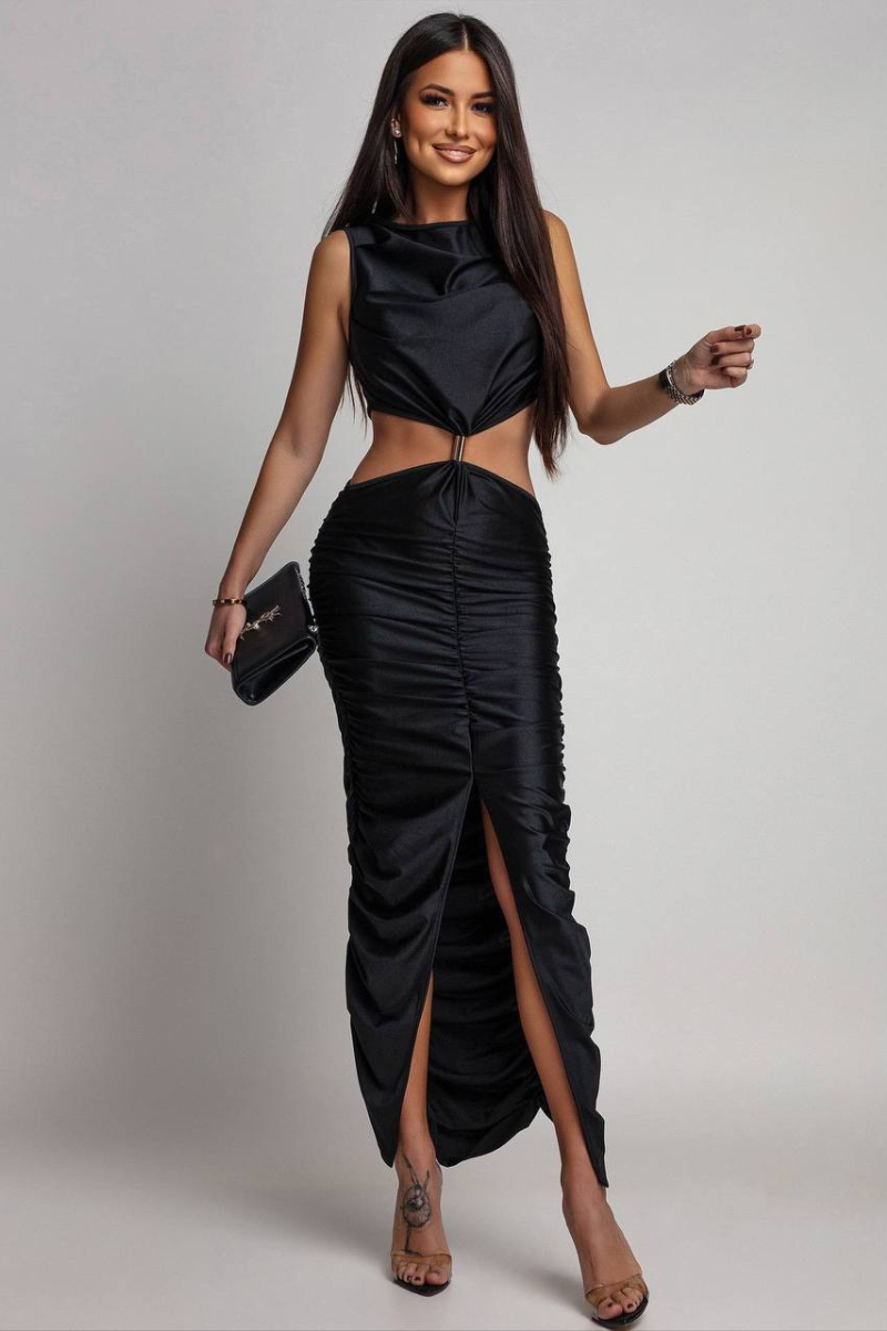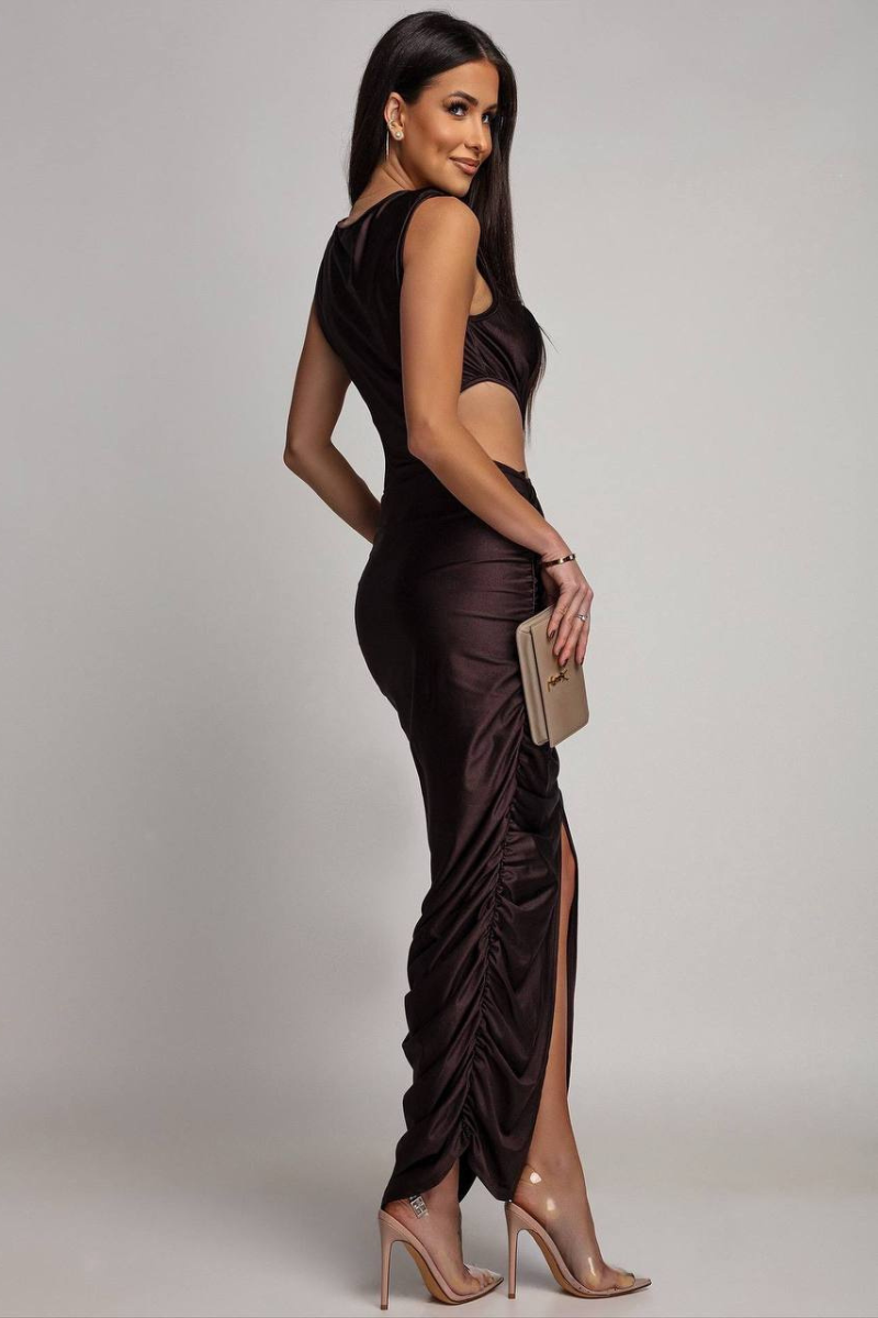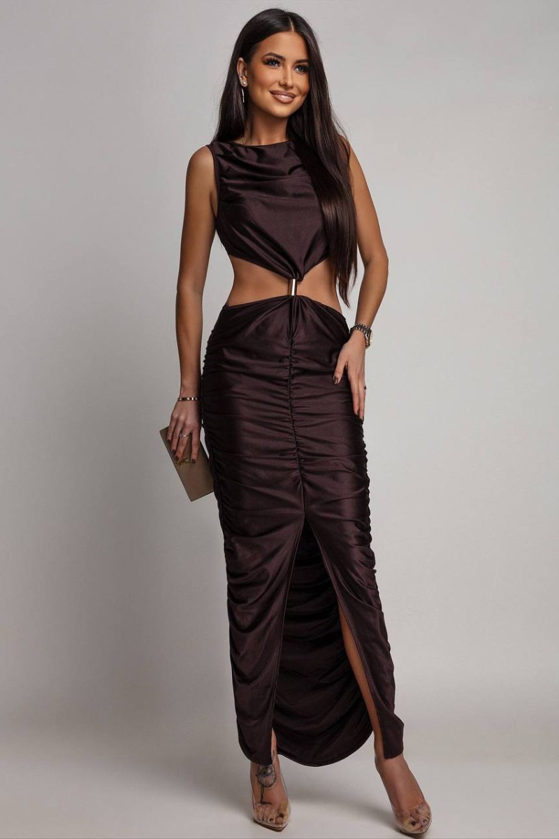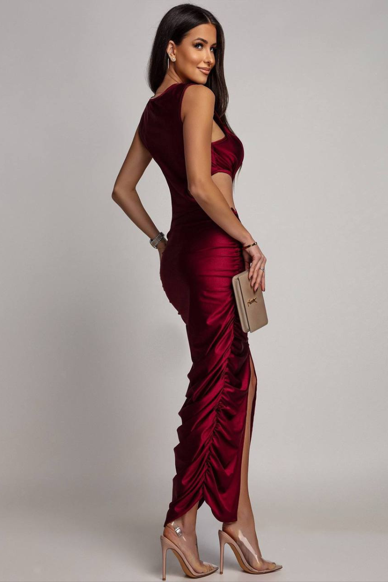 An elegant maxi dress featuring a beautifully ruched design that enhances and flatters the silhouette.
