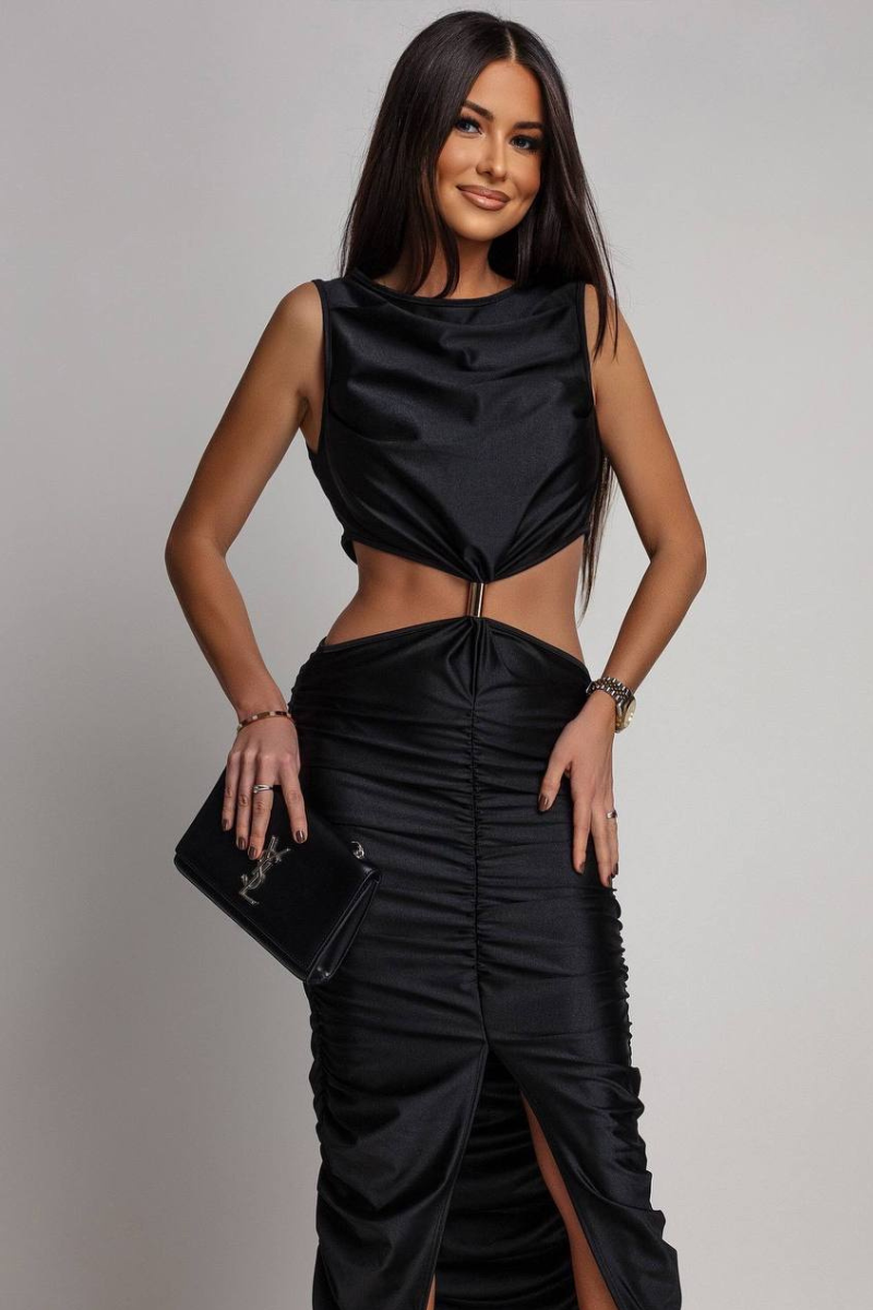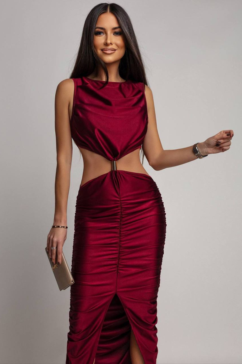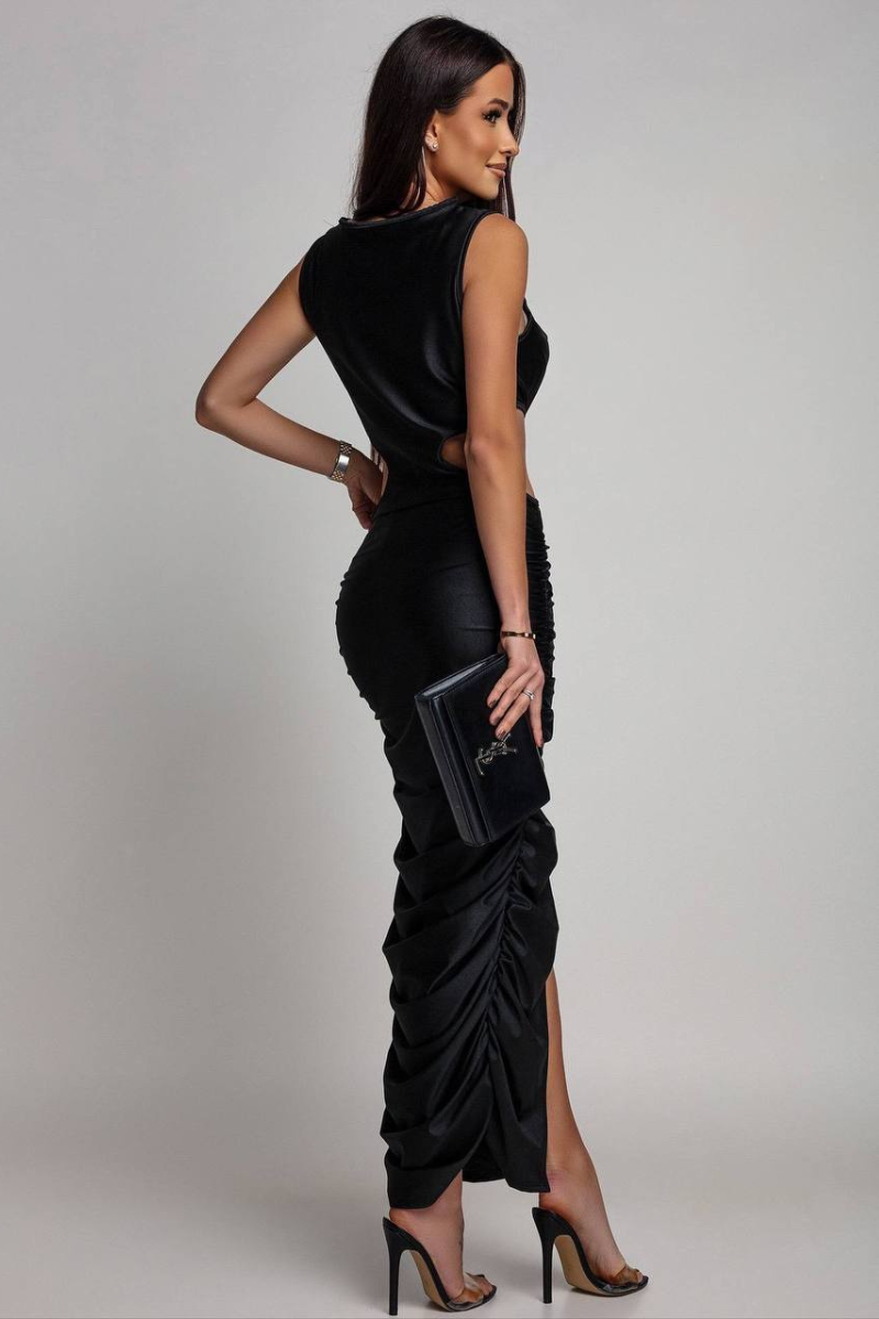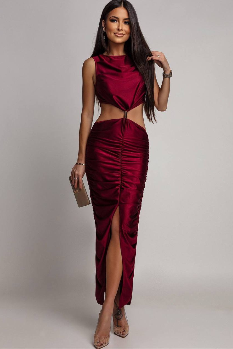 An elegant maxi dress featuring a beautifully ruched design that enhances and flatters the silhouette.