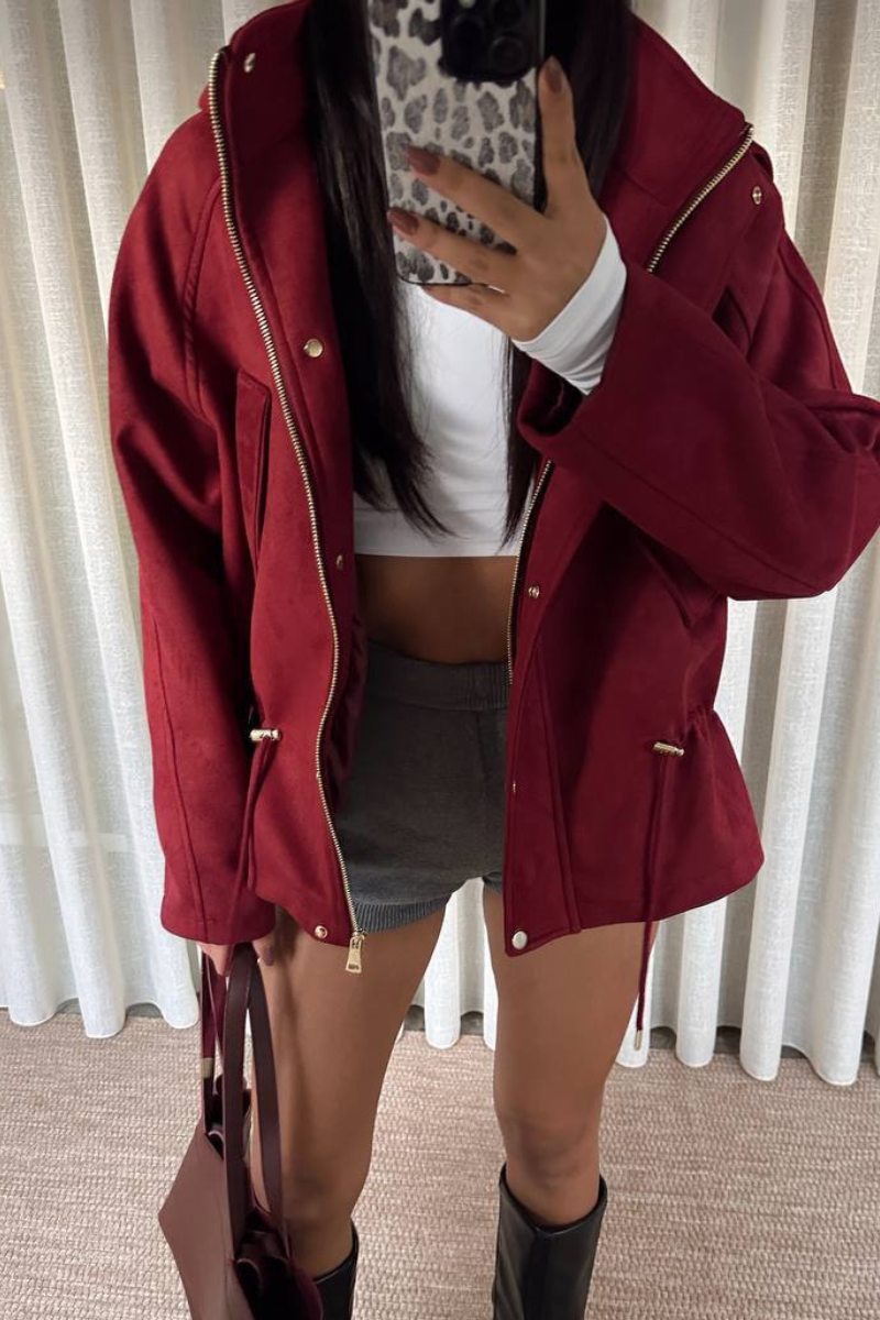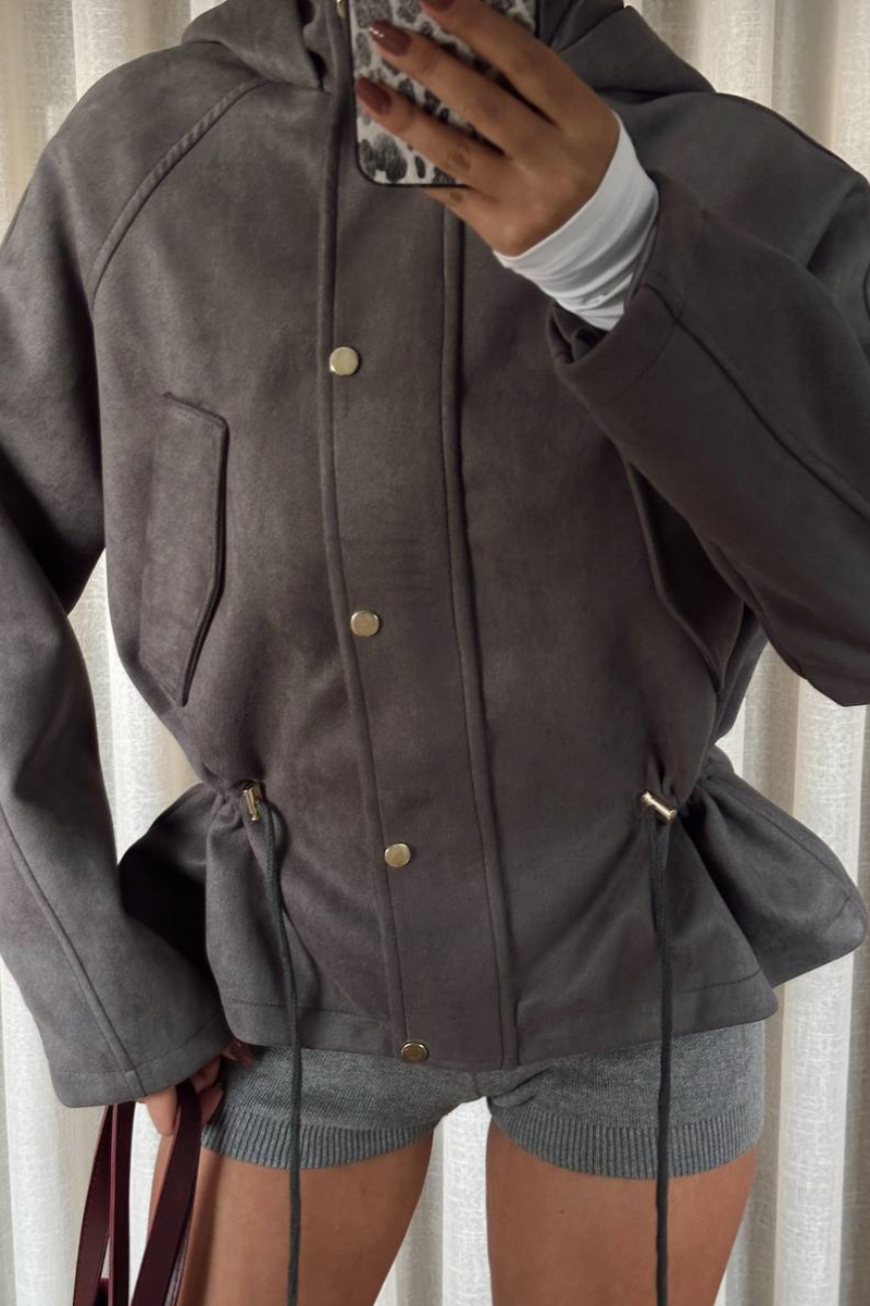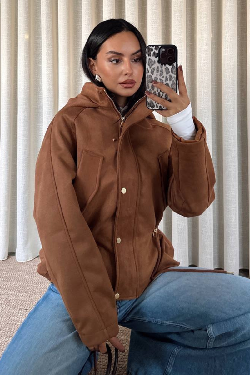 Stay cozy and stylish with this fitted sueded jacket, featuring a hood for extra warmth and a sleek silhouette.