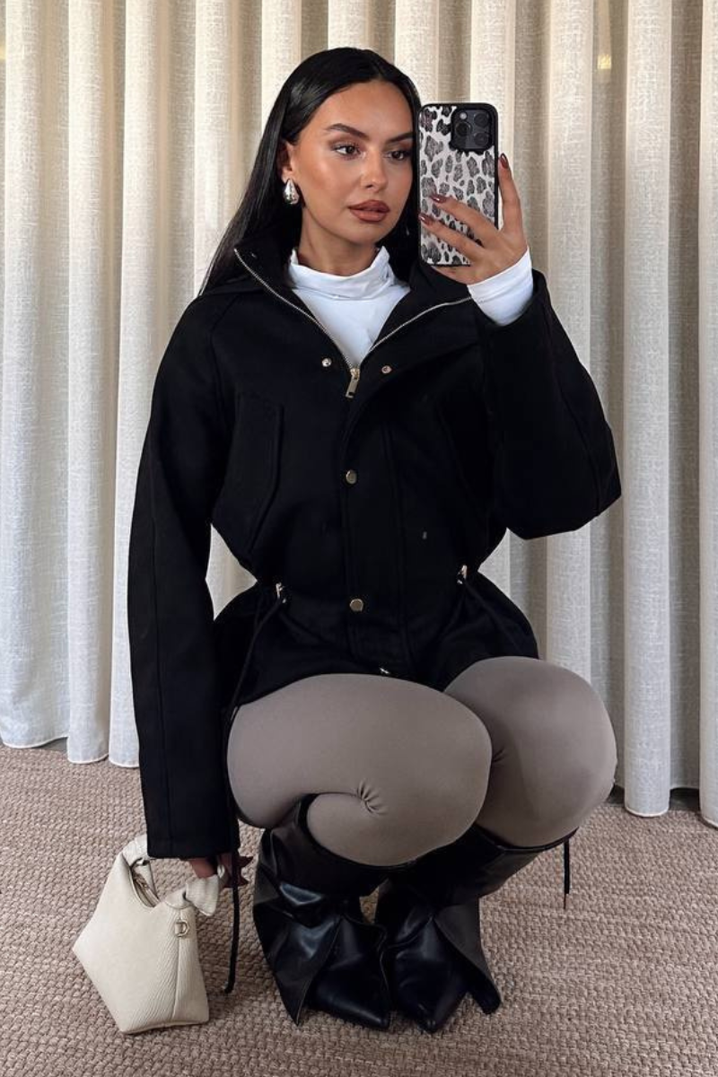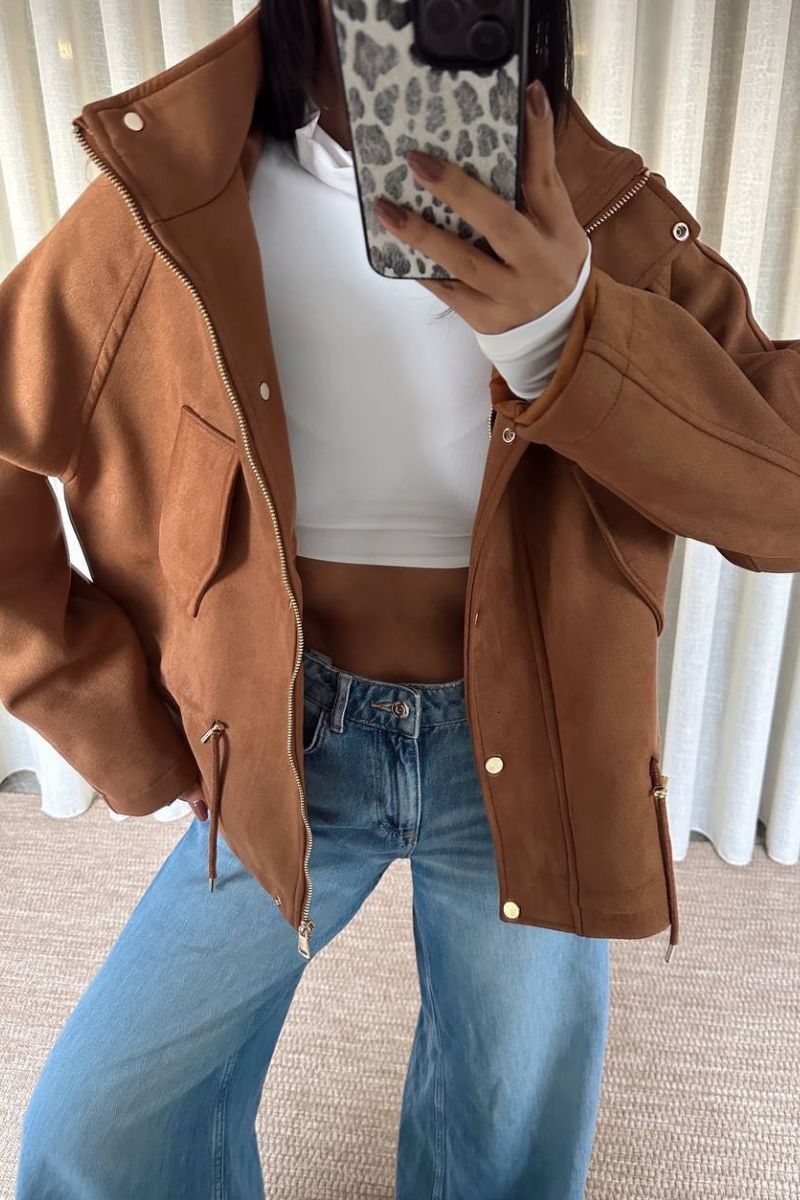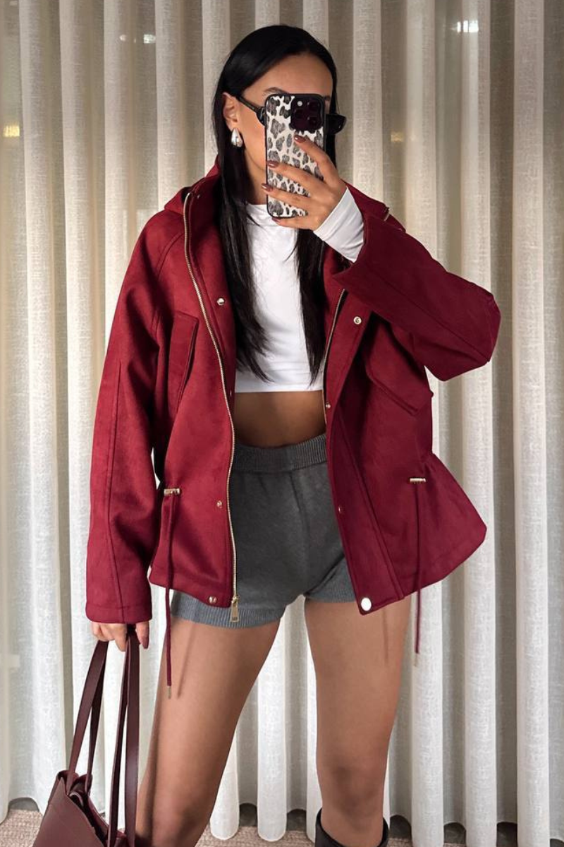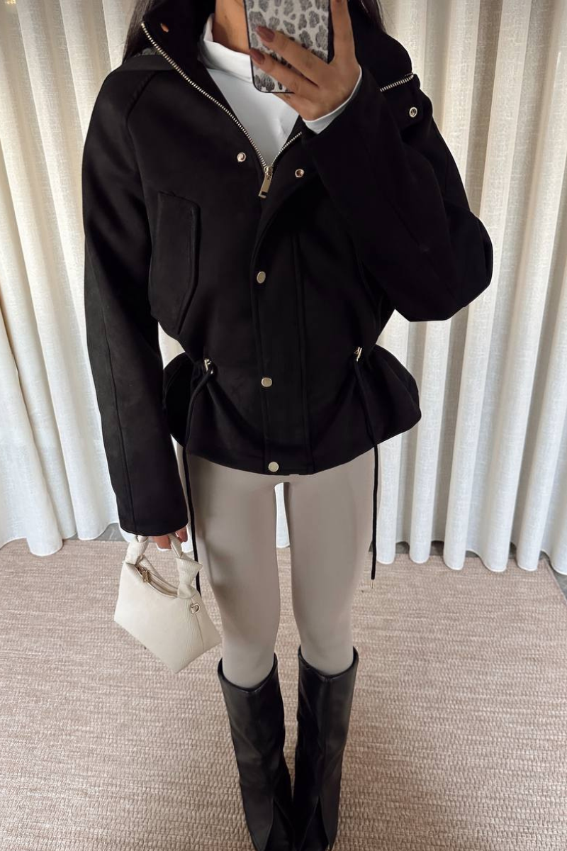 Stay cozy and stylish with this fitted sueded jacket, featuring a hood for extra warmth and a sleek silhouette.