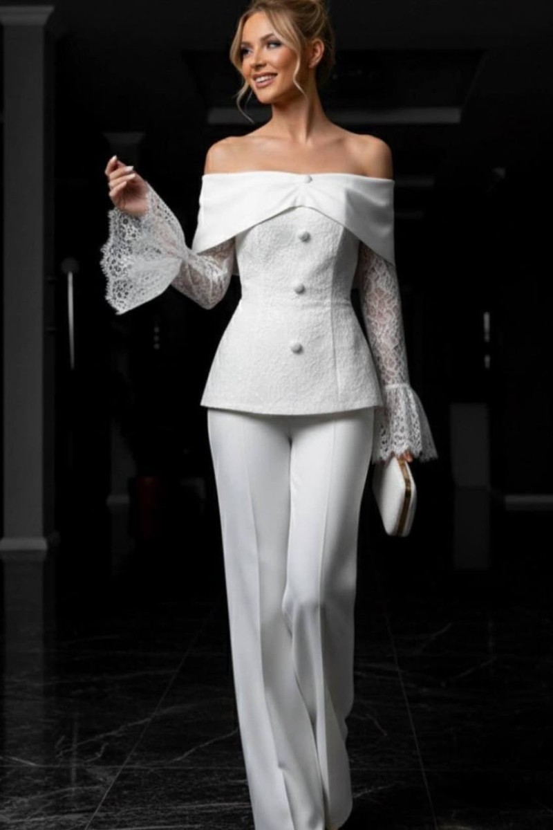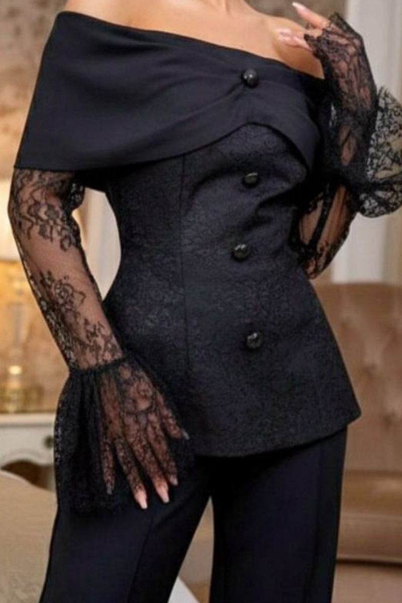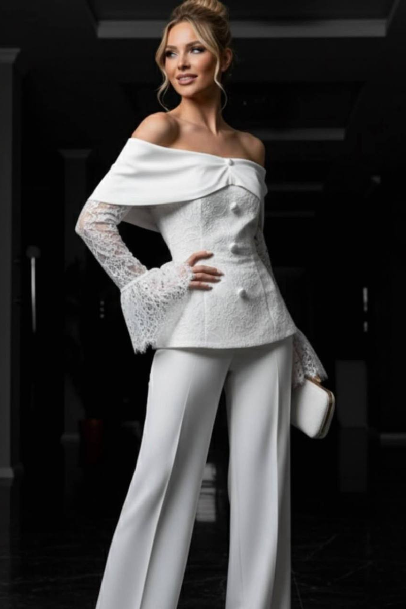 A sophisticated pantsuit featuring elegant lace sleeves for a refined, feminine touch.