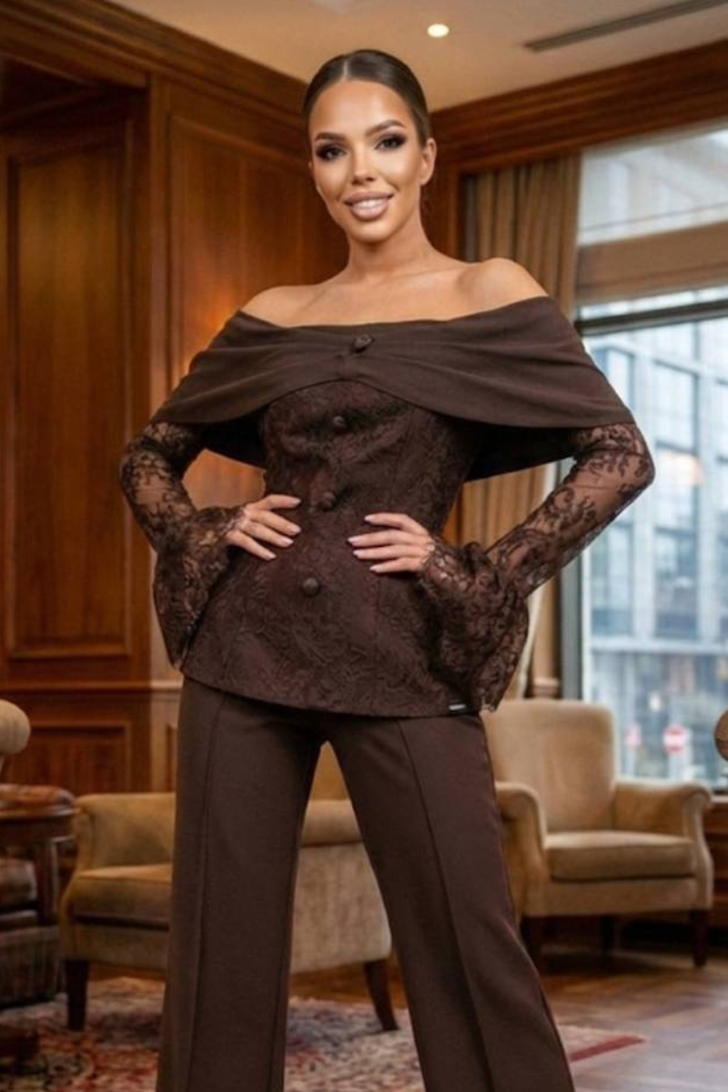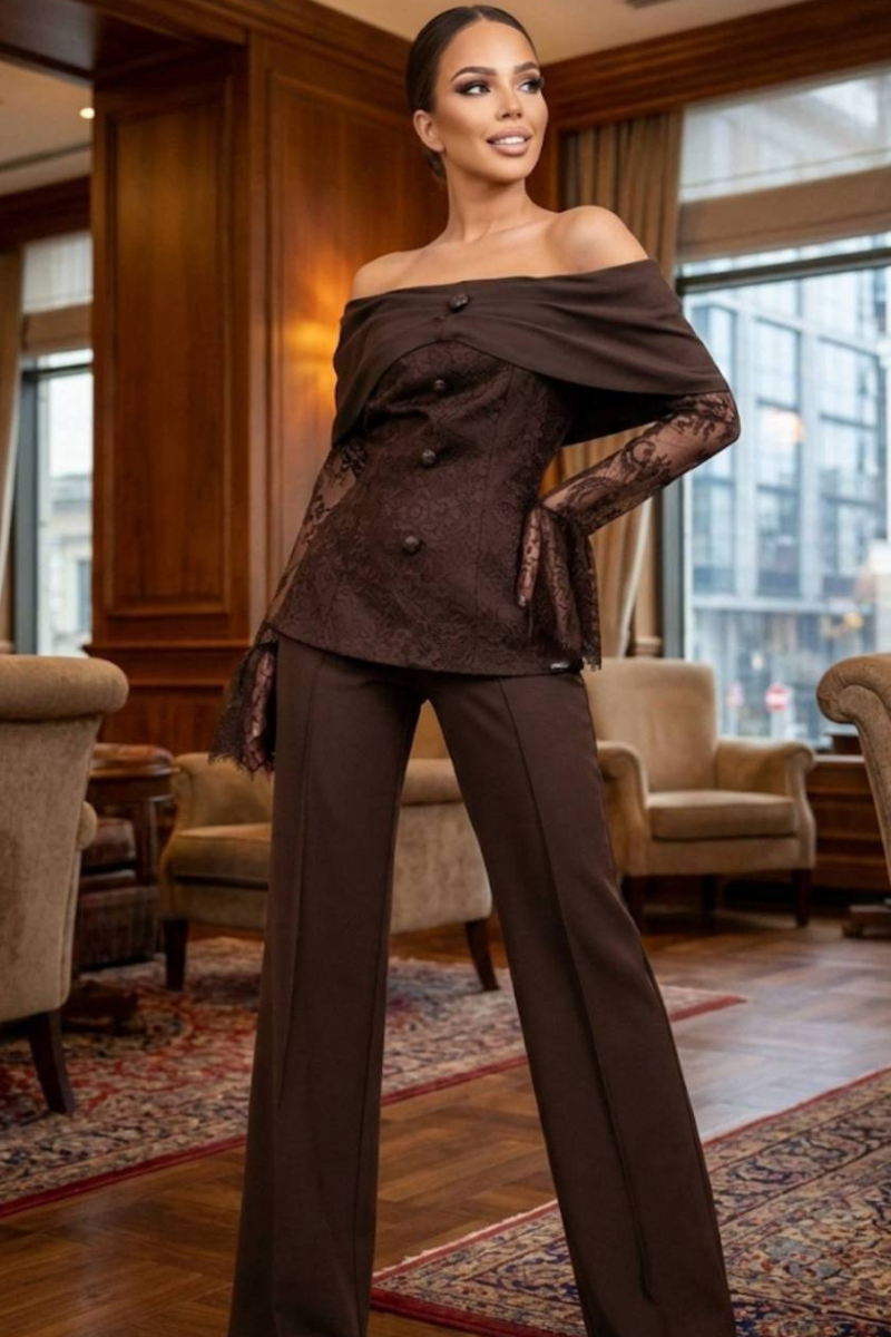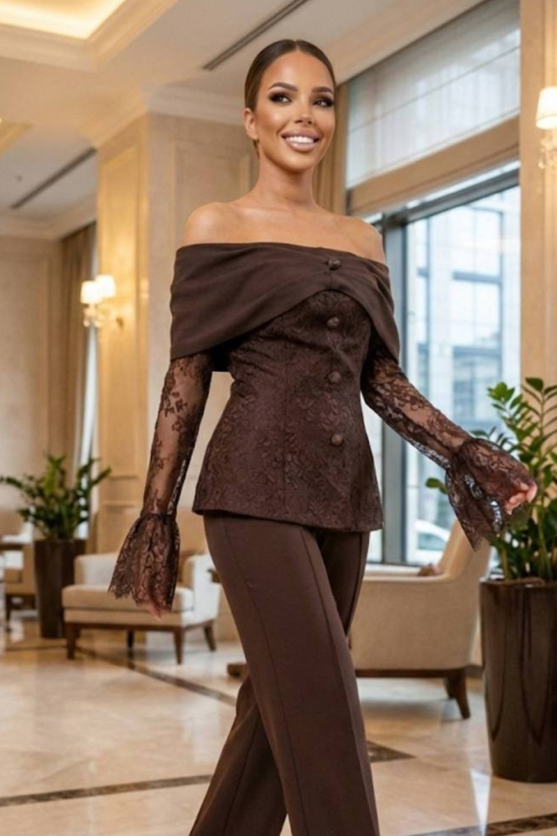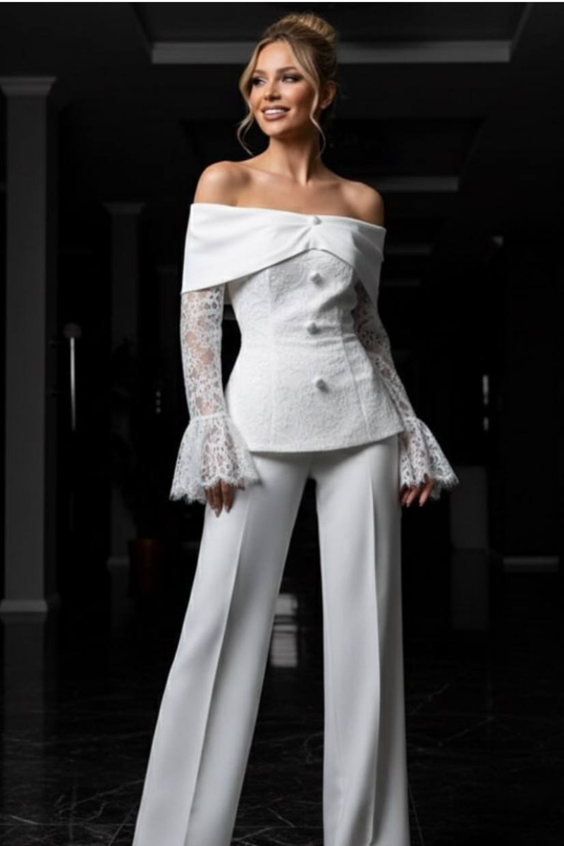 A sophisticated pantsuit featuring elegant lace sleeves for a refined, feminine touch.
