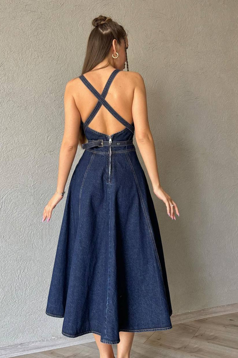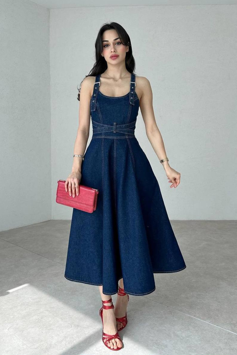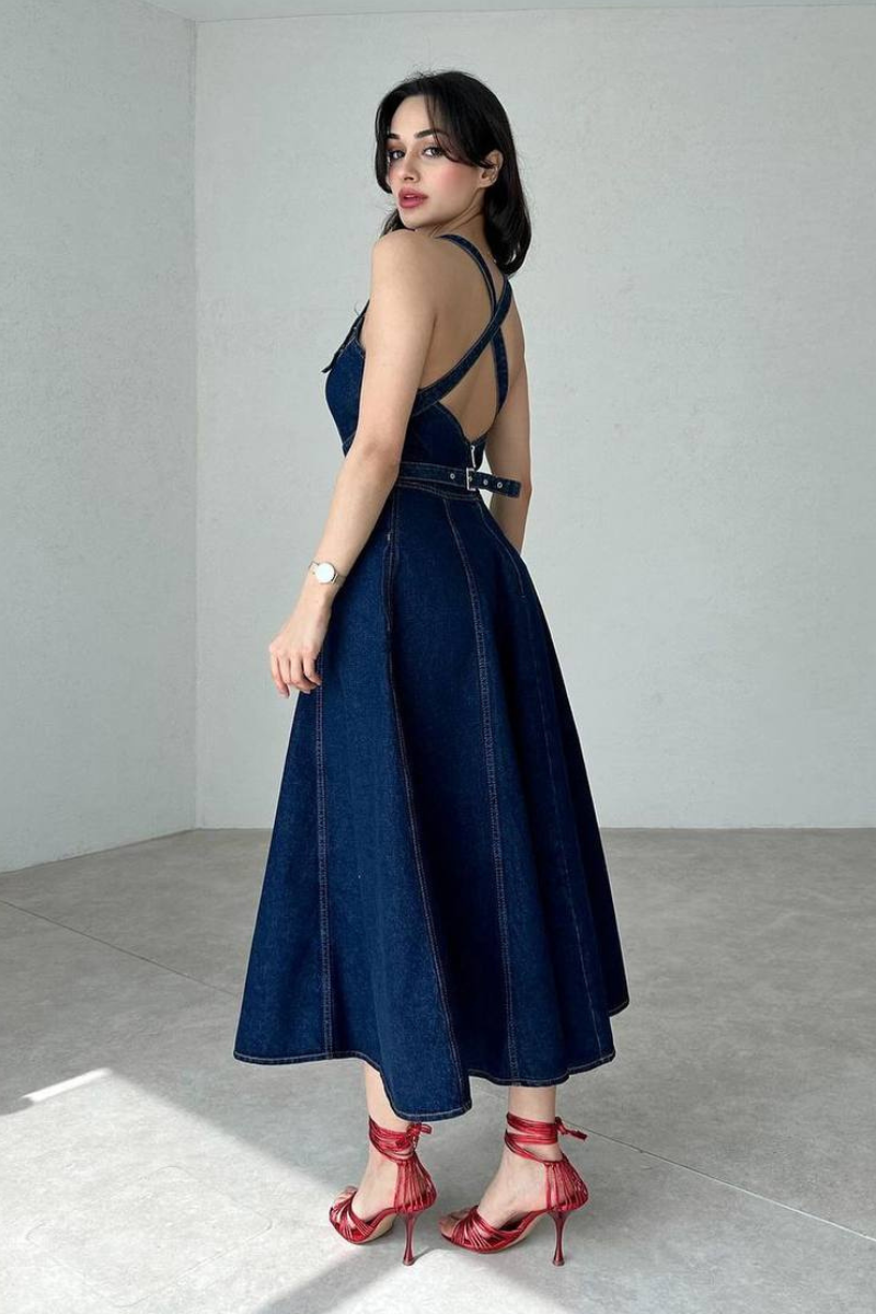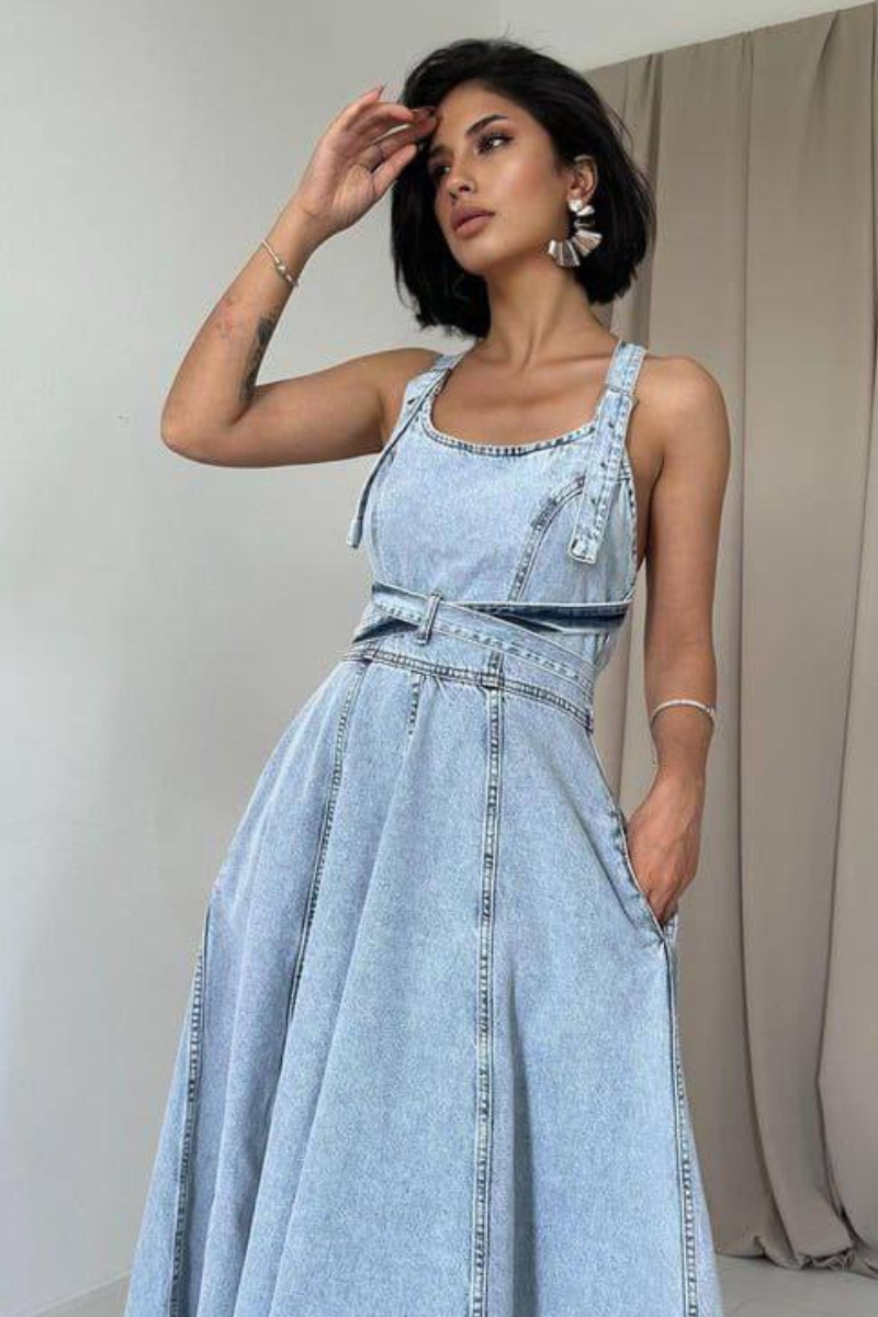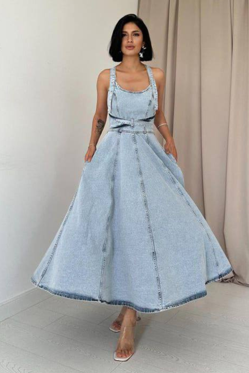 Stunning denim flare dress, designed to offer both style and comfort. This timeless piece features a fitted bodice that gracefully flares out from the waist, creating a flattering silhouette for all body types.
