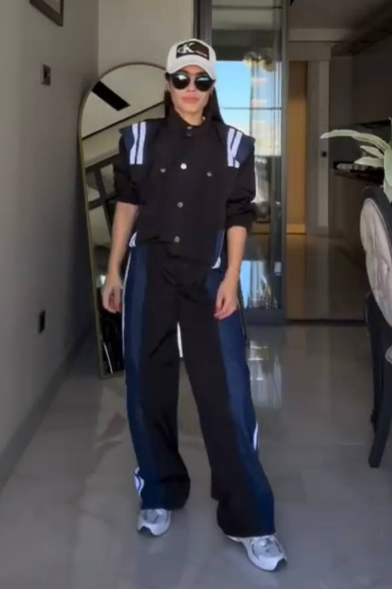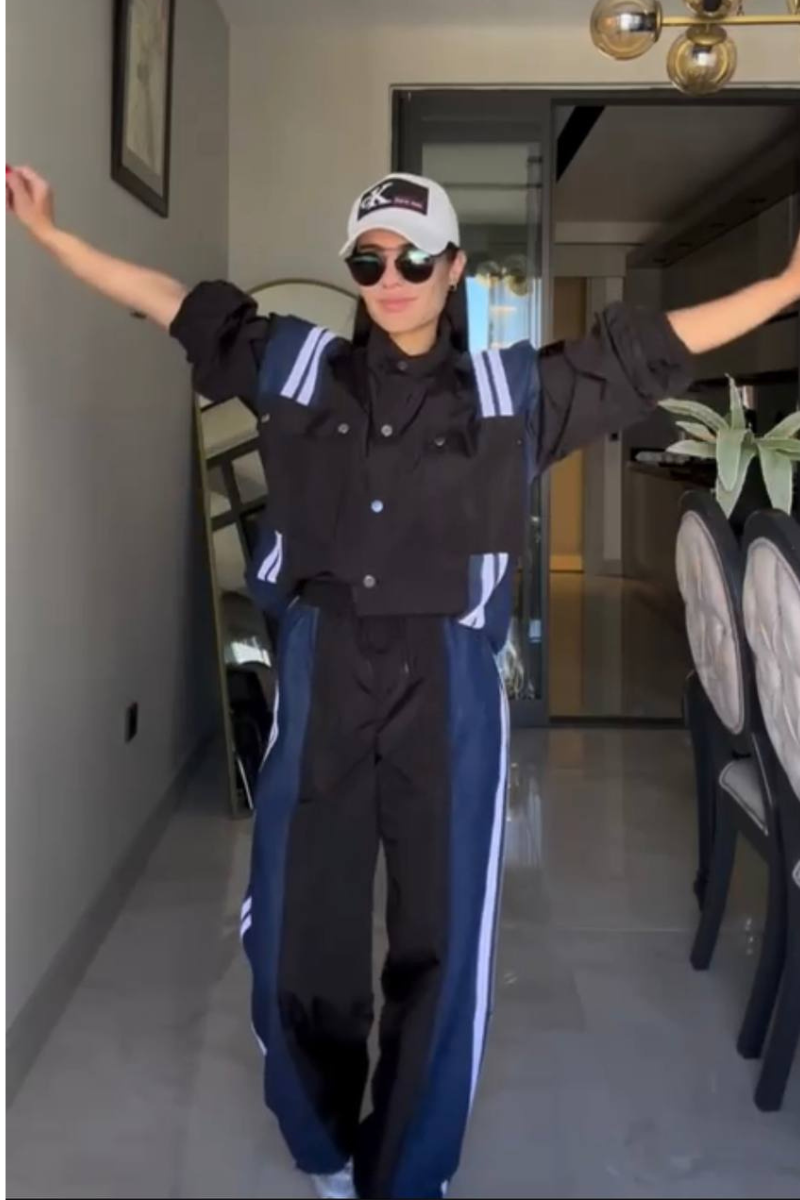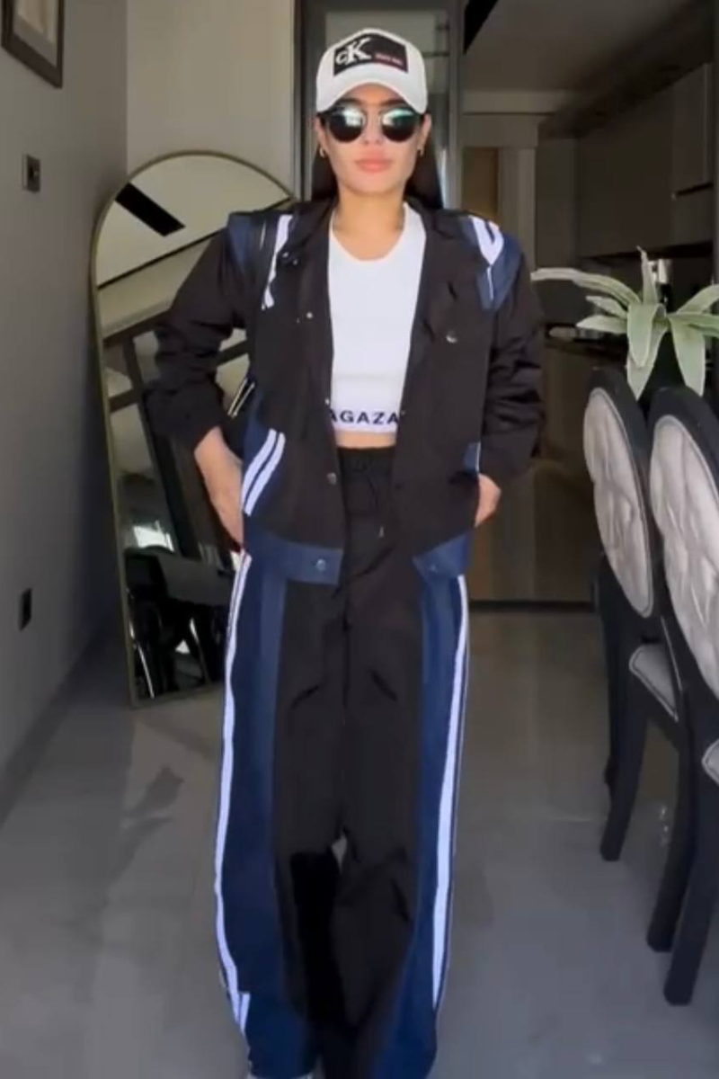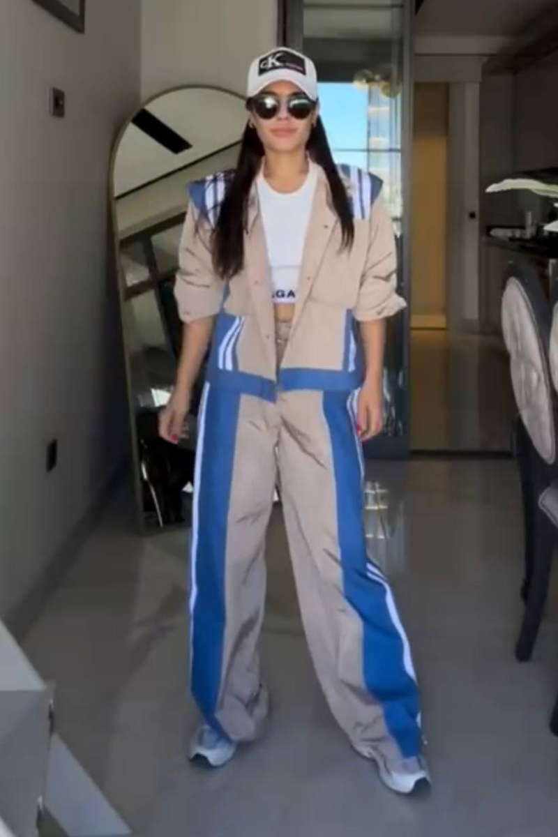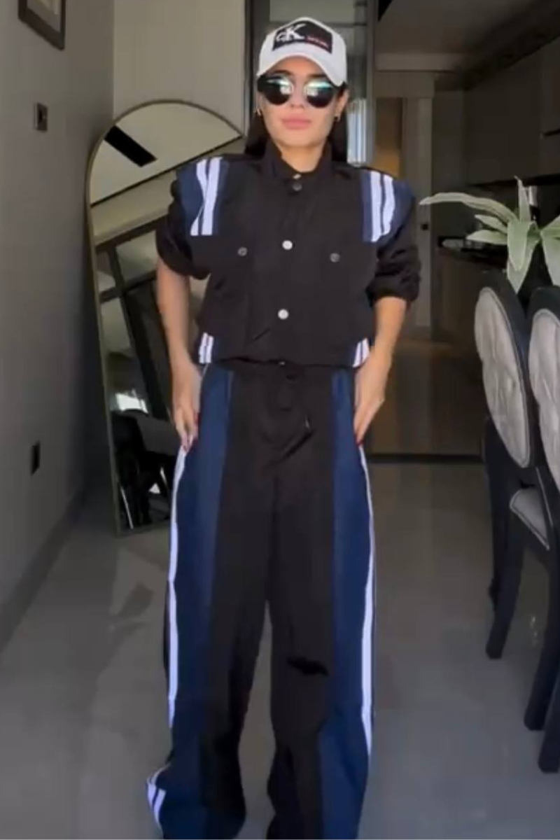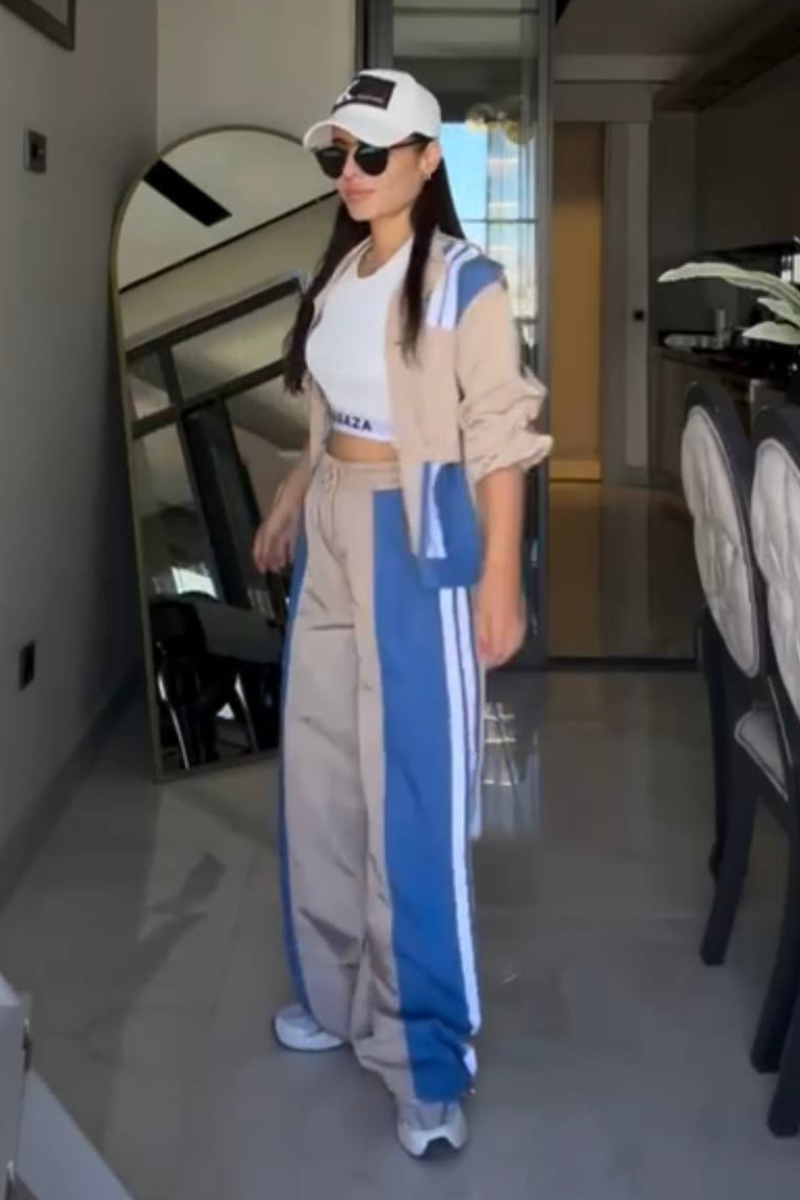 Sporty and stylish pants set. The outfit consists of a loose-fitting beige jacket with bold blue and white stripes running along the shoulders and down the sides.