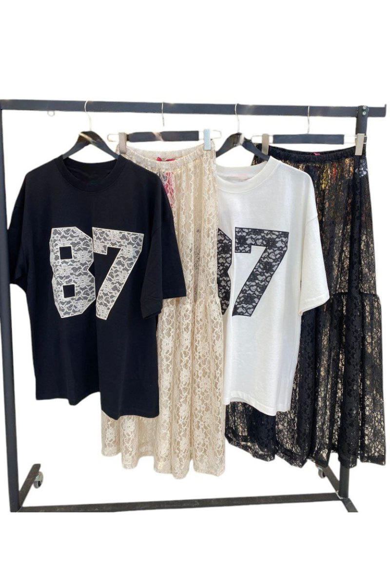 A T-shirt lace design skirt set is a trendy, coordinated outfit that combines the casual appeal of a T-shirt with the feminine touch of lace for a balanced and stylish look