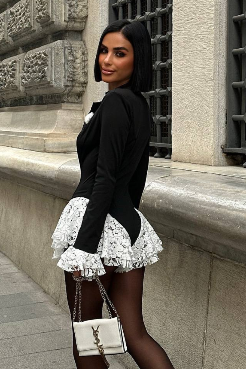 The mini lace mix ruffle dress is a playful yet elegant piece that combines delicate lace with flirty ruffle details for a feminine, youthful look.