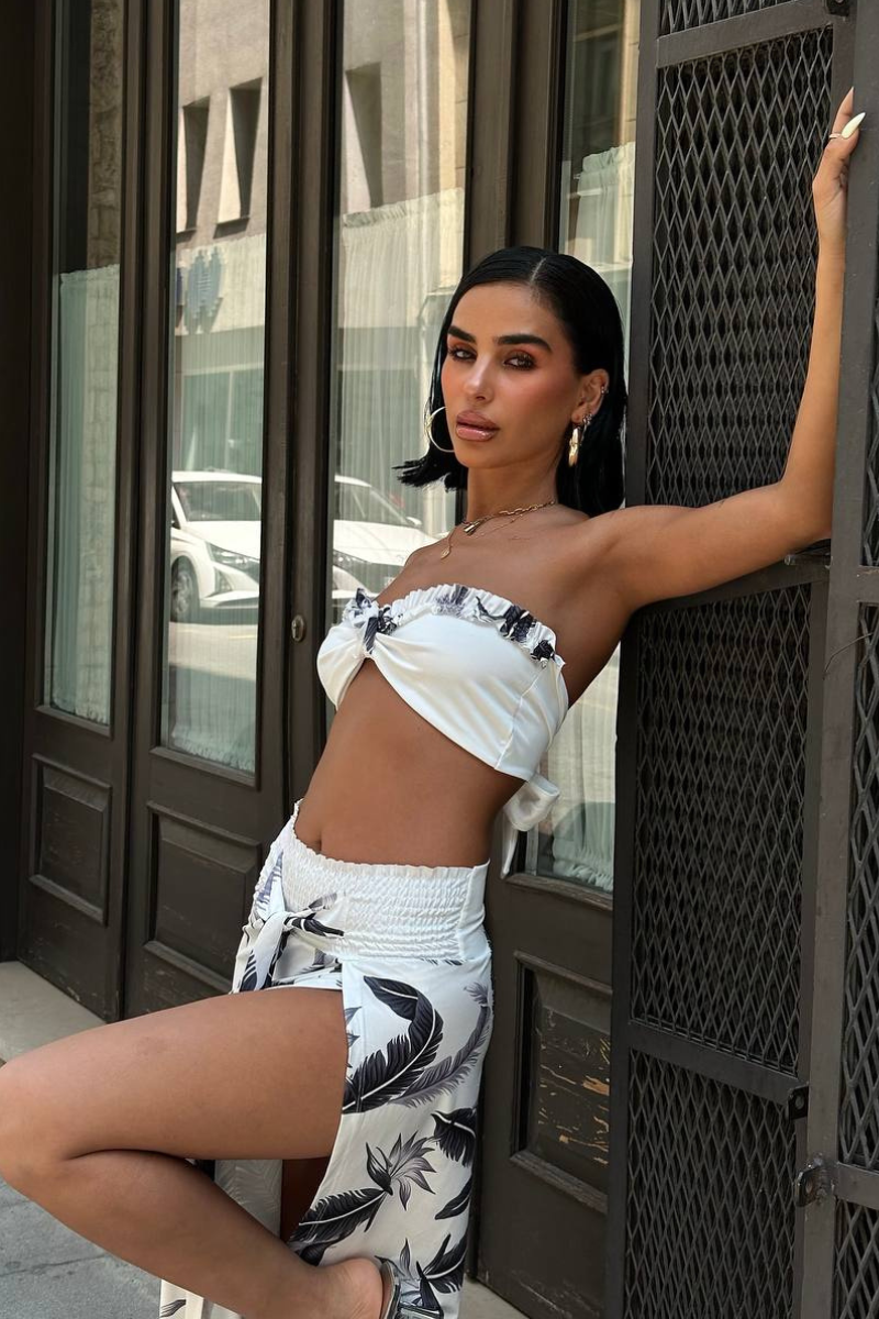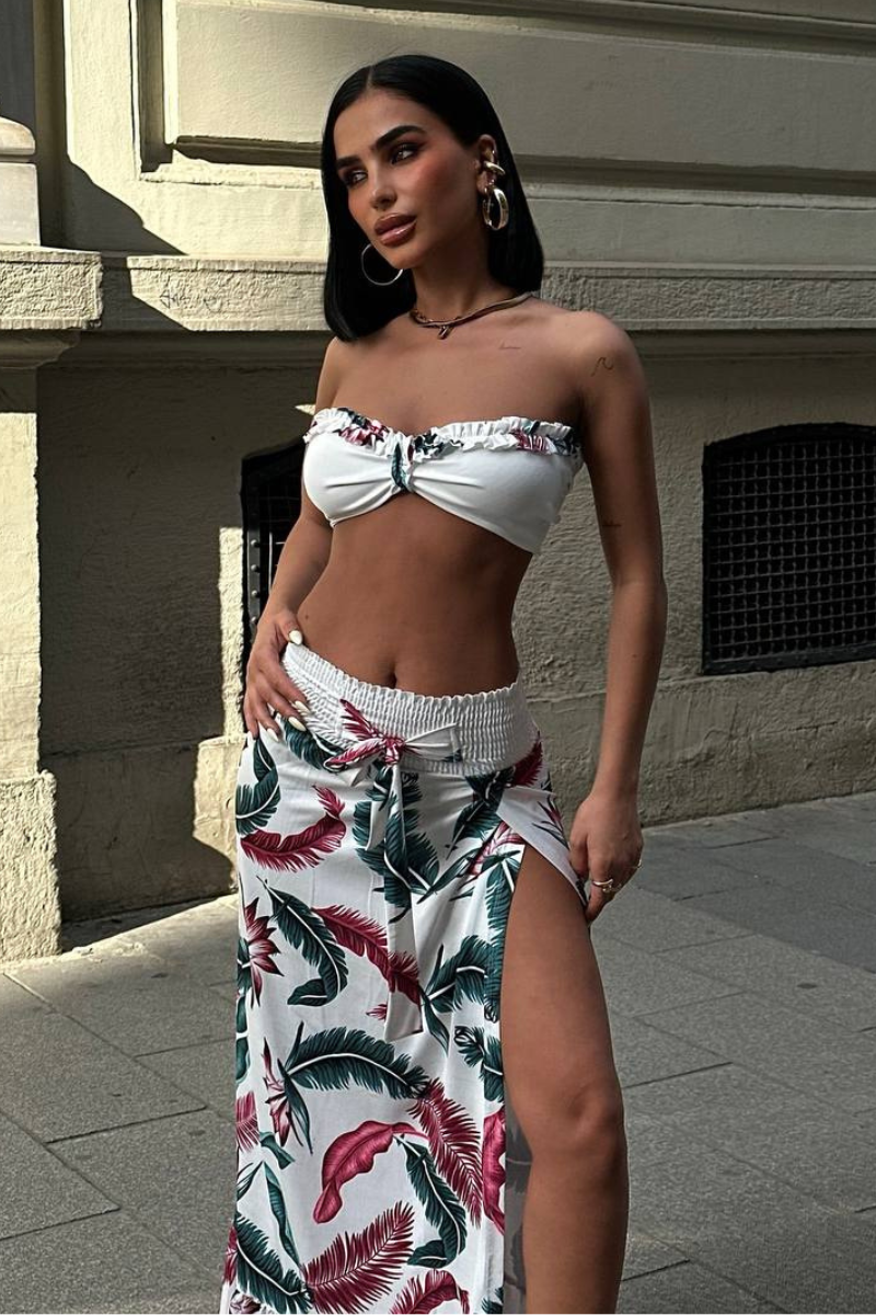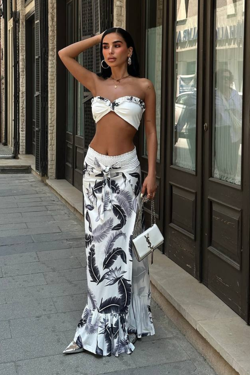 A coordinated two-piece outfit featuring a flowy, floral-print maxi skirt paired with a matching top.