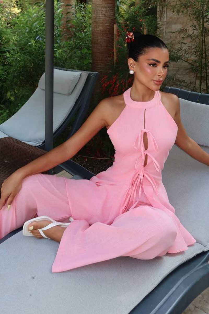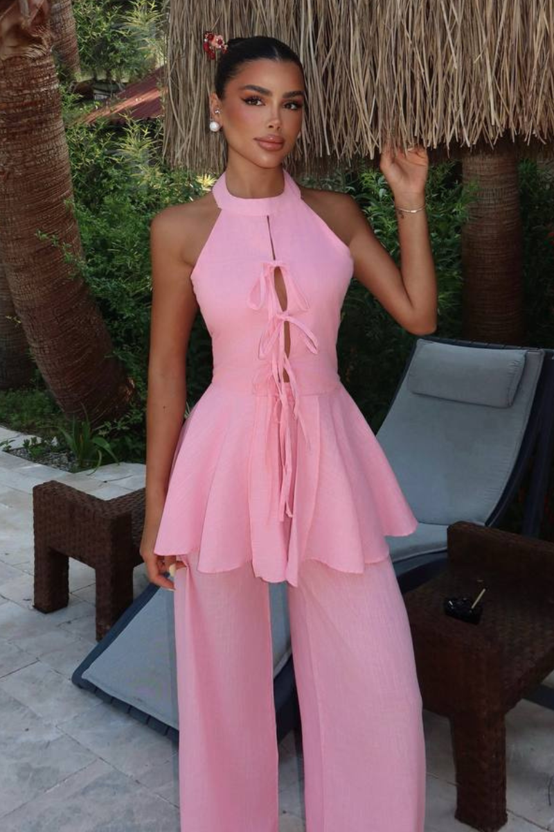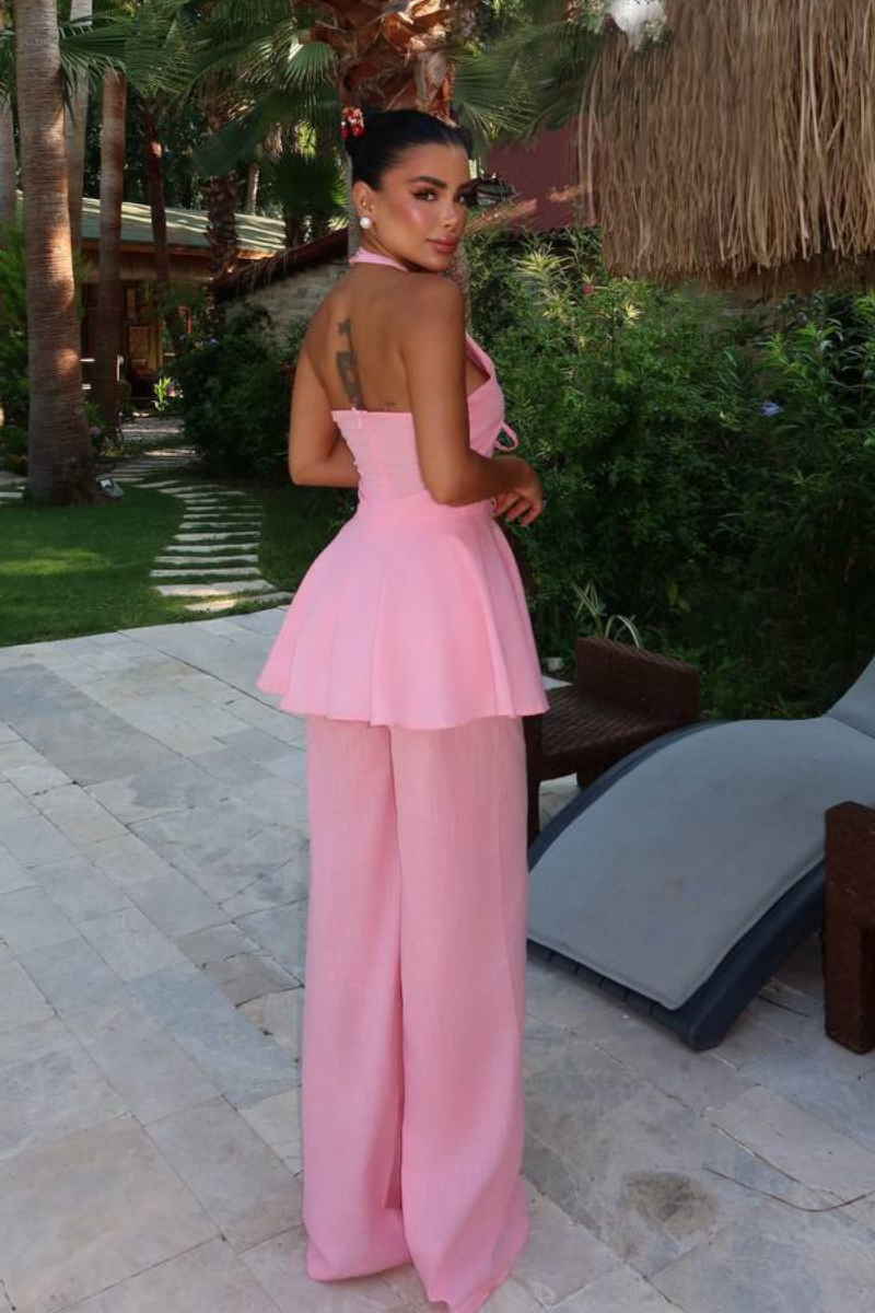 Tailored pants suit set featuring a sleek blazer with structured shoulders and matching high-waisted trousers.