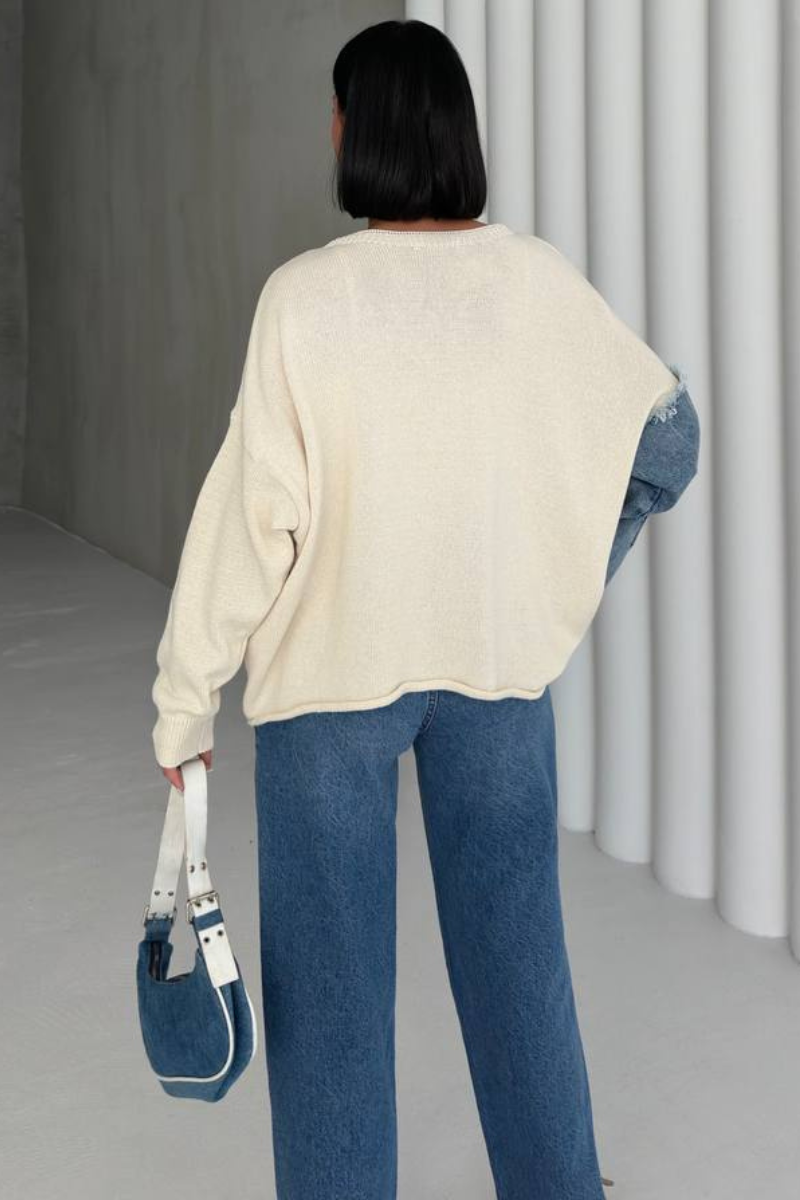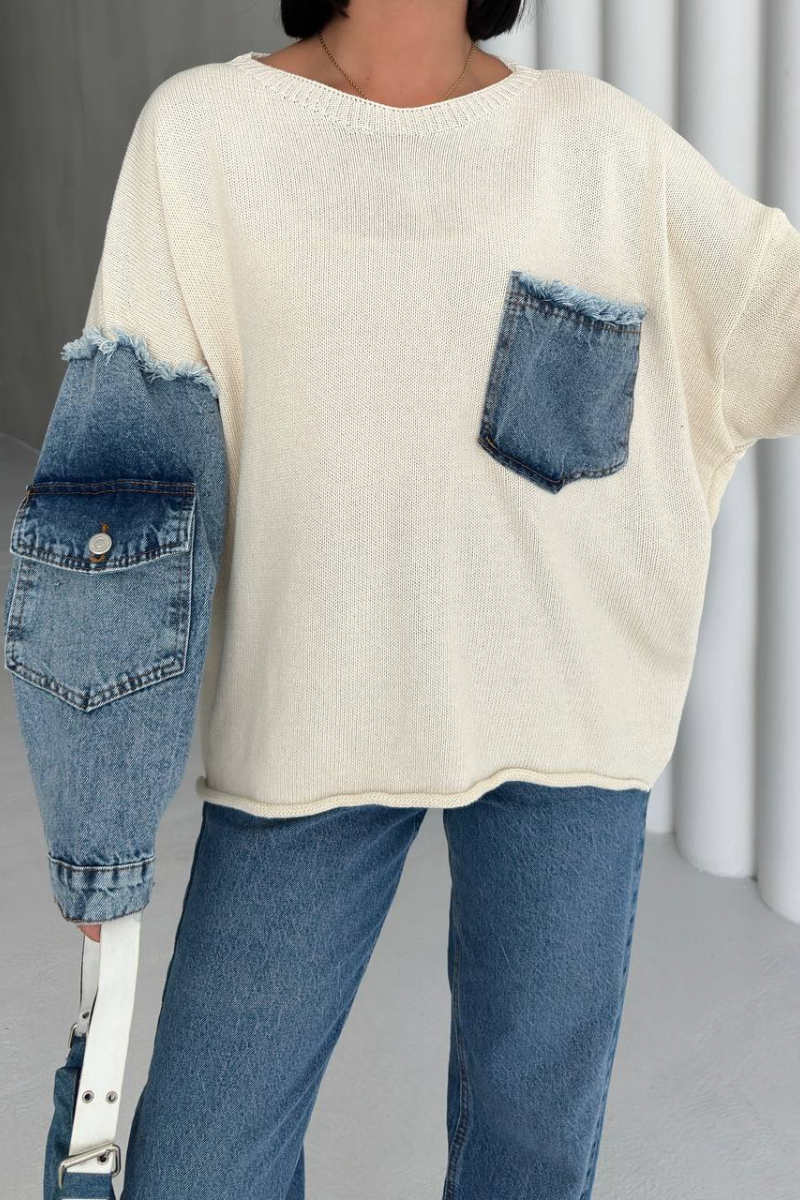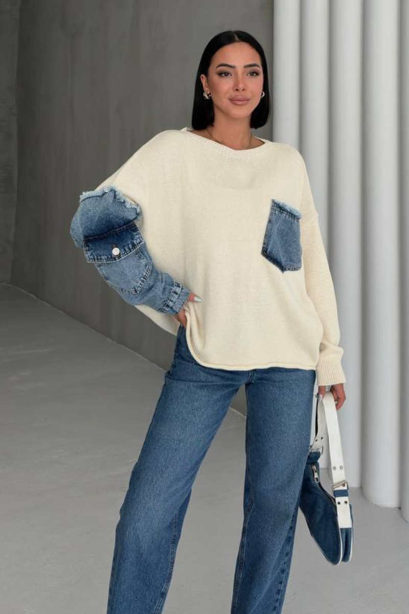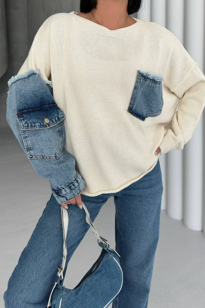 The Denim Mix Sweater combines the softness of knitwear with edgy denim accents, creating a unique statement piece.