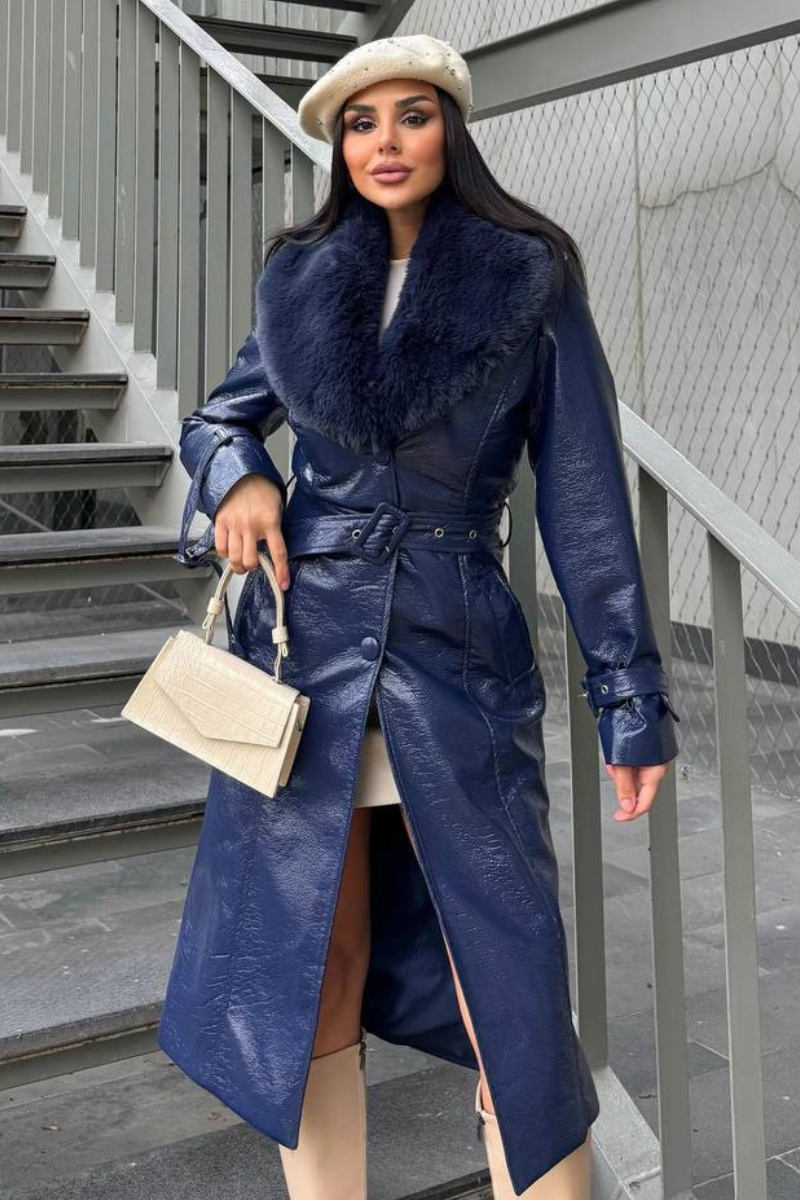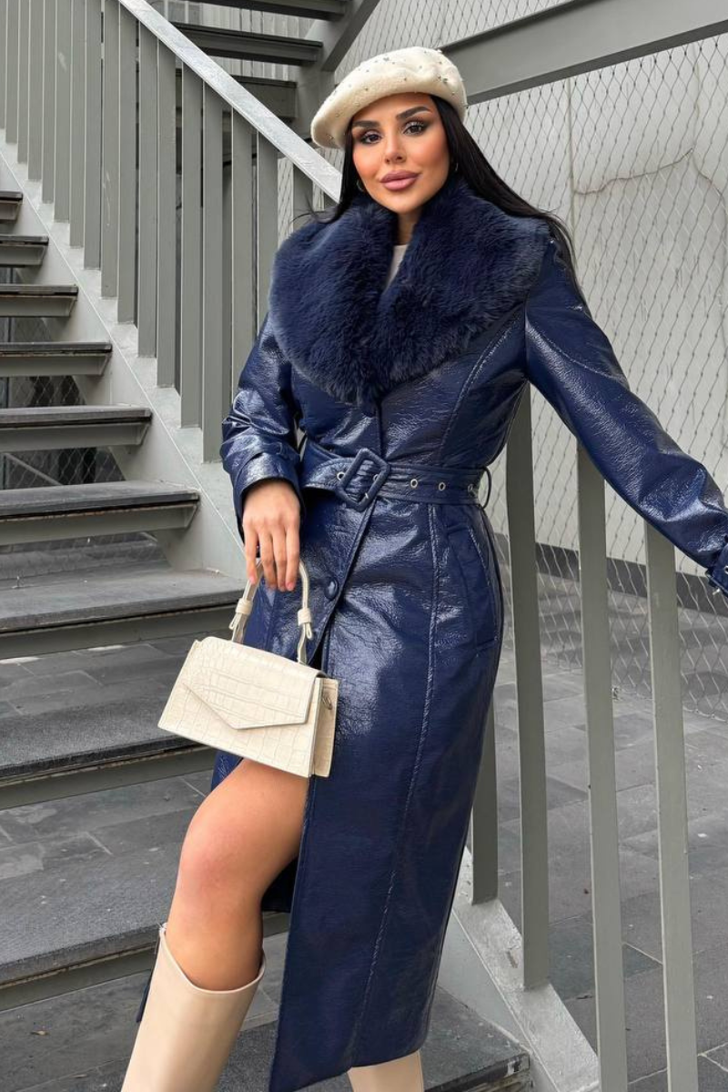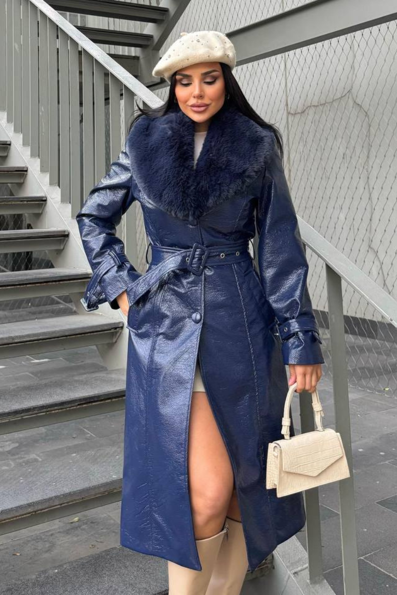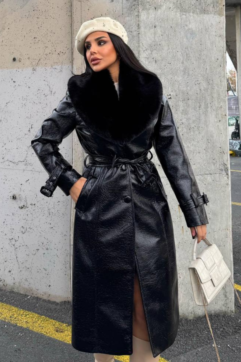 Chic patent leather winter coat featuring a glossy finish, plush faux-fur collar, and cozy warmth with a glamorous edge.