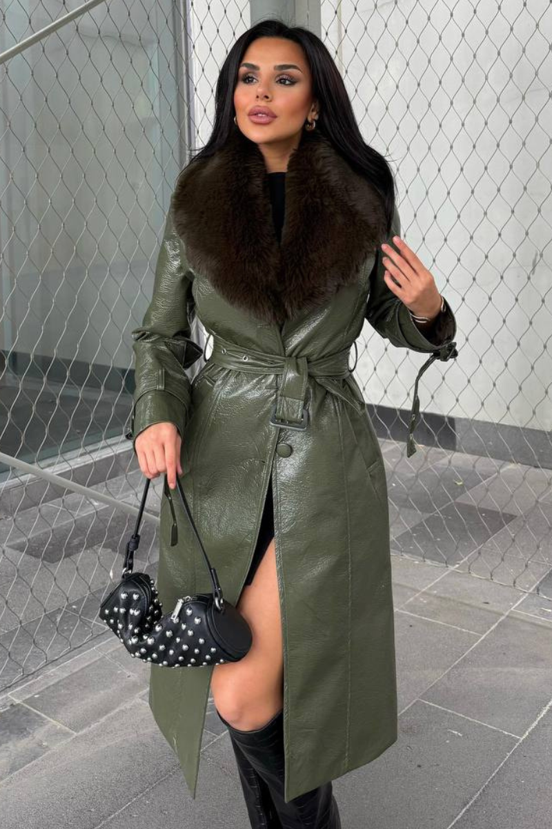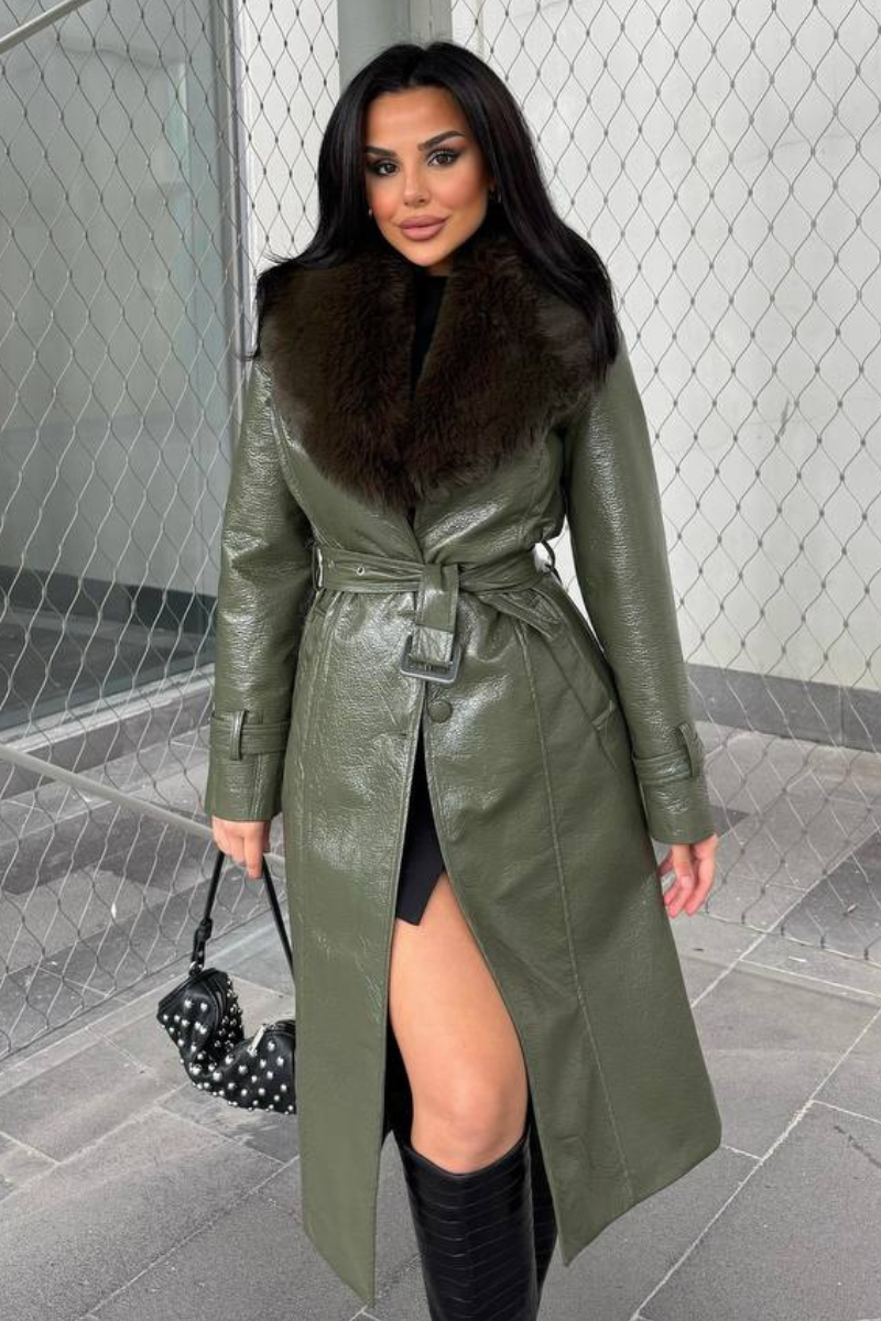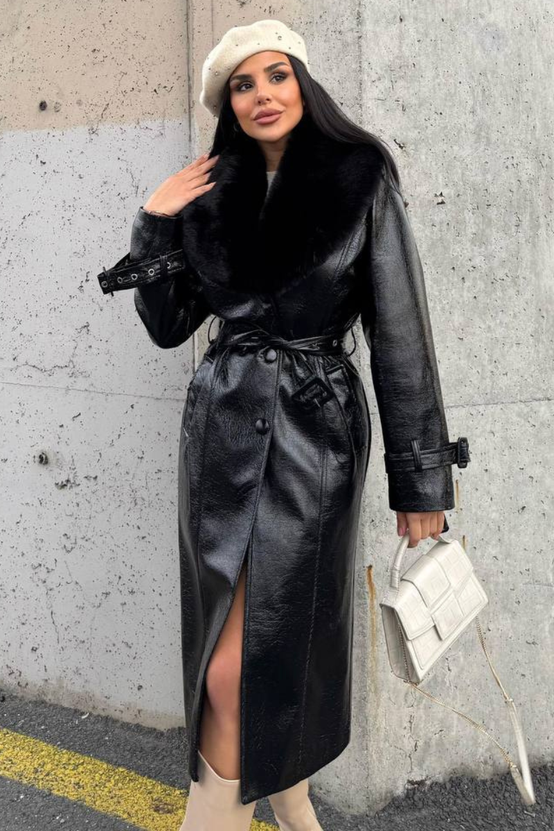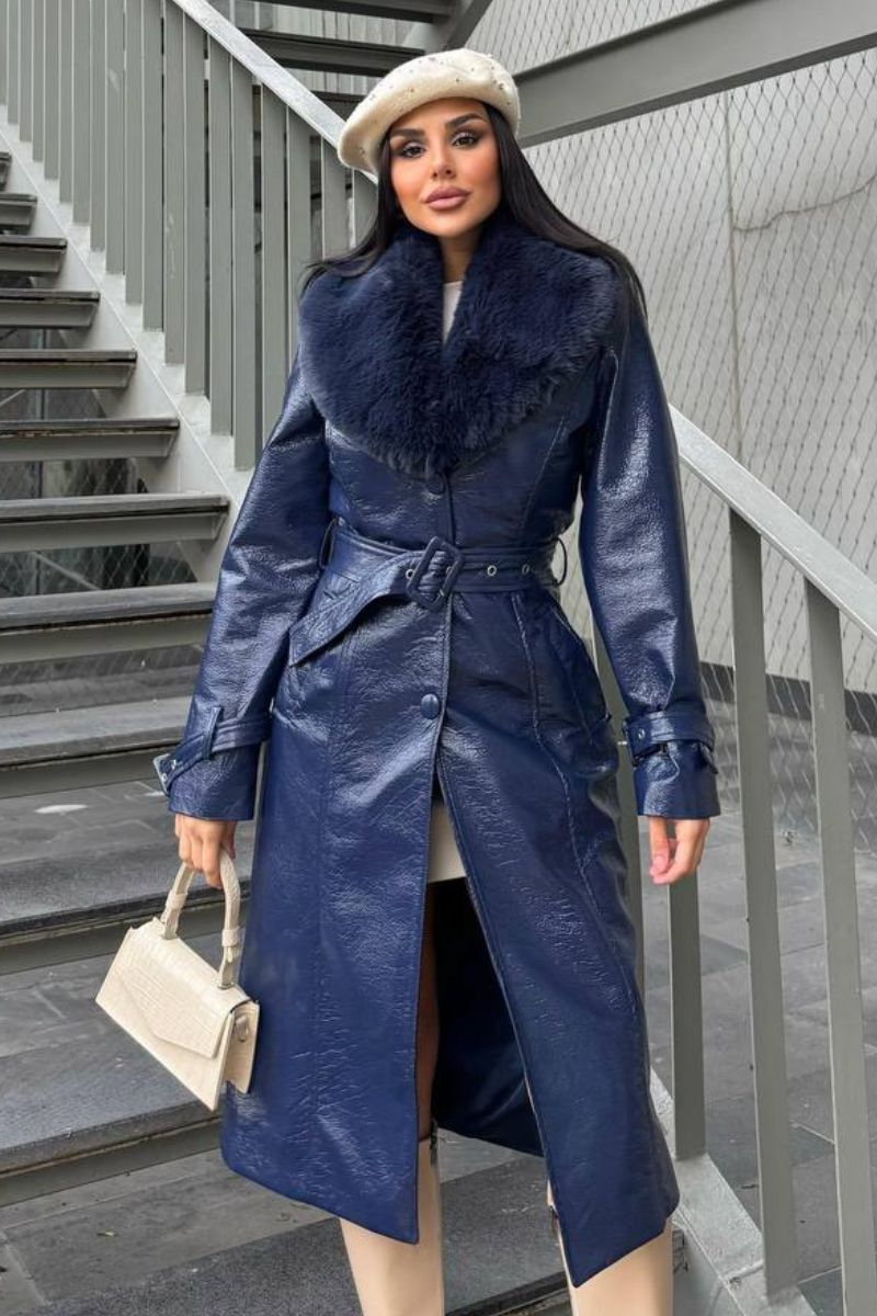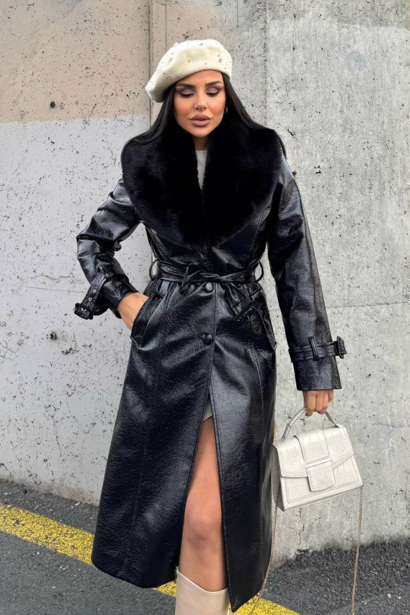 Chic patent leather winter coat featuring a glossy finish, plush faux-fur collar, and cozy warmth with a glamorous edge.
