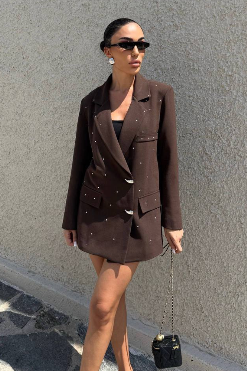A tailored single-breasted blazer with sparkling bling accents that bring instant glamour to any look.