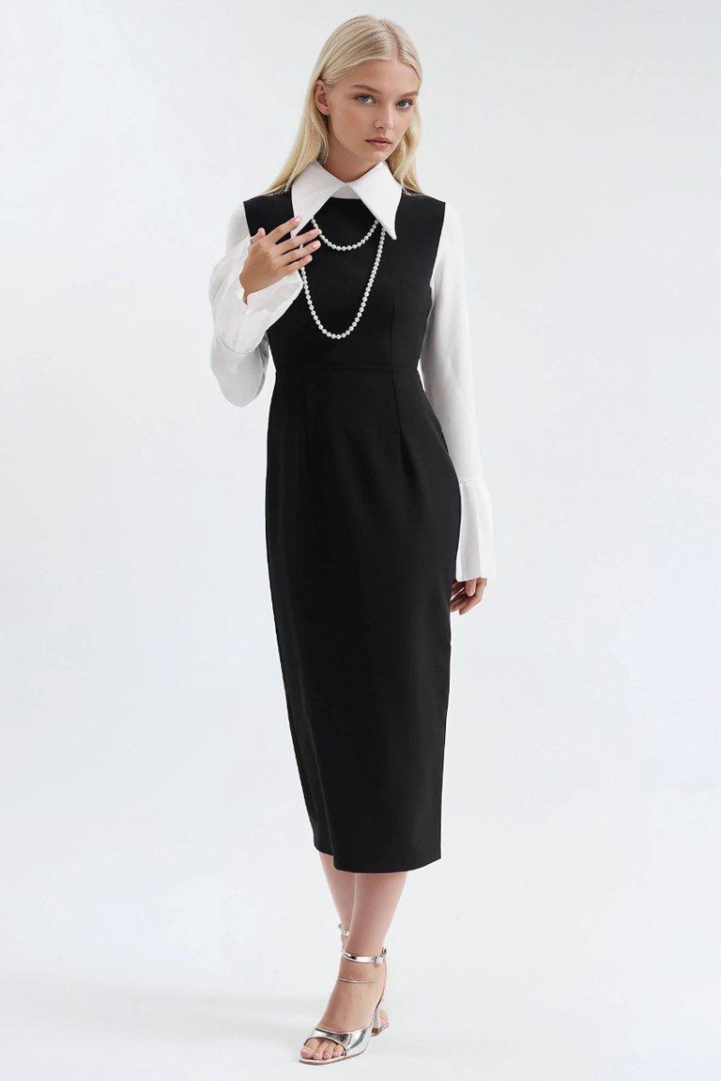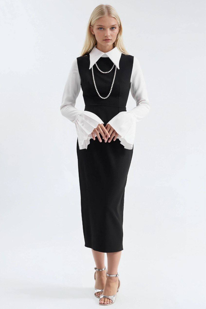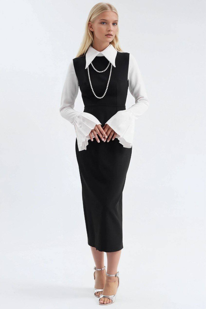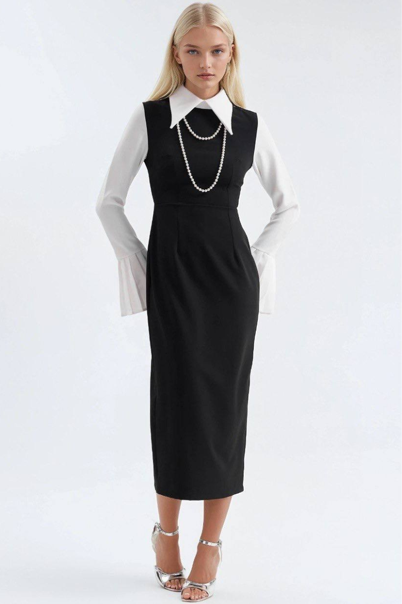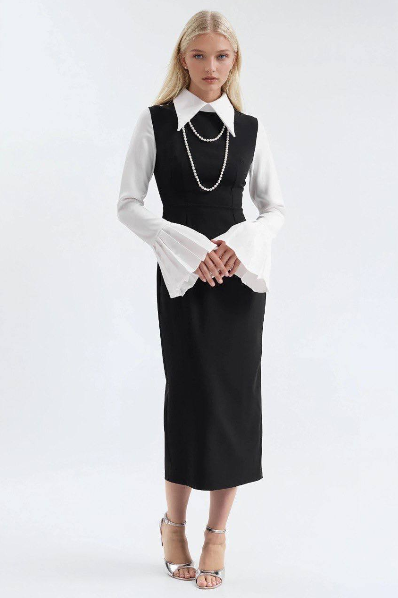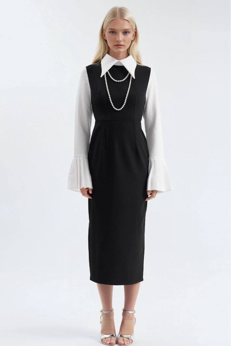 A sleek black midi dress designed with long sleeves and elegant flared cuffs for a refined, feminine touch.