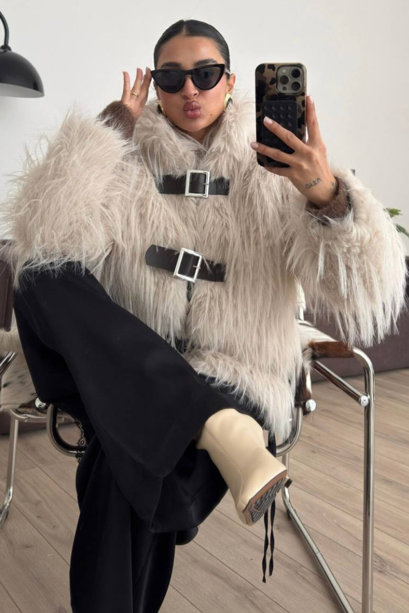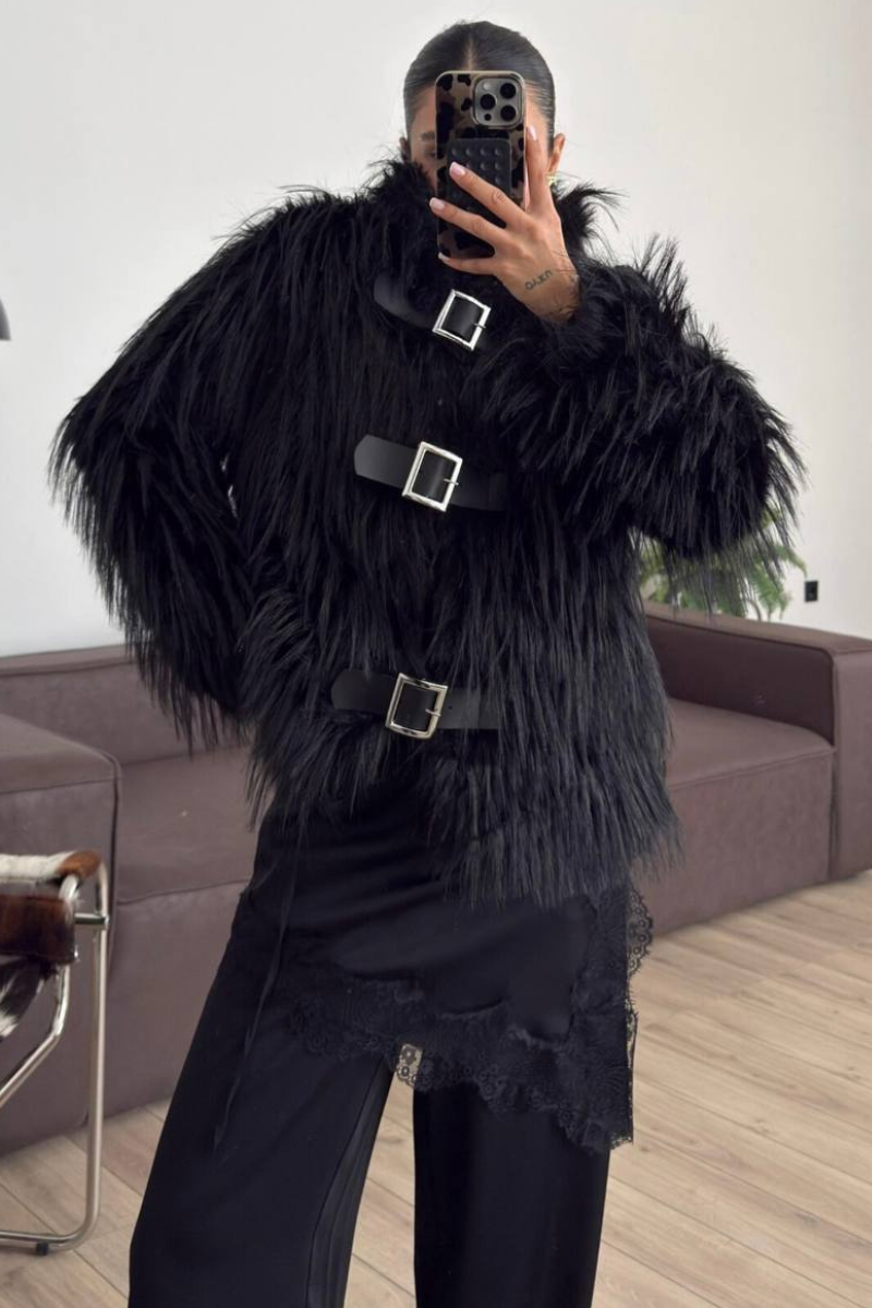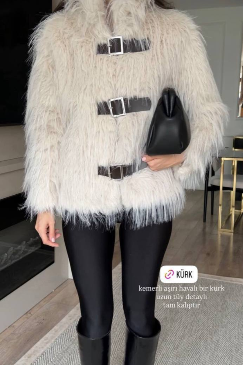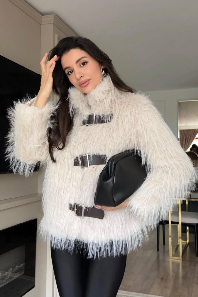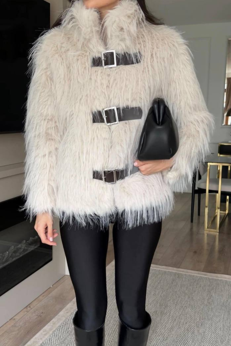 A luxurious faux fur coat designed with belted accent for a polished silhouette.