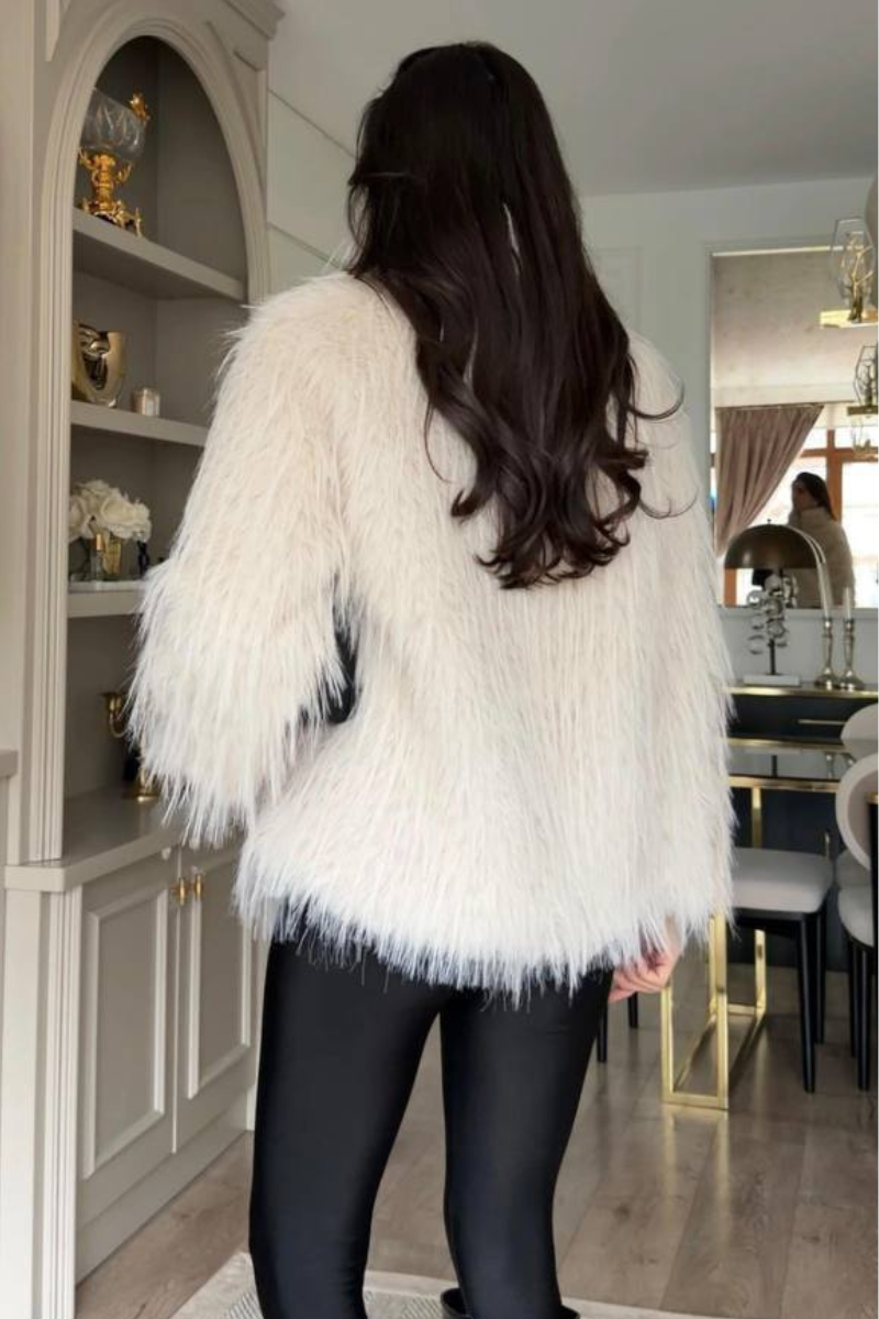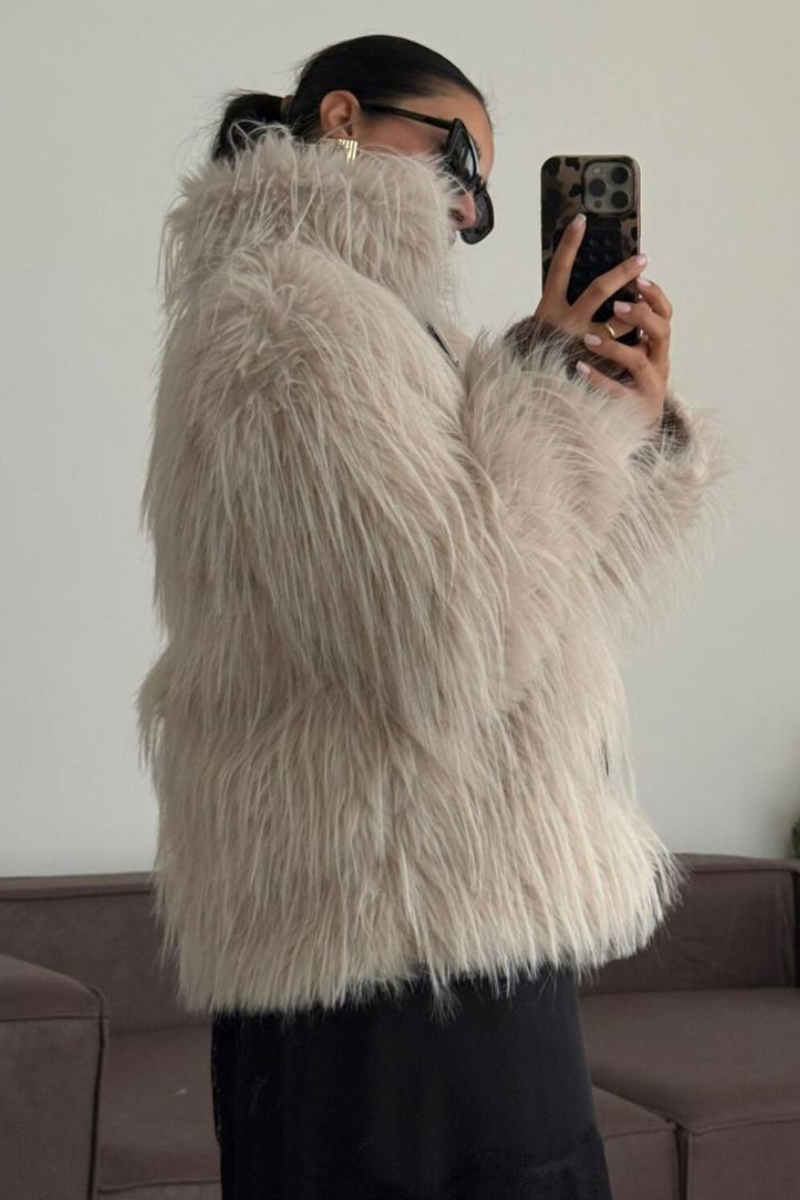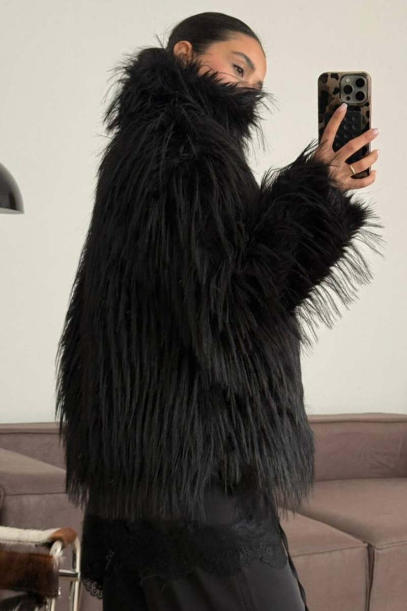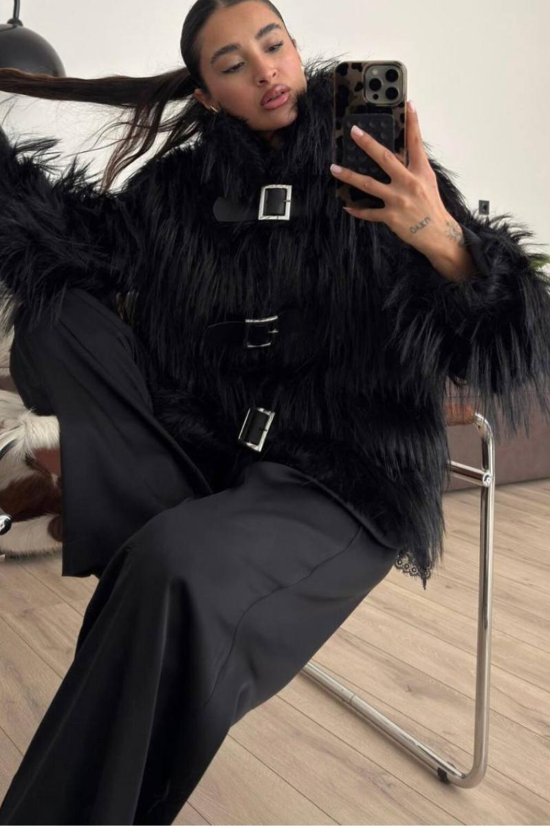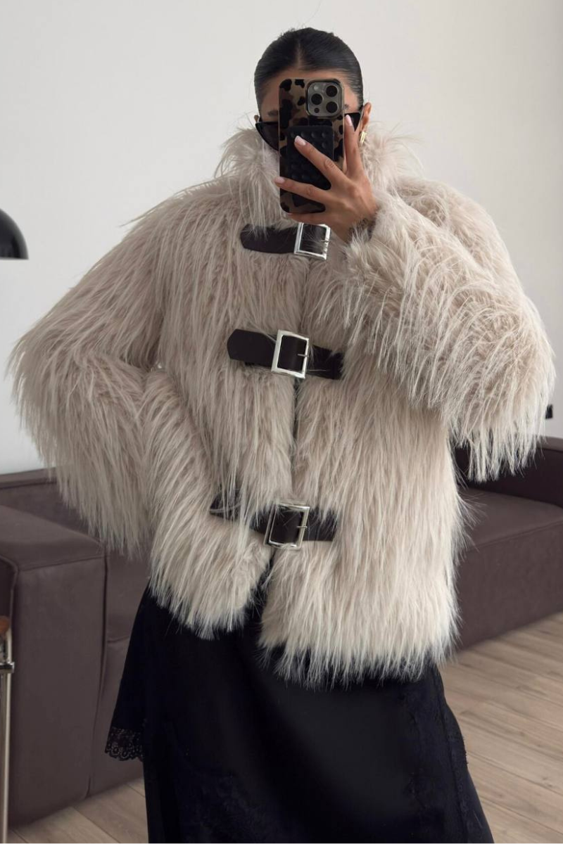 A luxurious faux fur coat designed with belted accent for a polished silhouette.