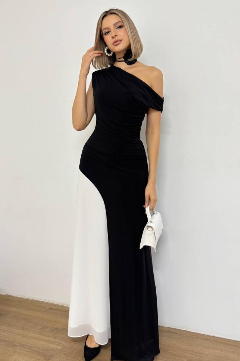 Glamorous maxi evening gown with a flowing silhouette, elegant detailing, and a flattering fit for special occasions.