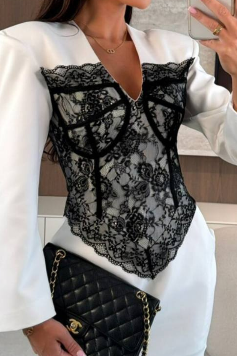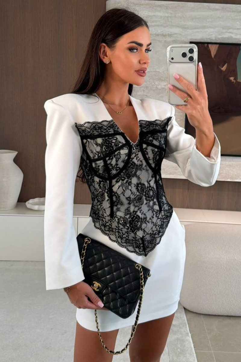 A chic blazer-style dress finished with delicate lace trim for a feminine, elegant touch.