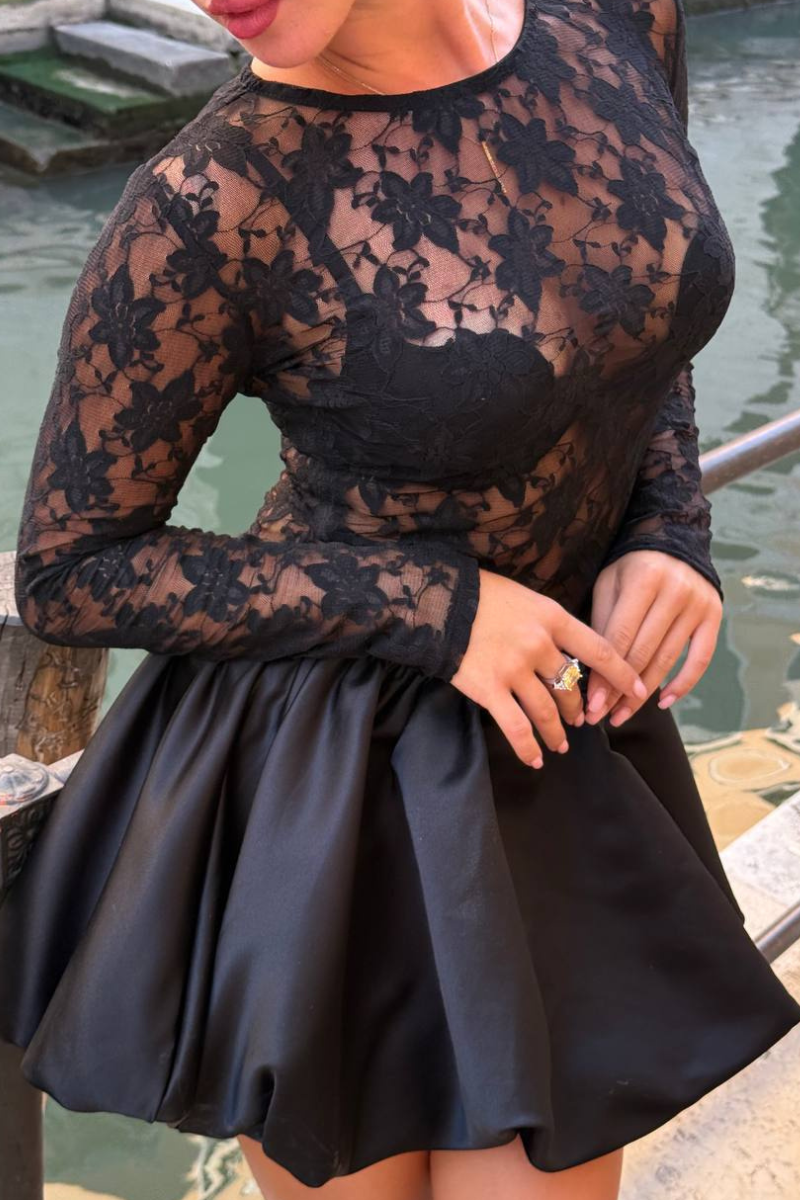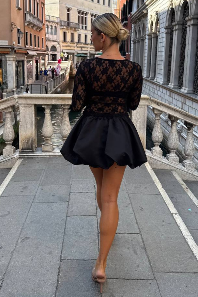 A chic mini dress featuring delicate lace accents for a feminine, elegant look.