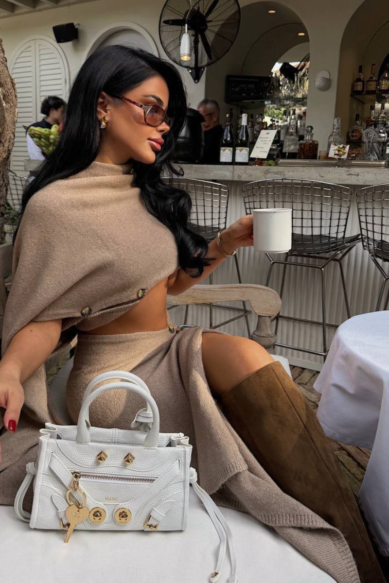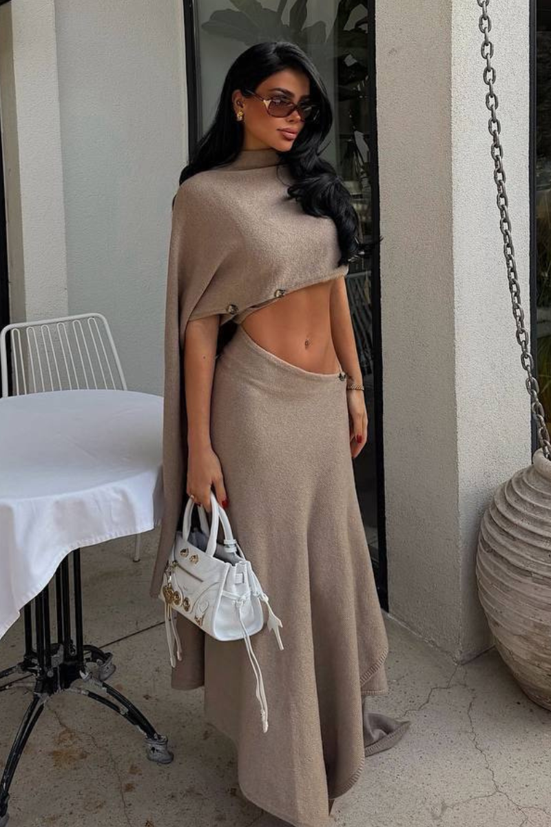 A stylish cropped top paired with a chic asymmetric skirt, designed for a modern and flattering silhouette.