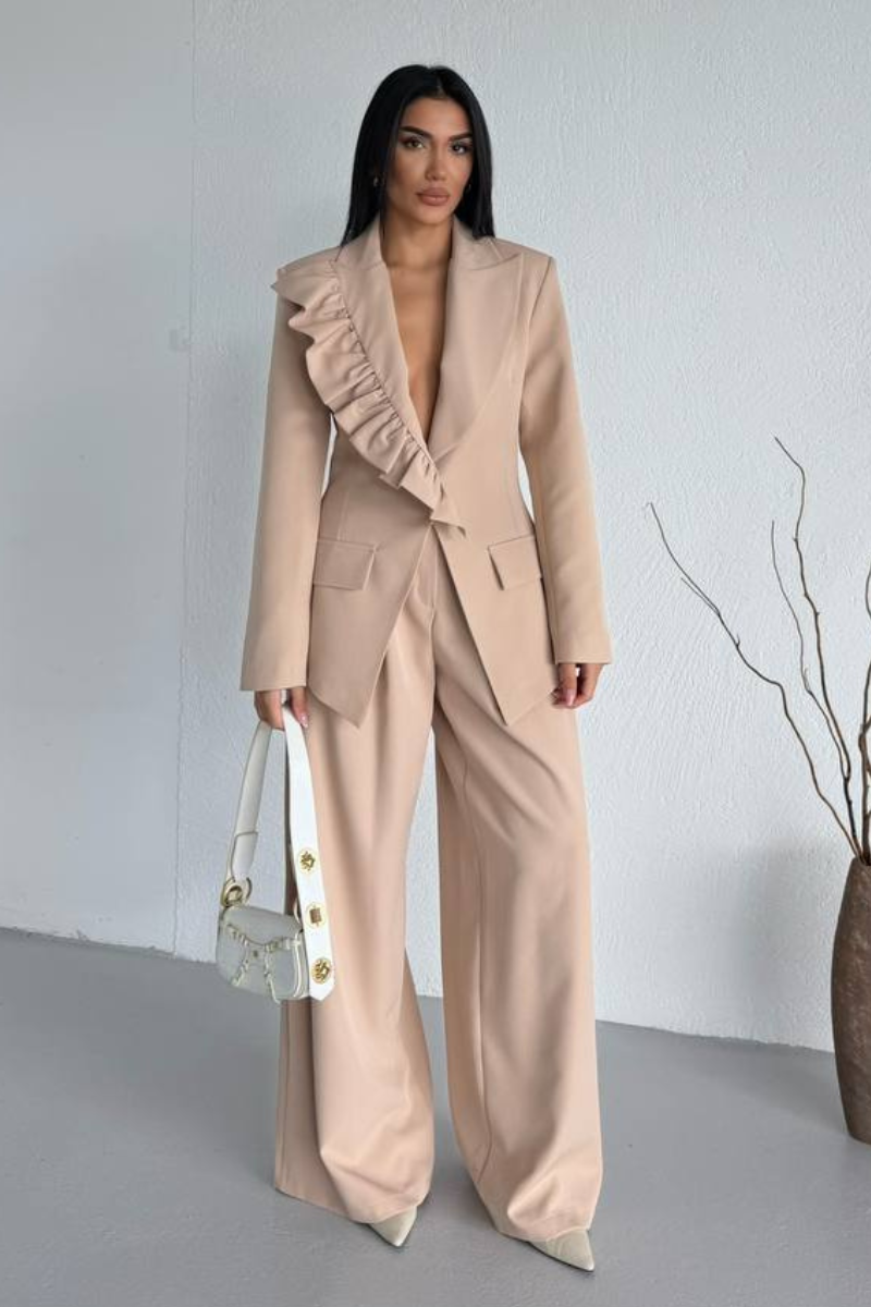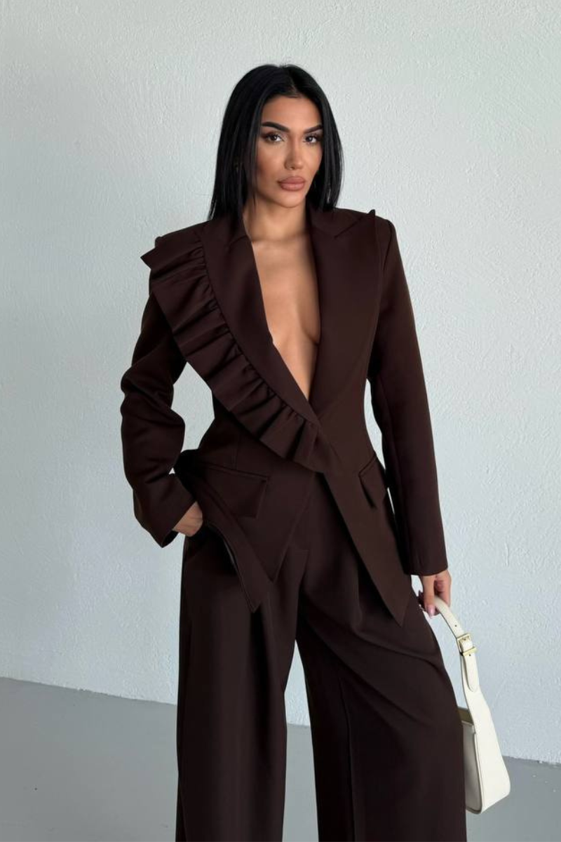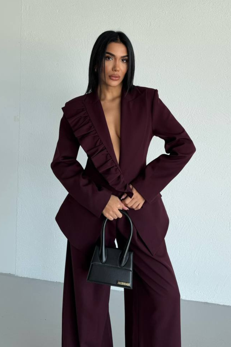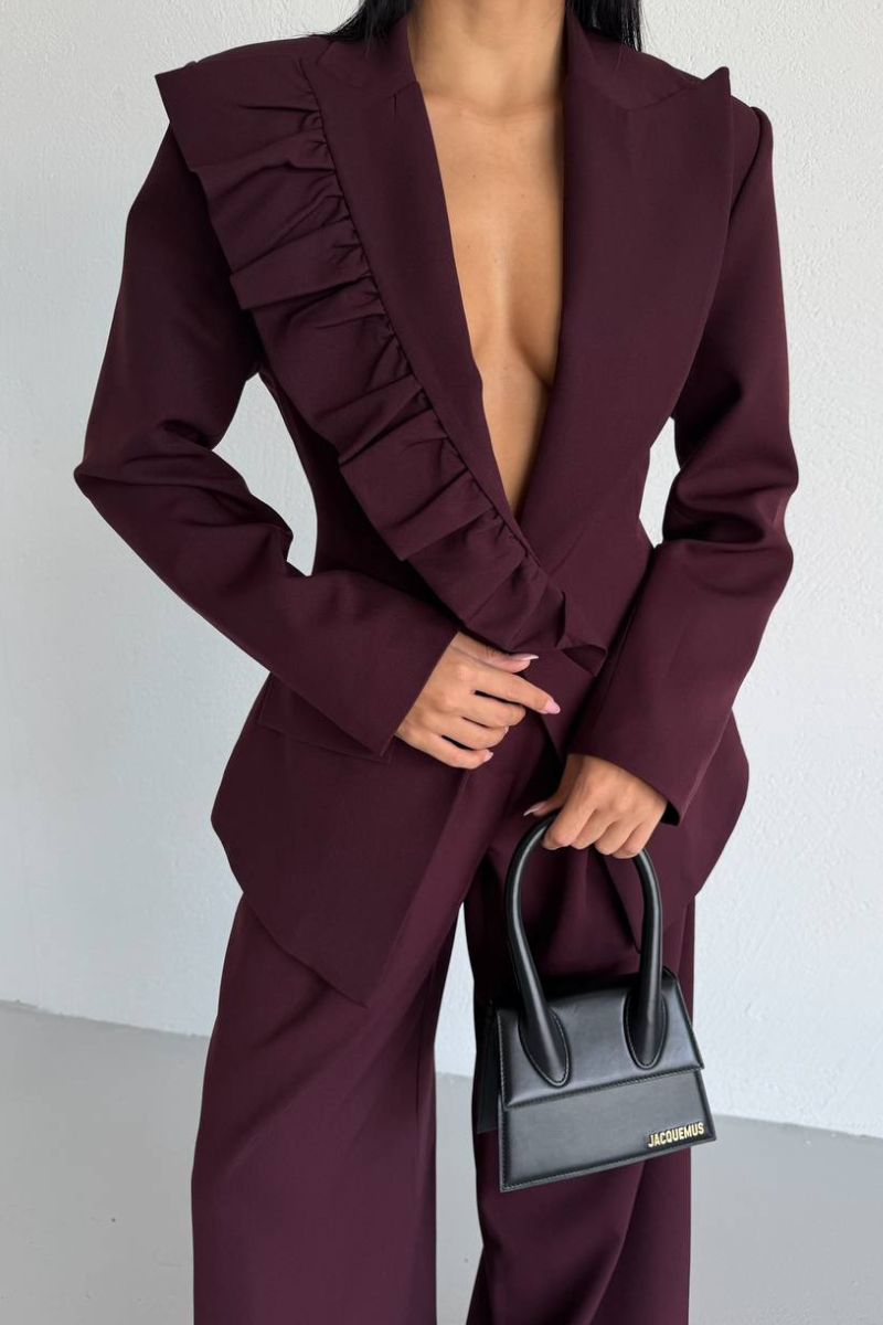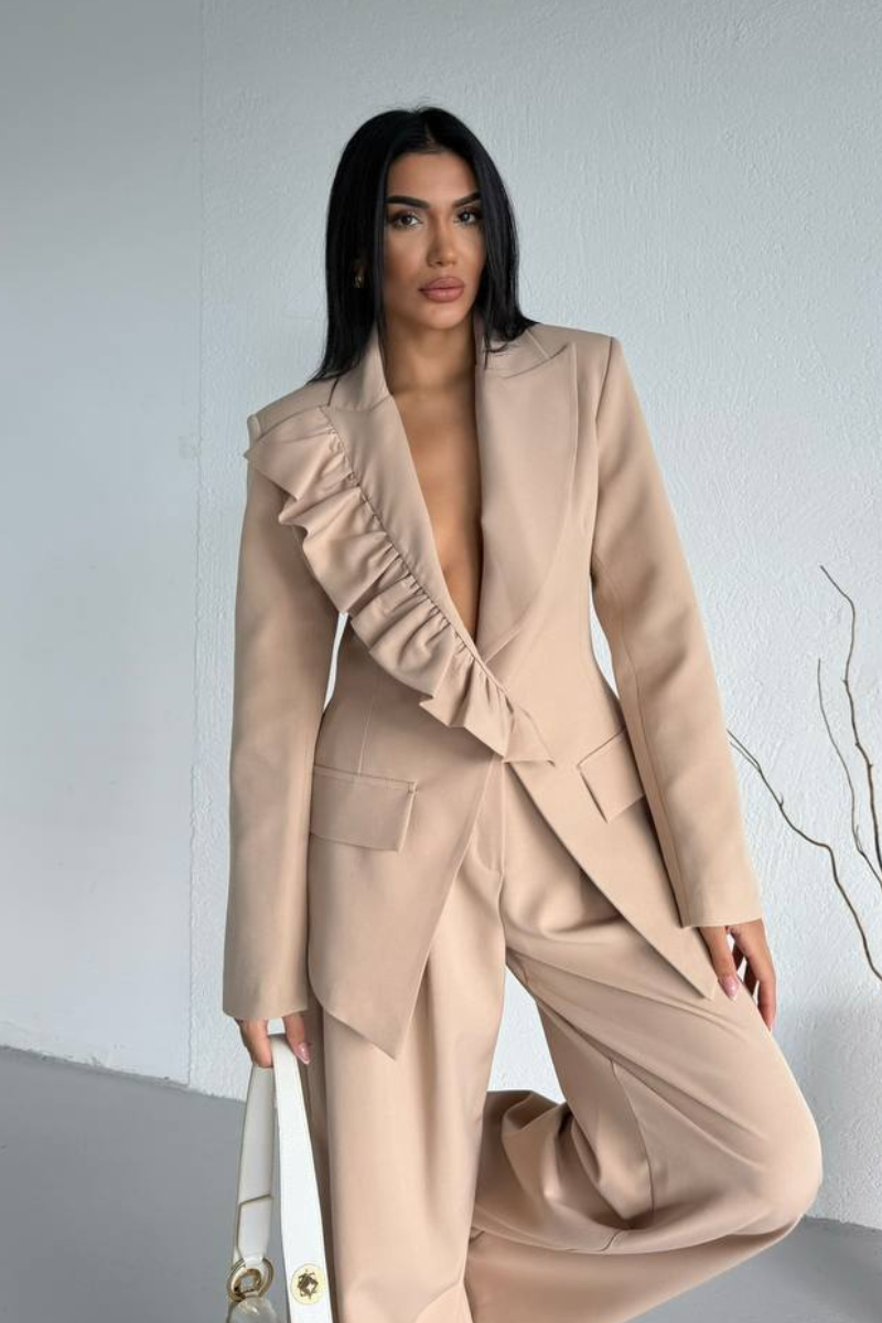 A tailored blazer and pants set finished with feminine ruffle details for a chic, polished look.