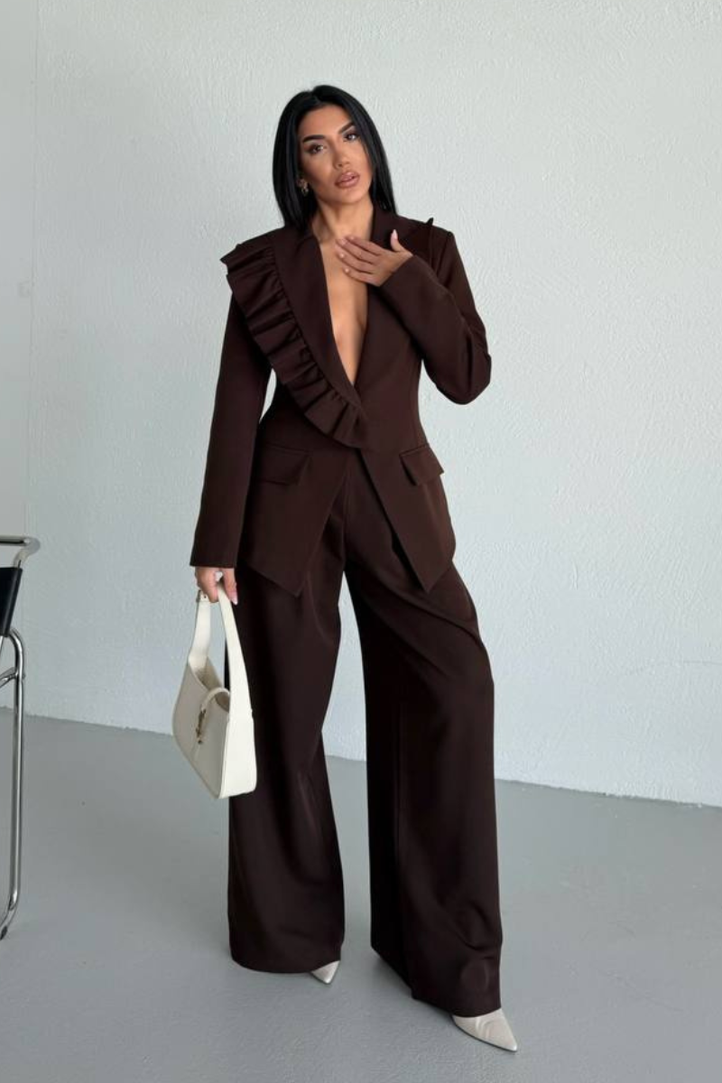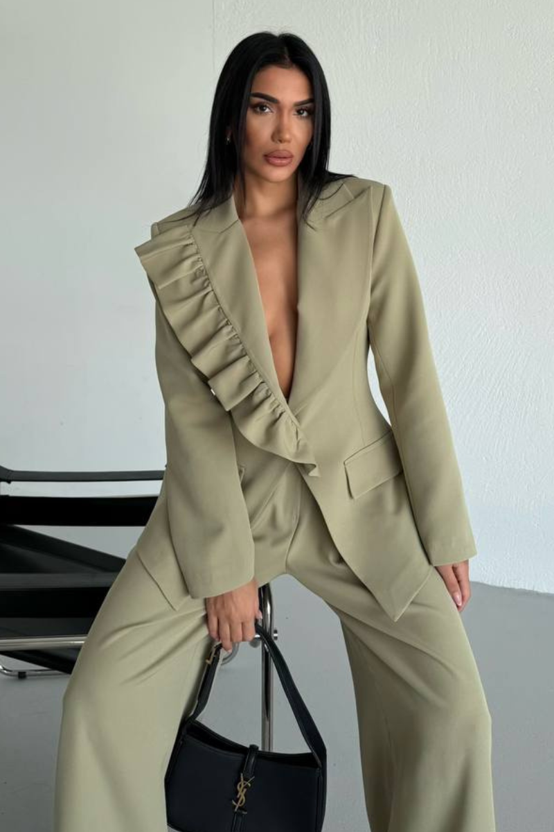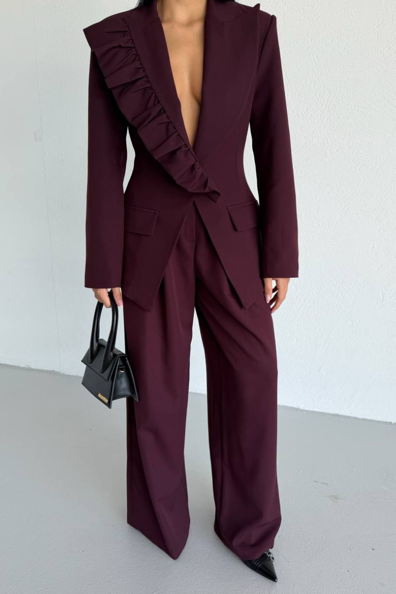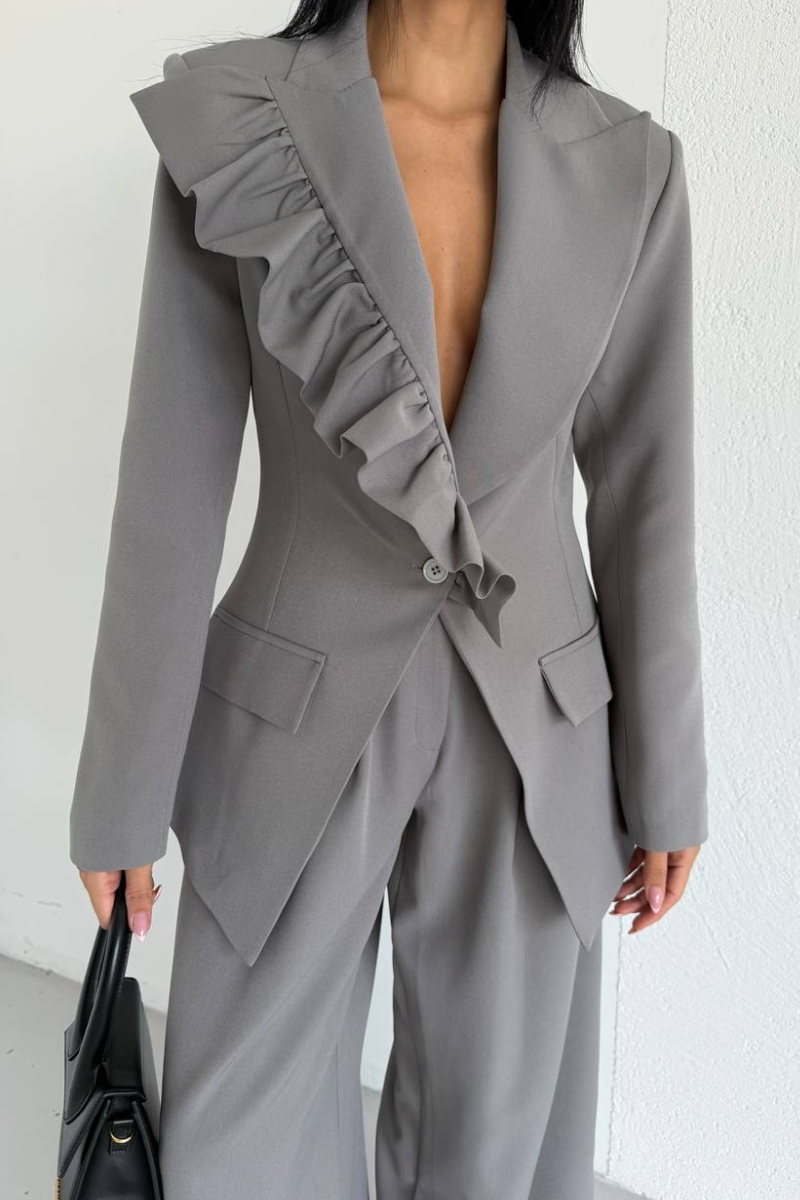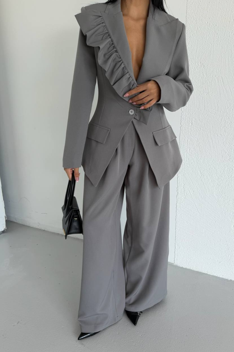 A tailored blazer and pants set finished with feminine ruffle details for a chic, polished look.