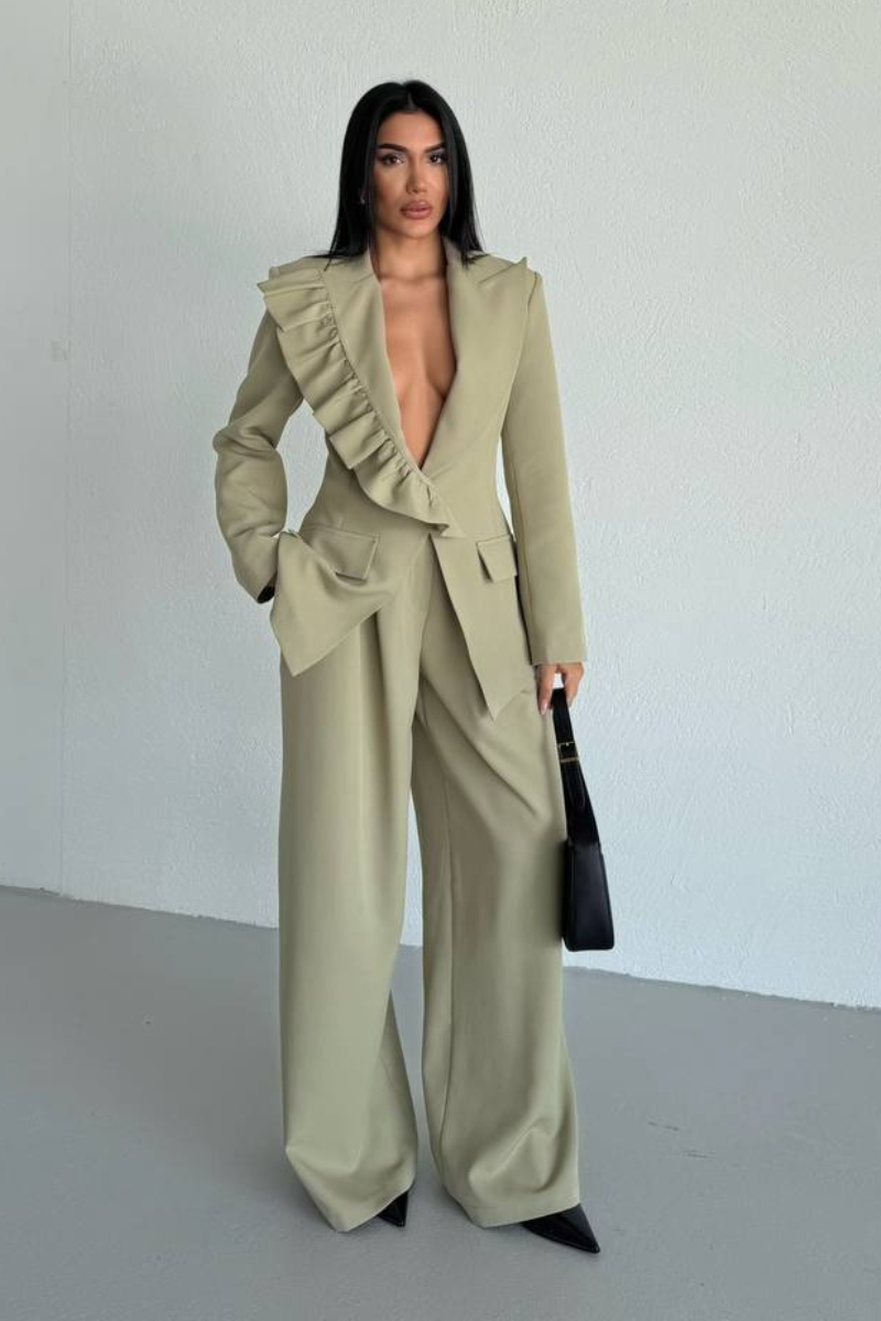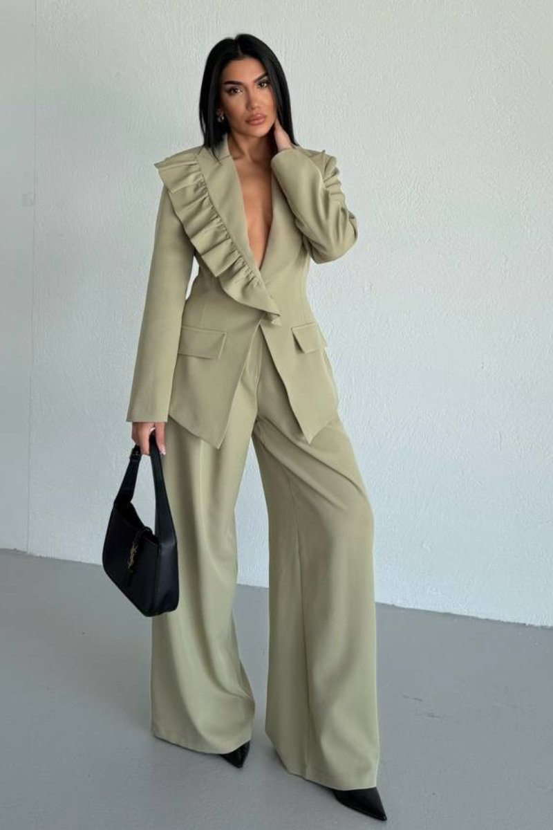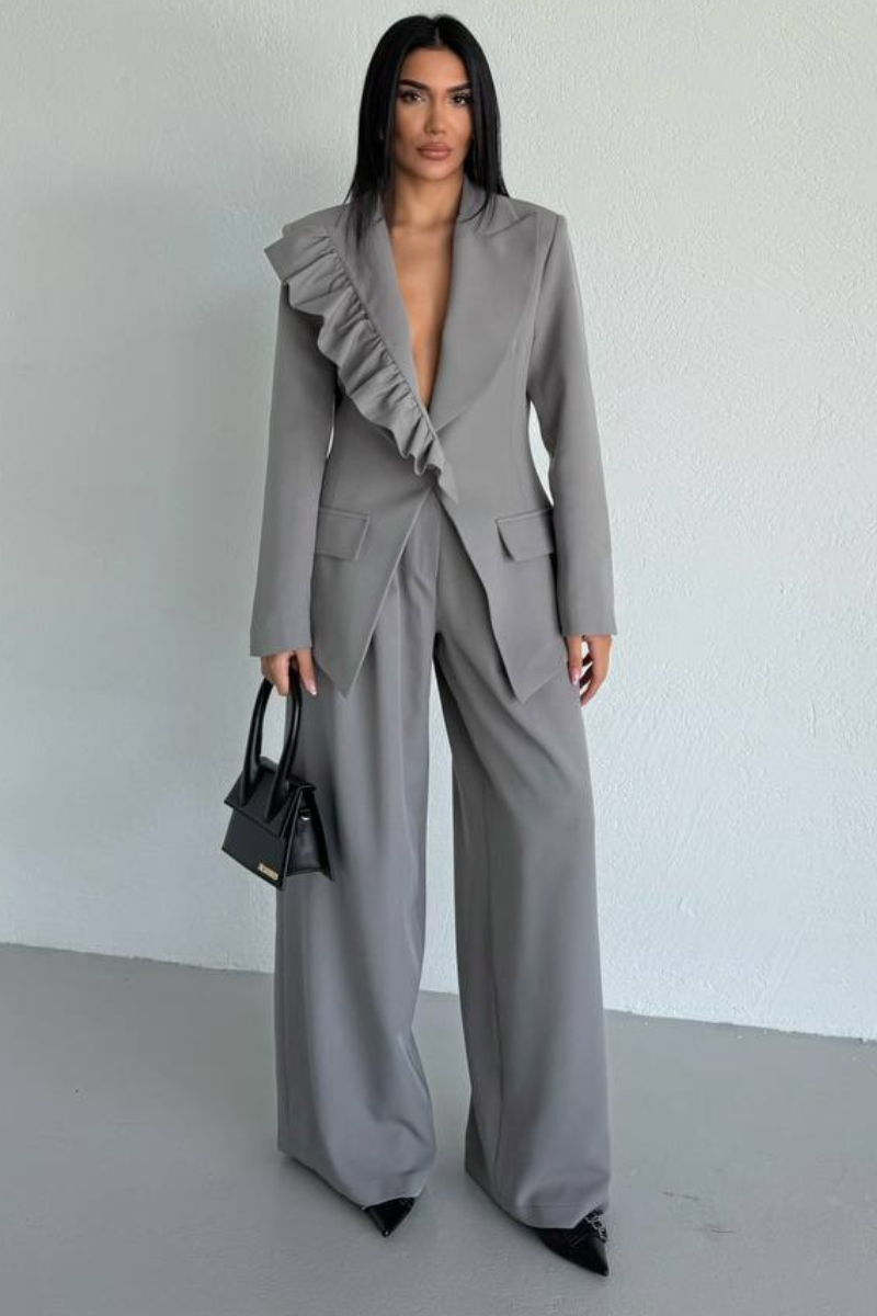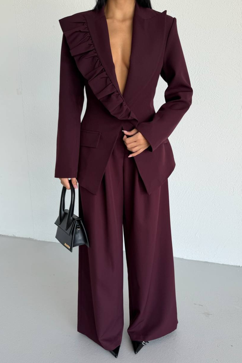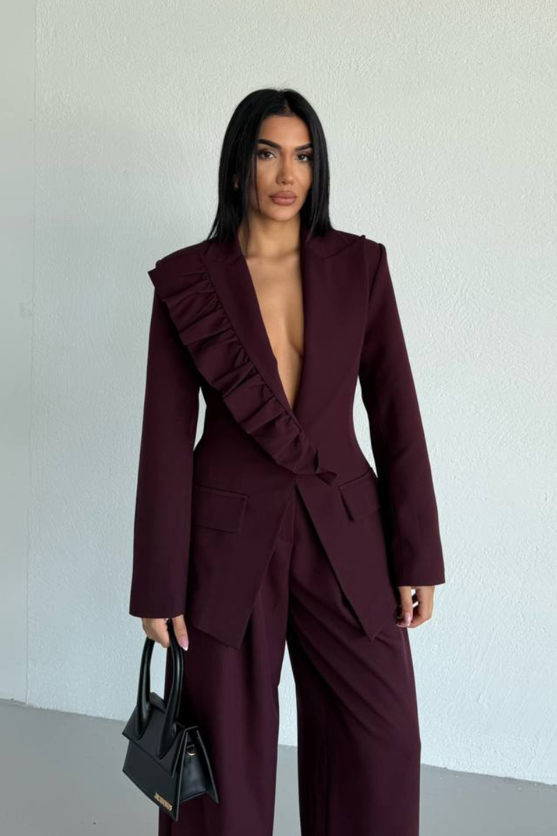 A tailored blazer and pants set finished with feminine ruffle details for a chic, polished look.
