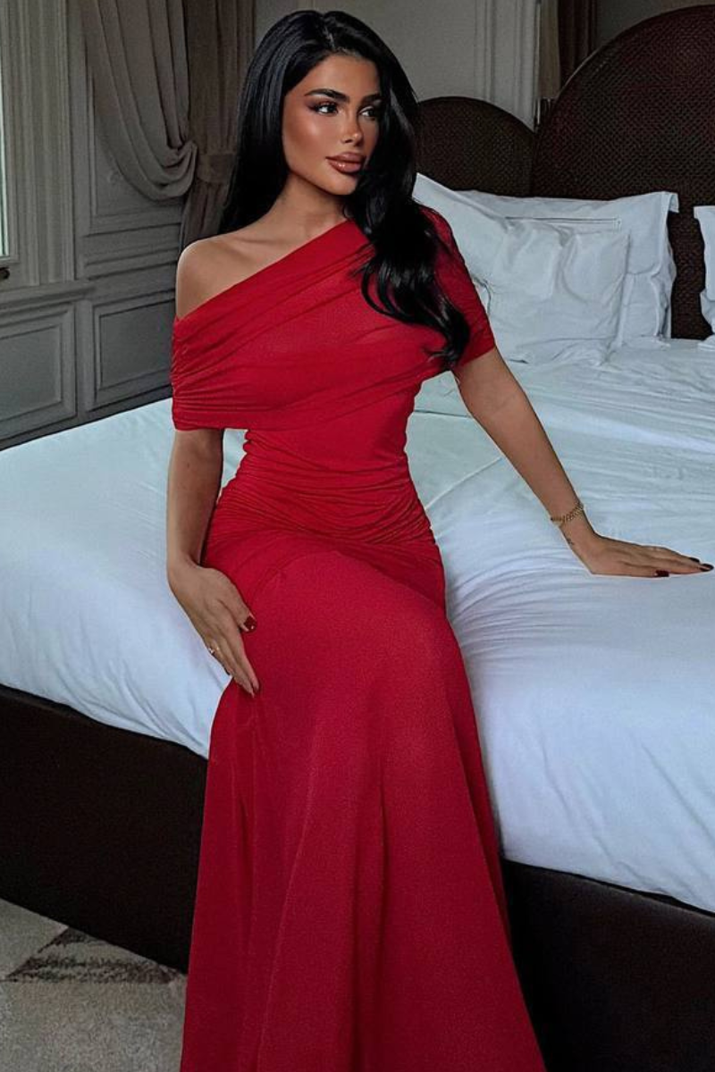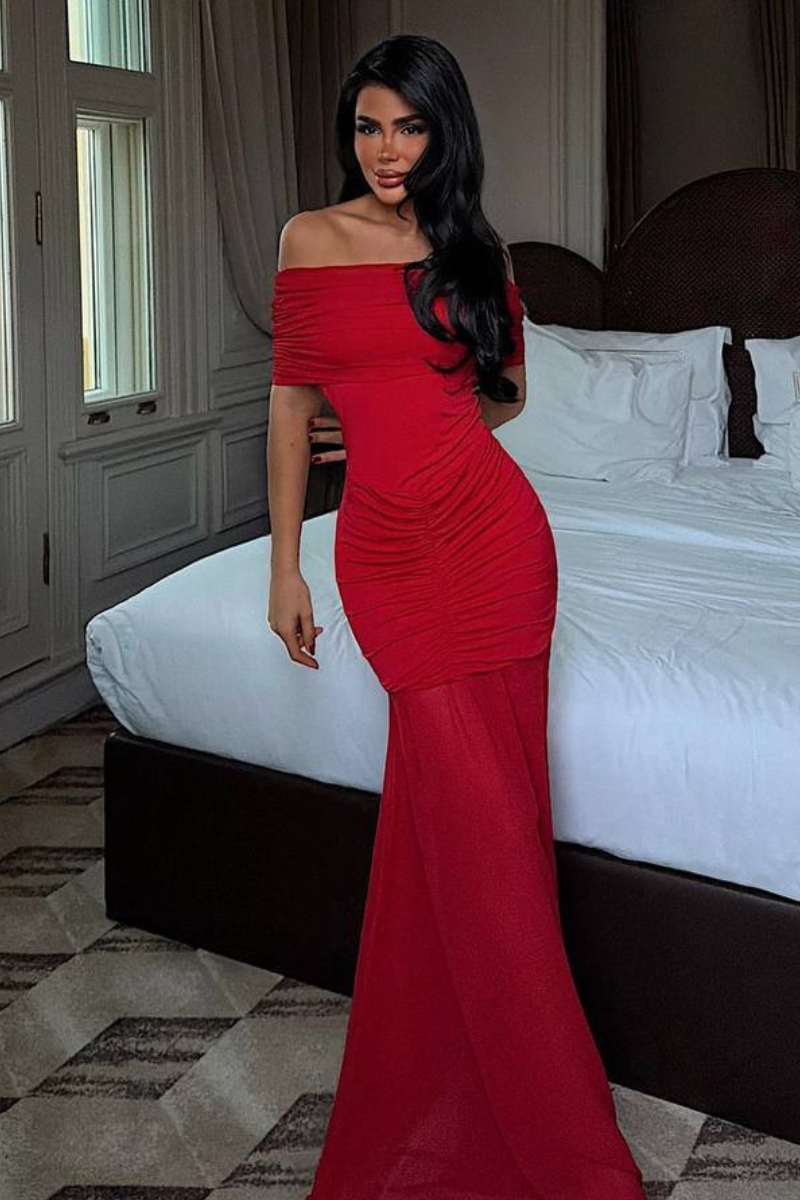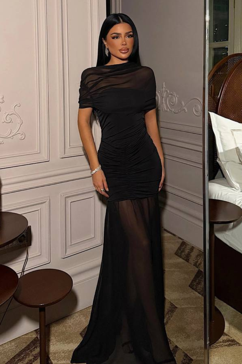 An elegant floor-length dress featuring delicate sheer accents for a soft, sophisticated touch.