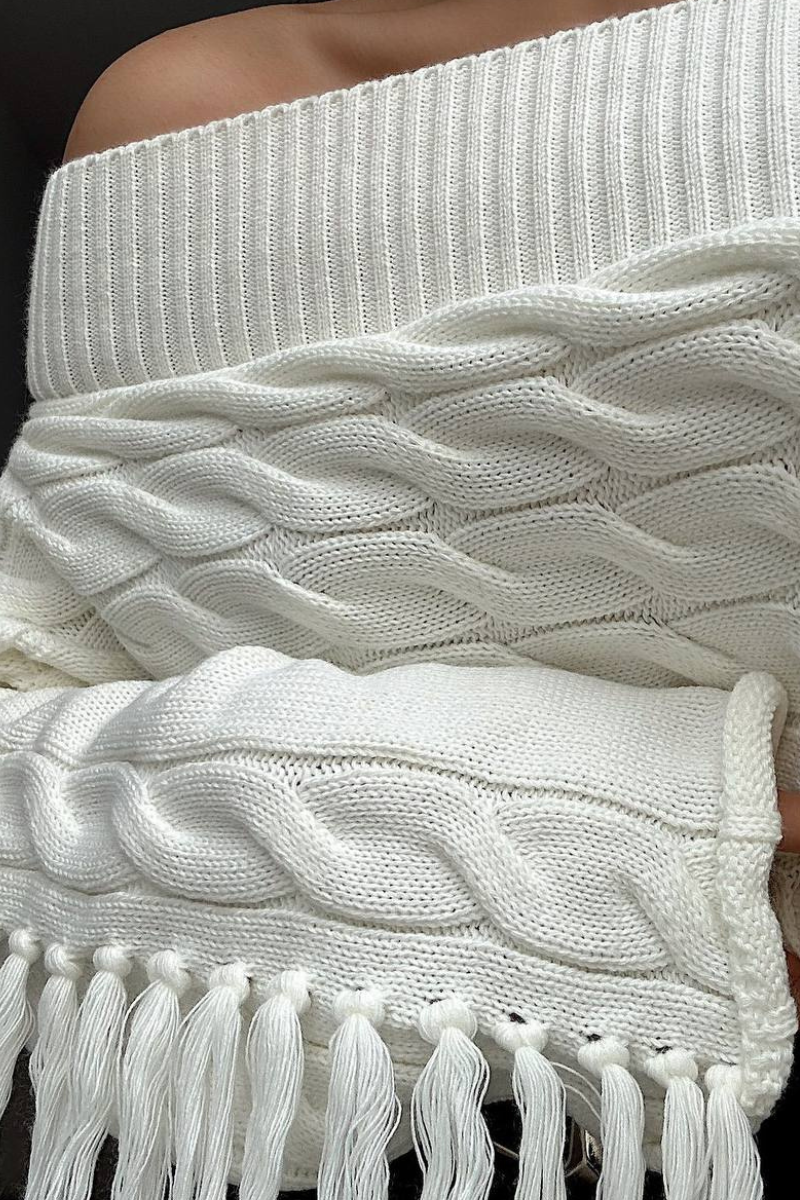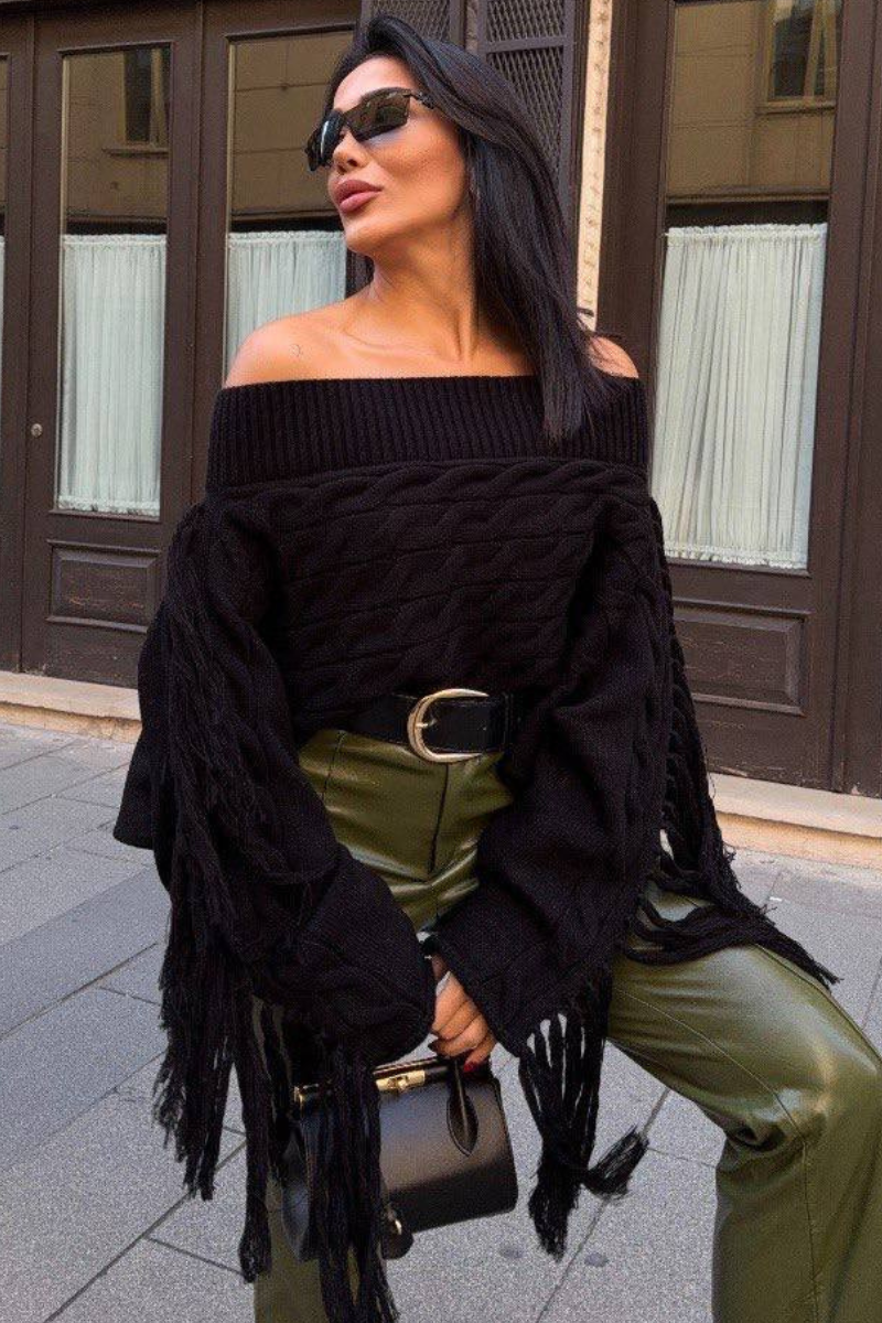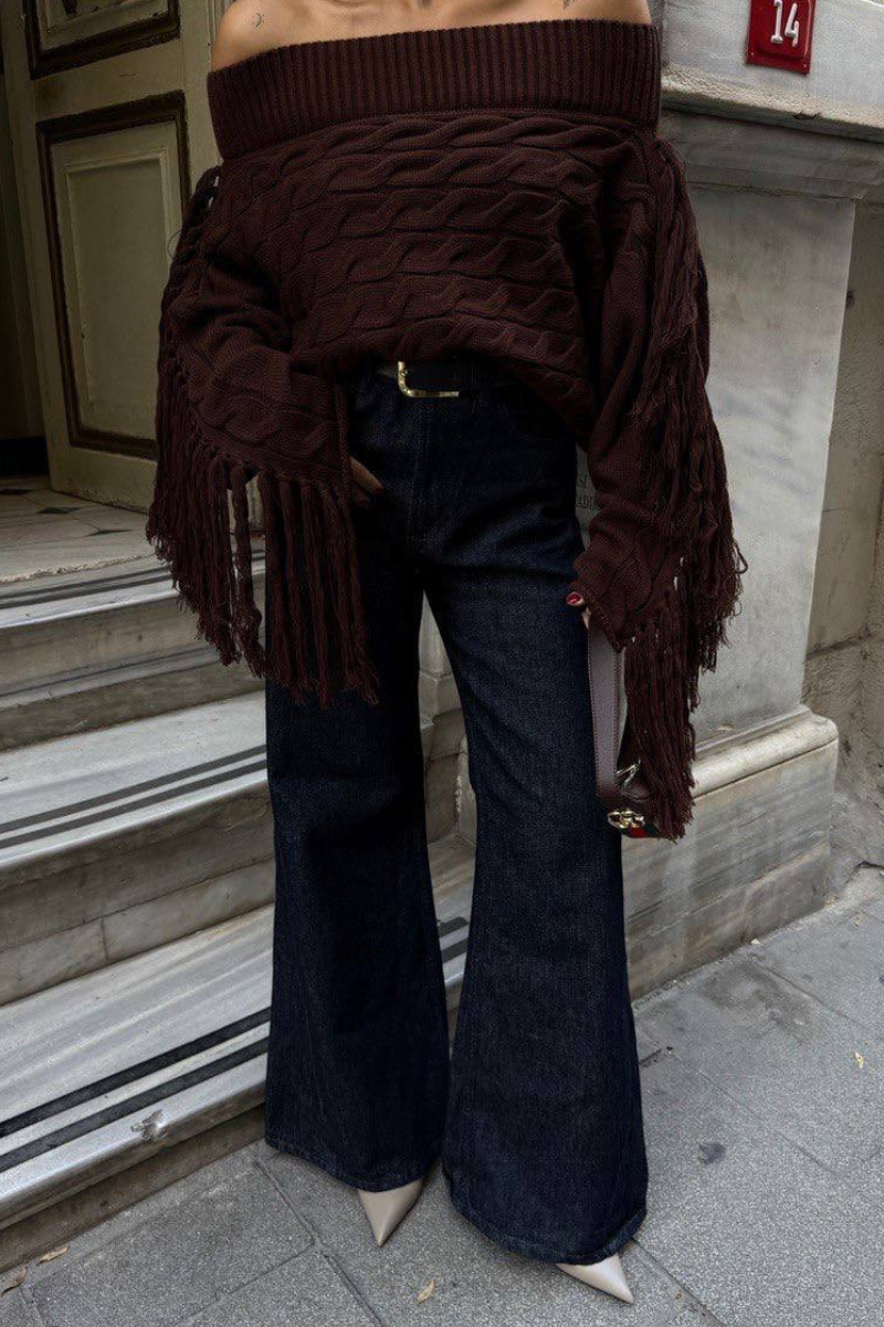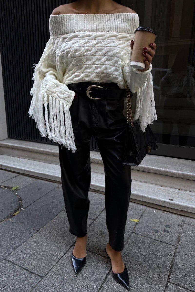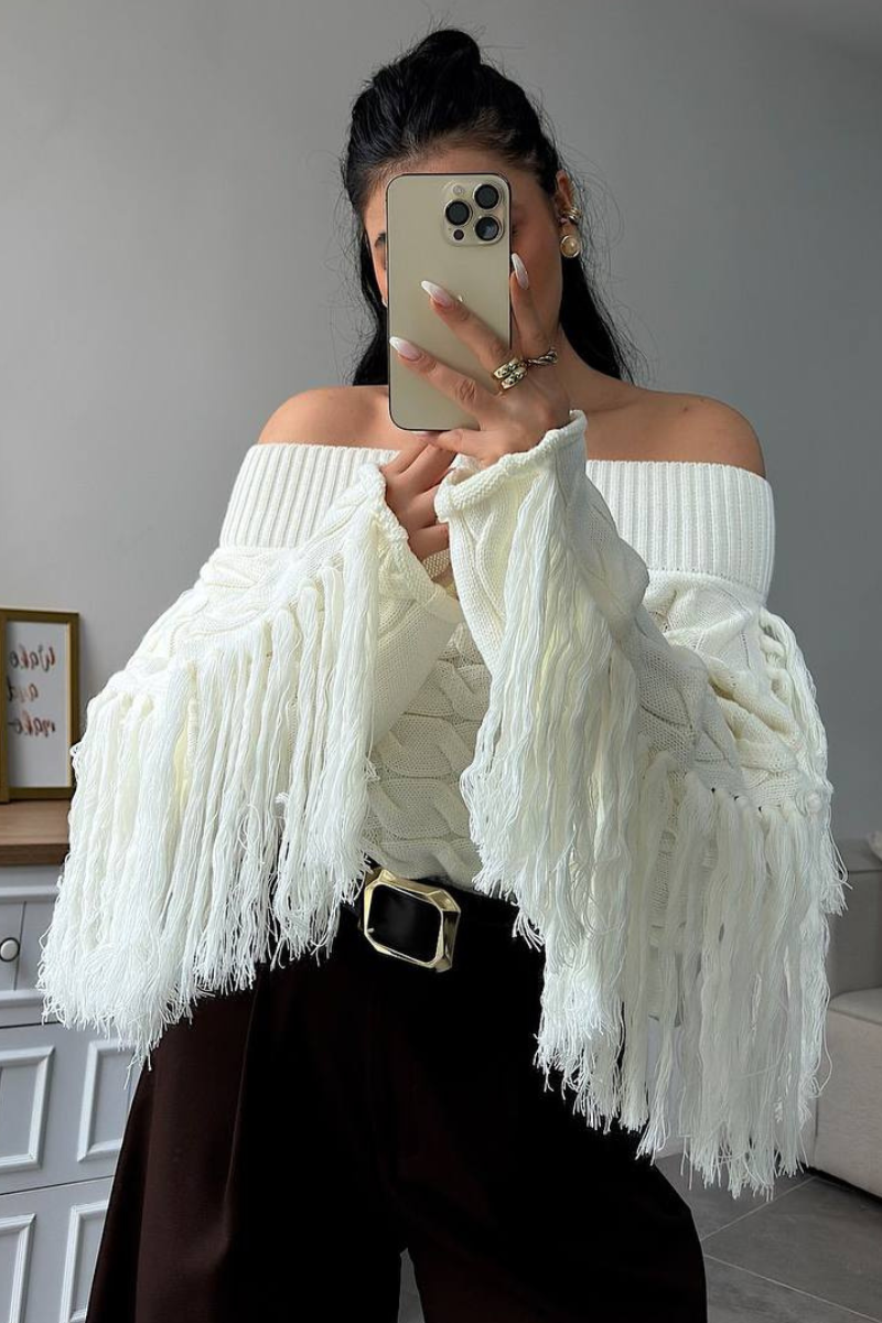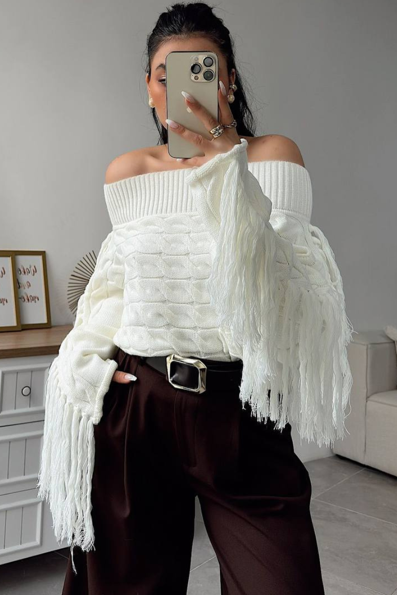 Soft knit meets playful style — this off-shoulder sweater with tassel details adds a chic, relaxed vibe to any outfit.