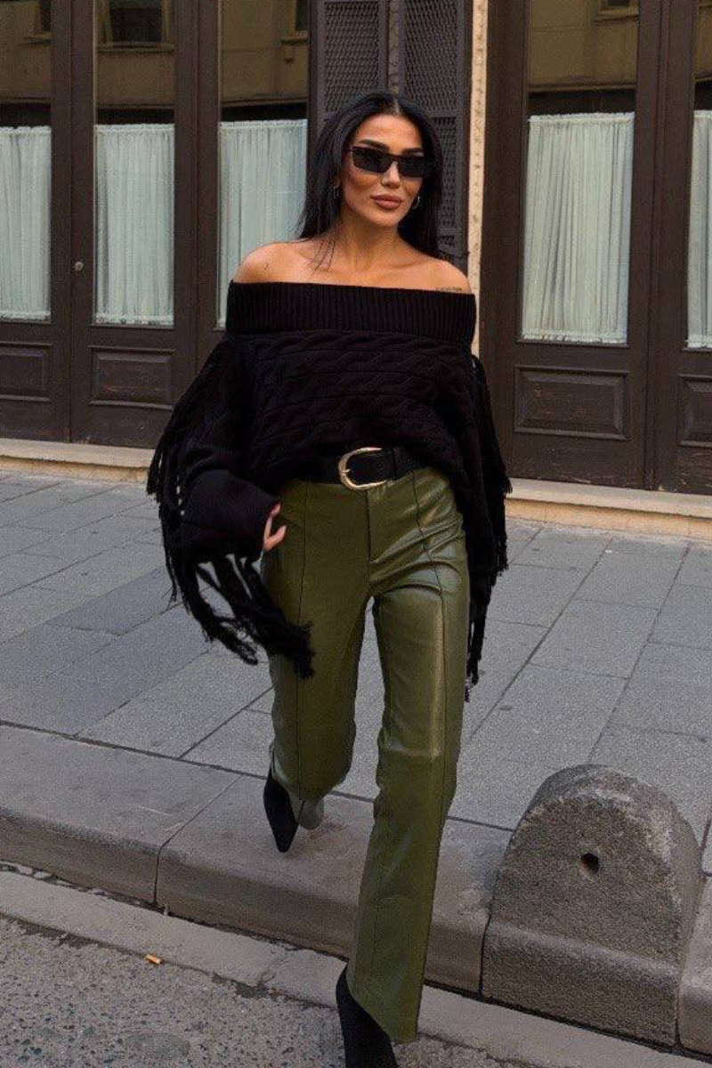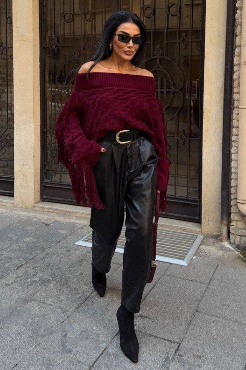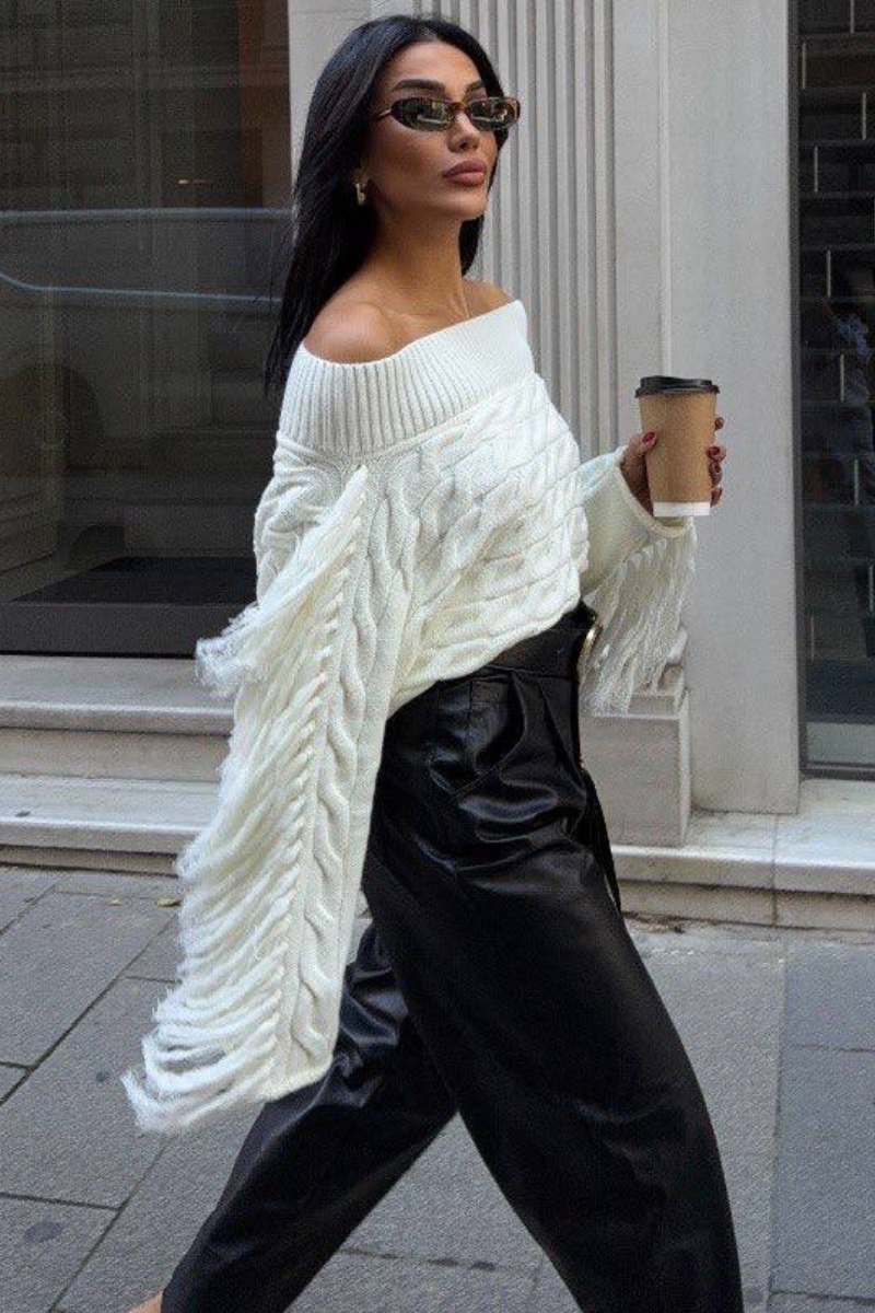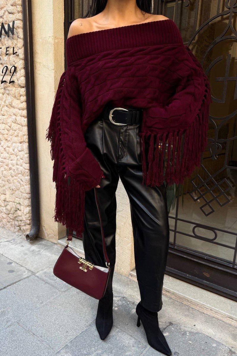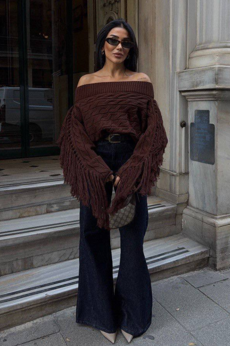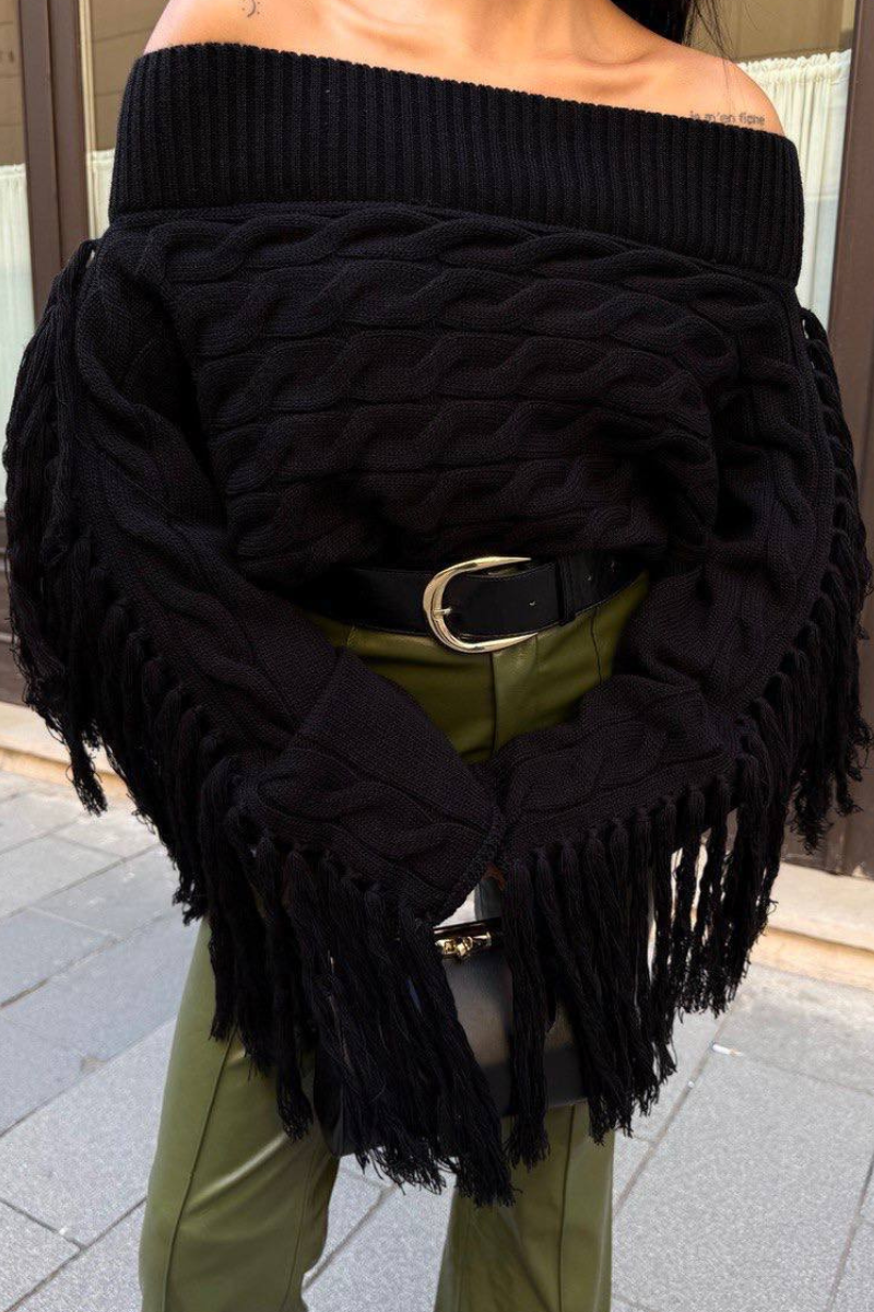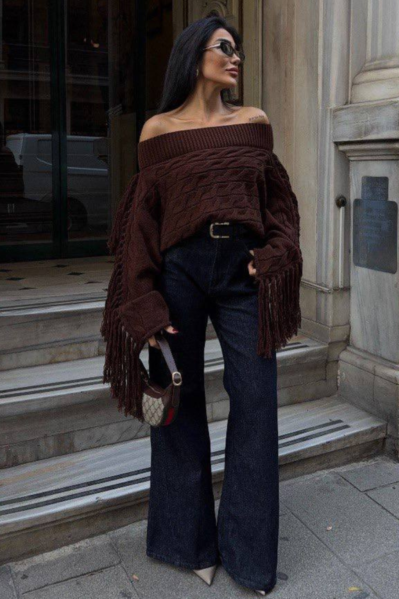 Soft knit meets playful style — this off-shoulder sweater with tassel details adds a chic, relaxed vibe to any outfit.