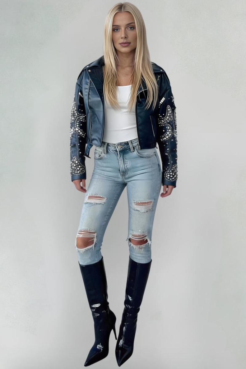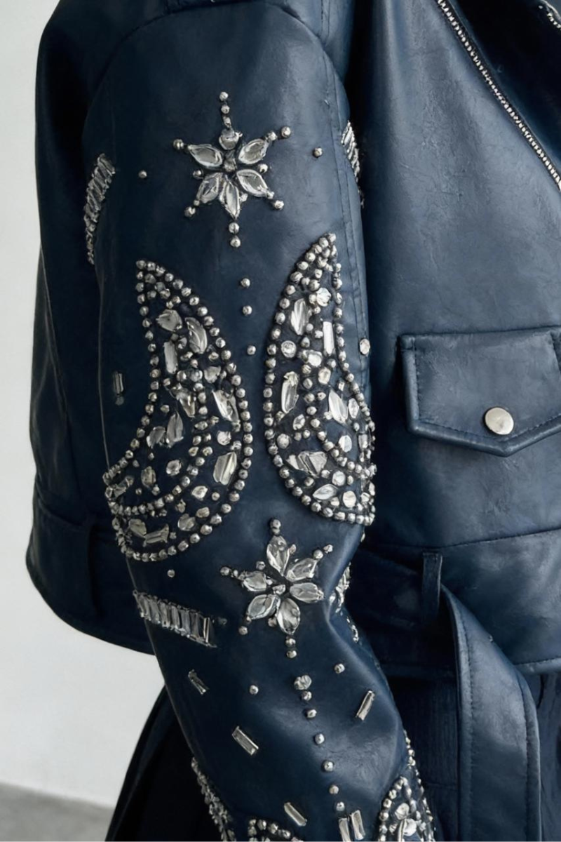 A statement moto jacket crafted from soft vegan leather, accented with elegant embellishments for a bold, modern edge.
