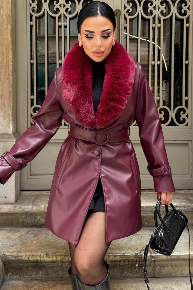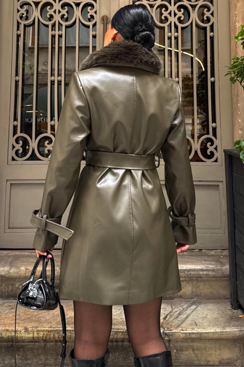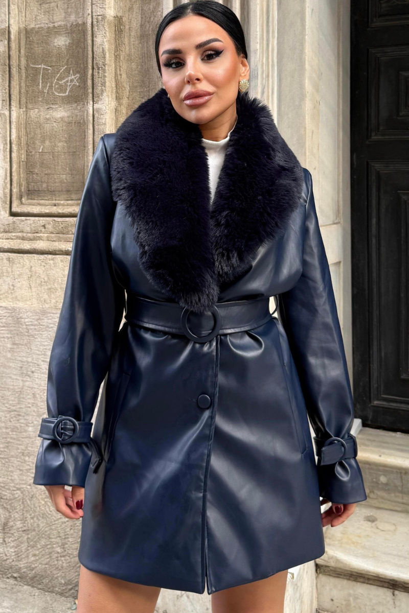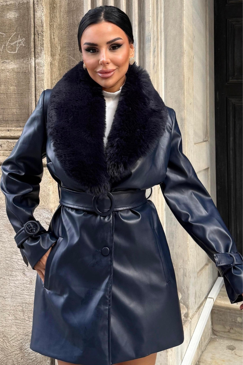 Stylish mid-length vegan leather coat with a luxe faux fur collar — sleek, warm, and perfect for a modern winter look.