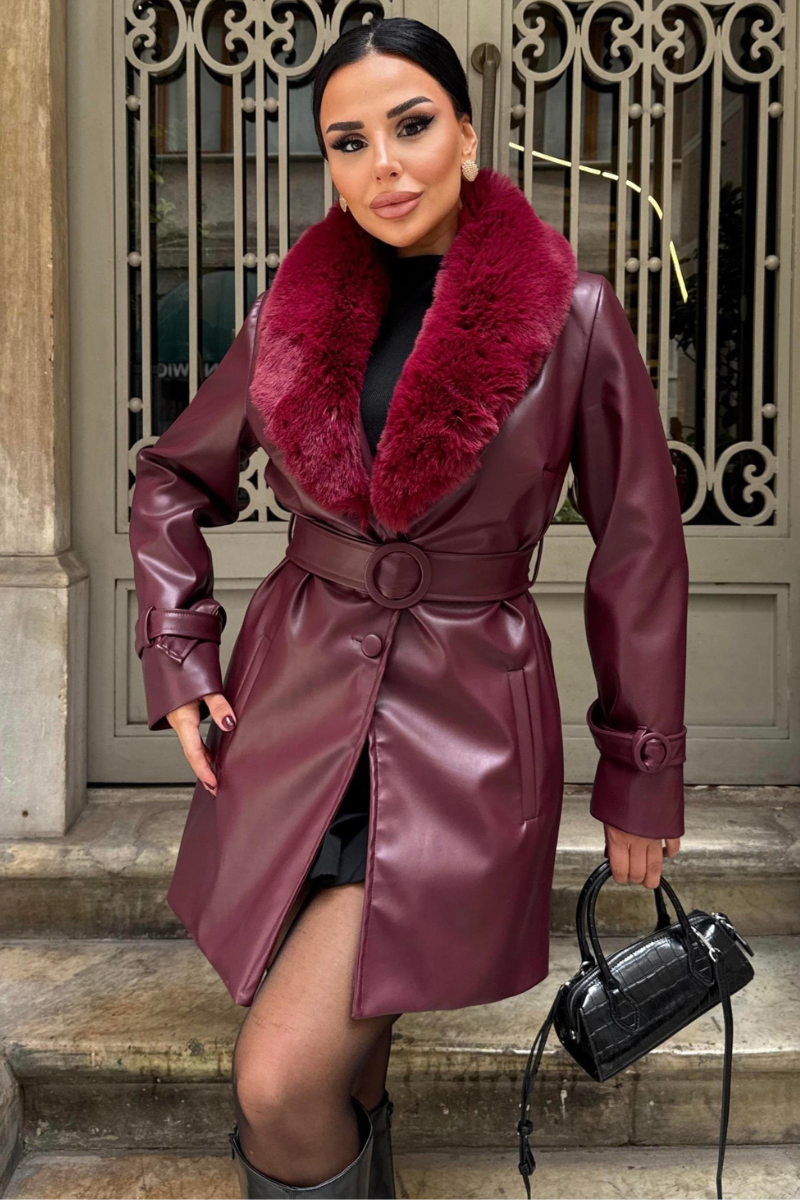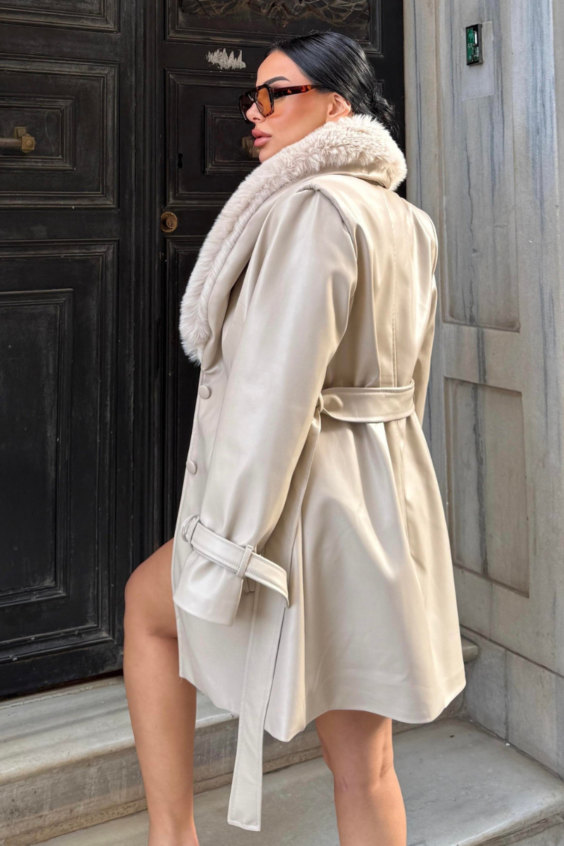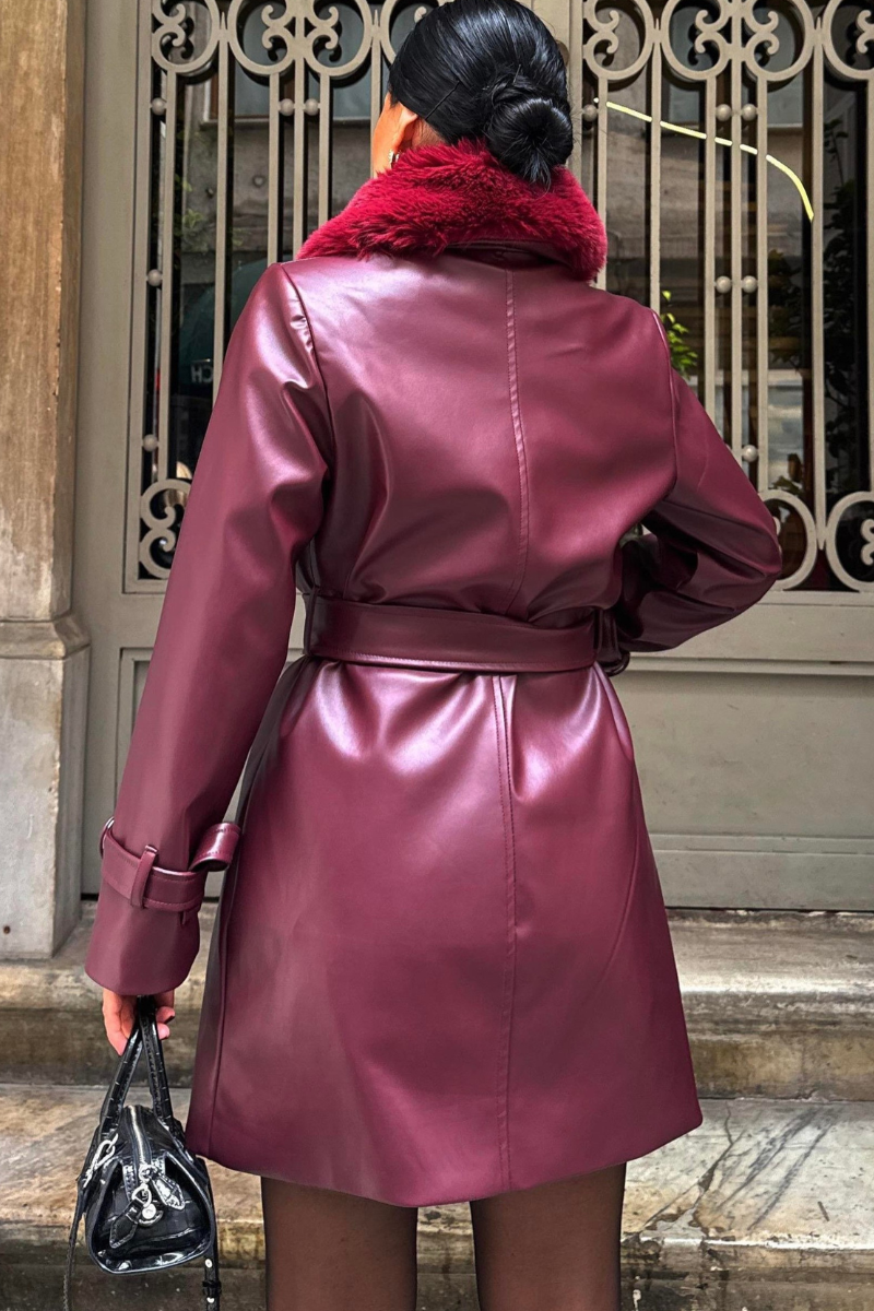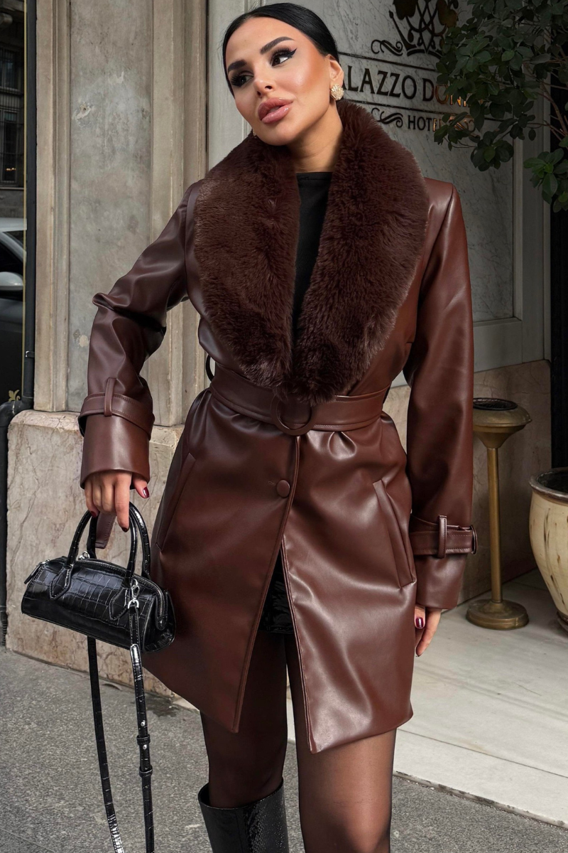 Stylish mid-length vegan leather coat with a luxe faux fur collar — sleek, warm, and perfect for a modern winter look.