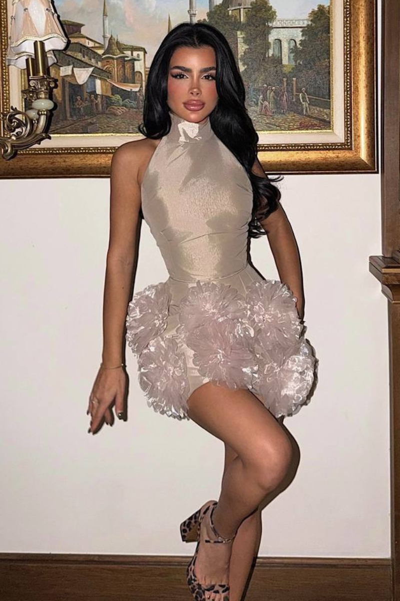 A charming mini dress adorned with delicate floral accents for a soft, feminine touch.