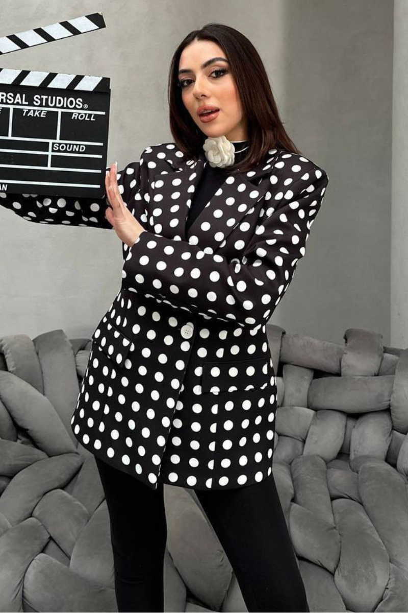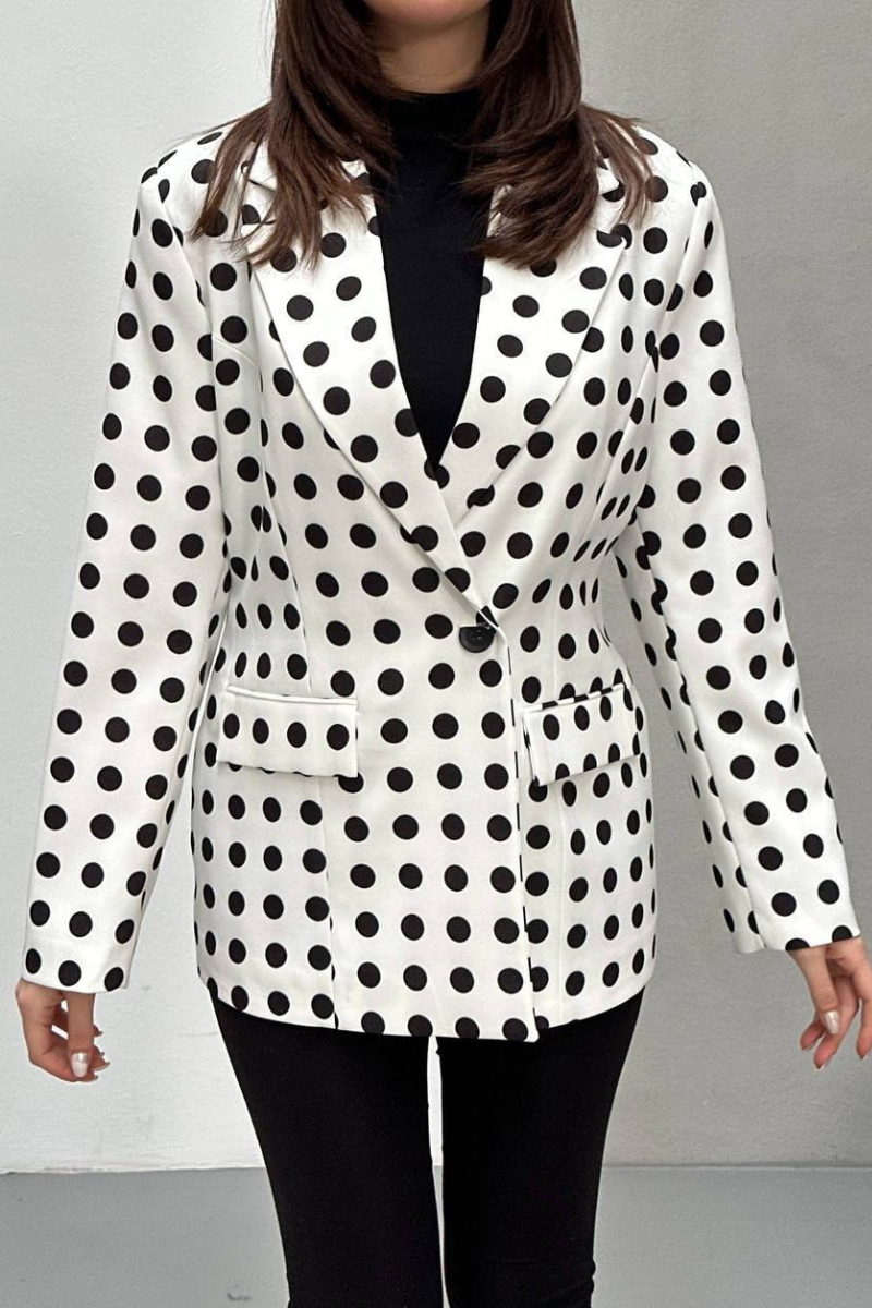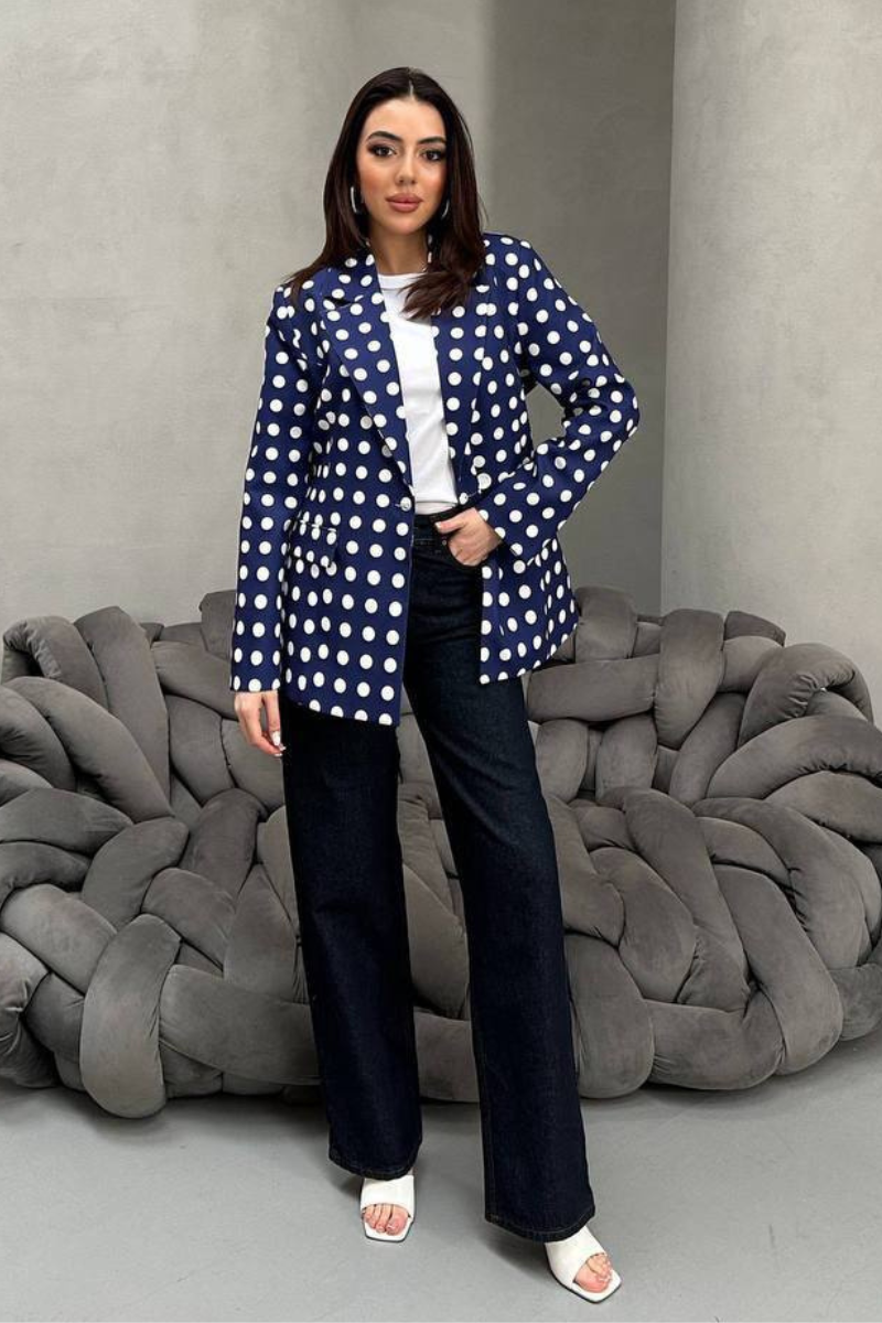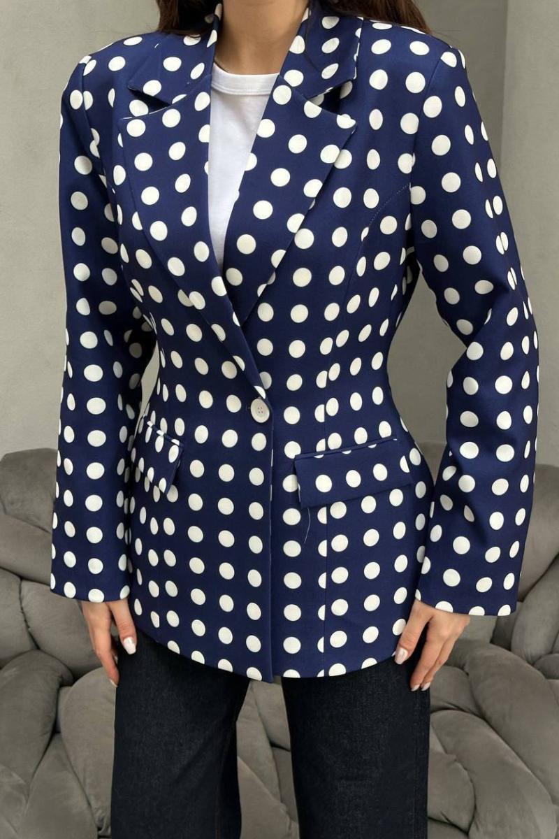 A stylish blazer featuring a playful polka dot pattern with a tailored fit.