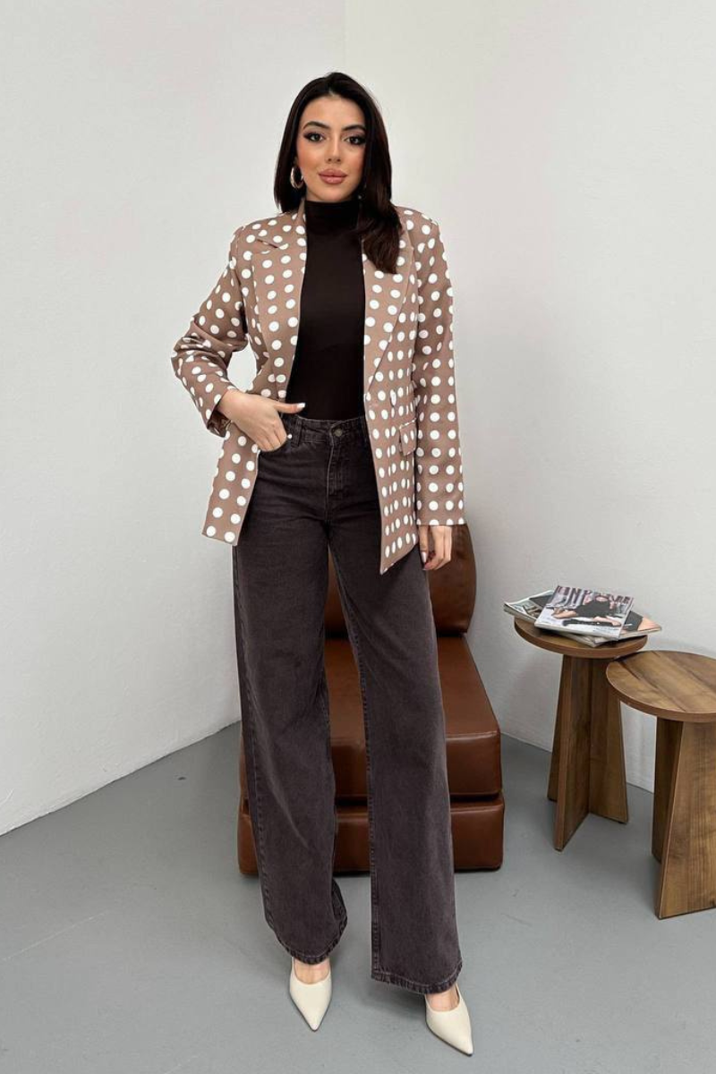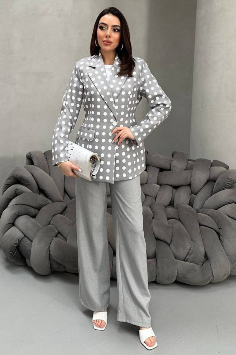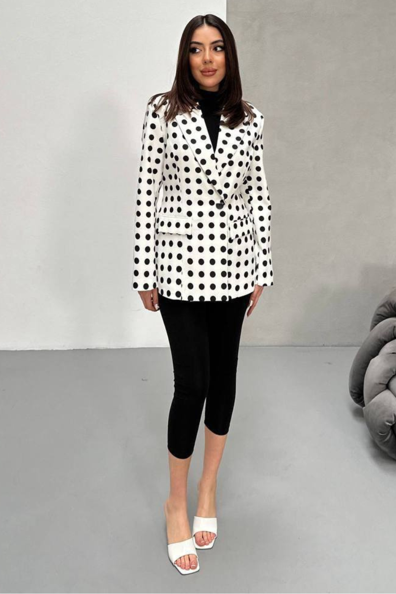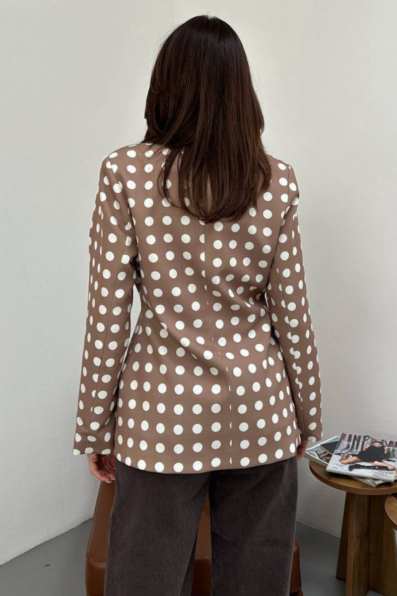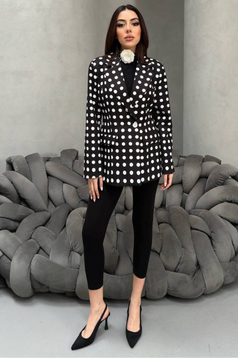 A stylish blazer featuring a playful polka dot pattern with a tailored fit.