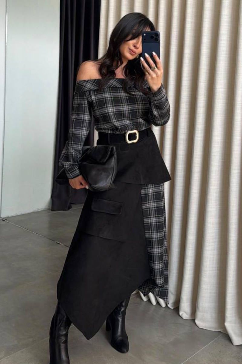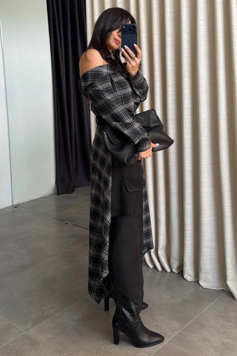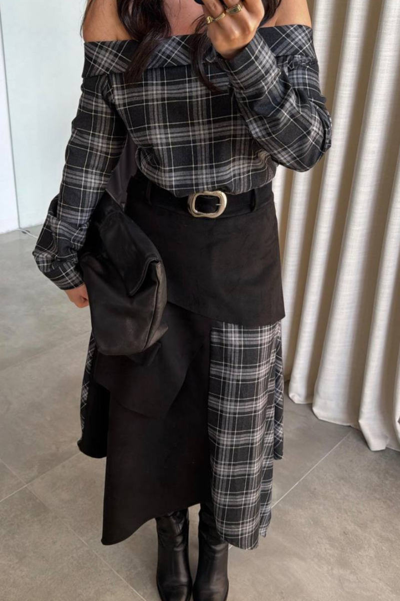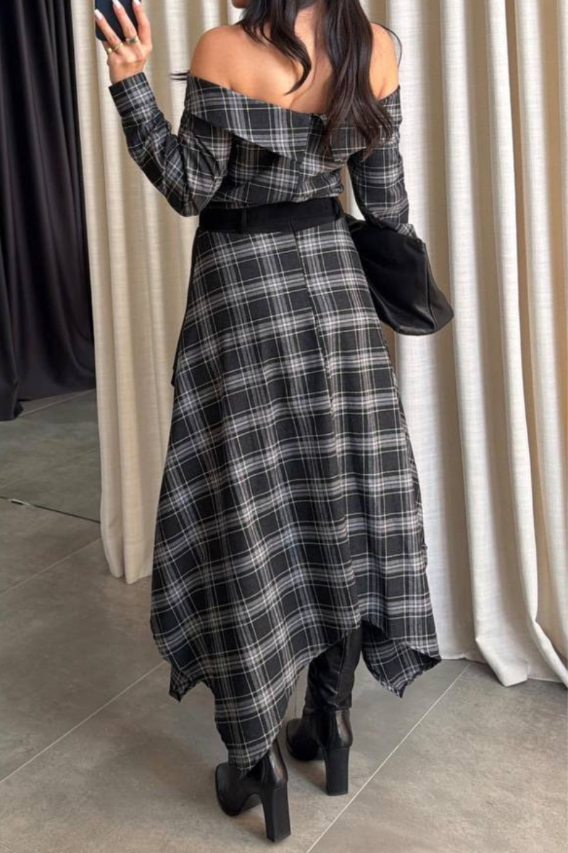 A modern dress featuring a classic plaid pattern with an asymmetrical silhouette for a bold, fashion-forward look.