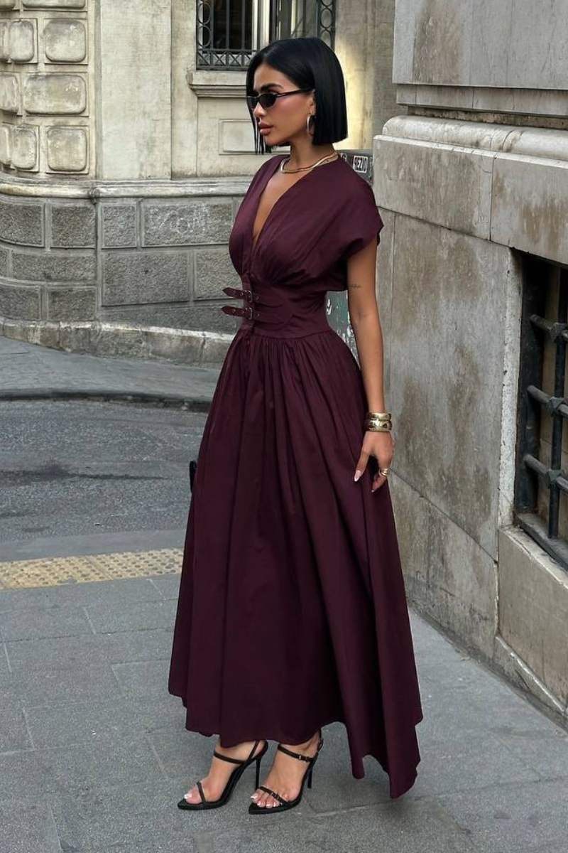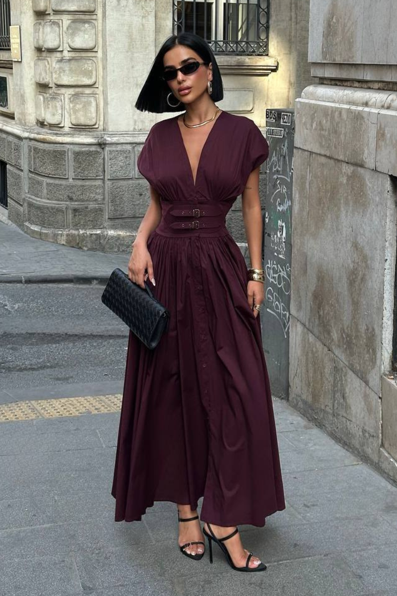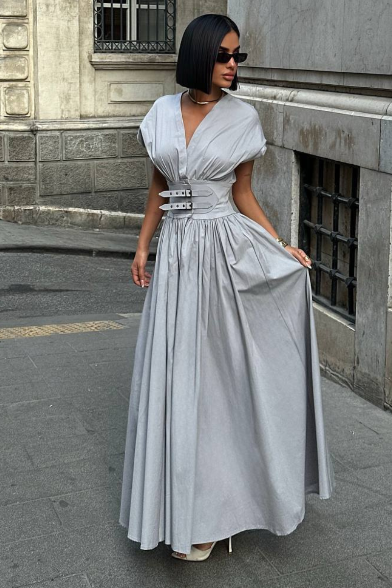 An elegant floor-length dress designed with a defined belted waist for a flattering silhouette.