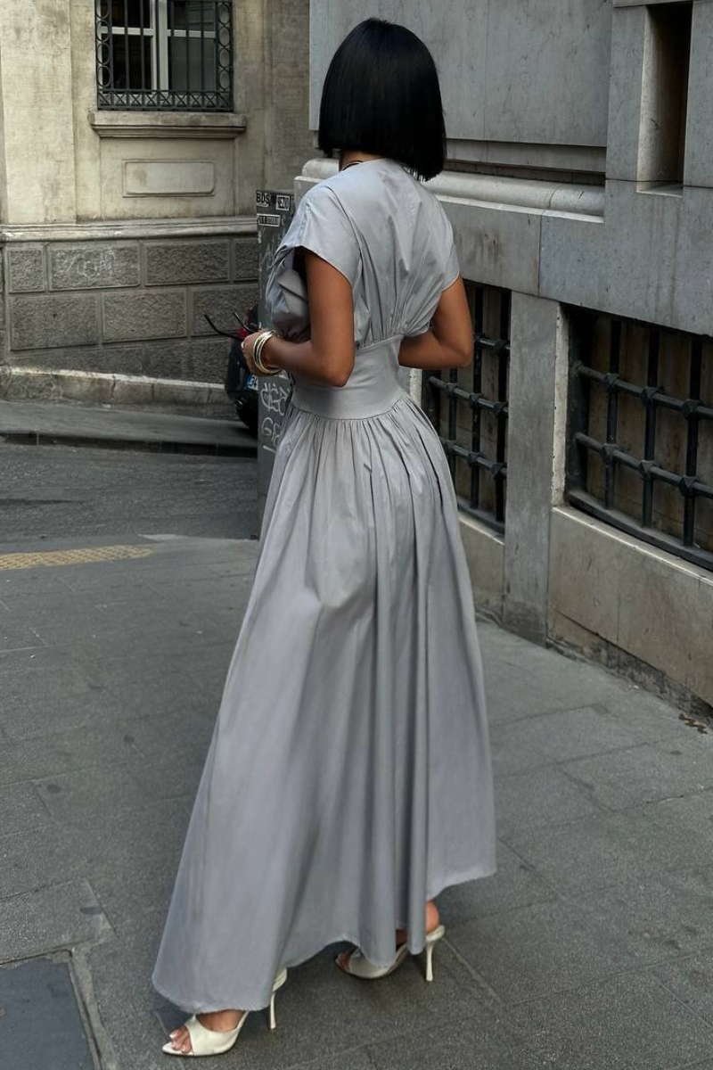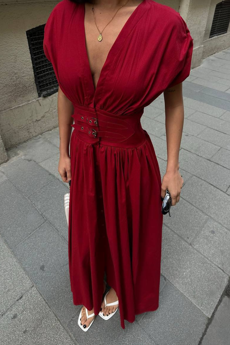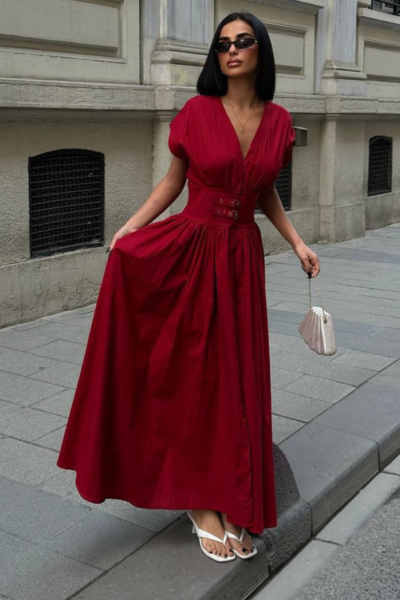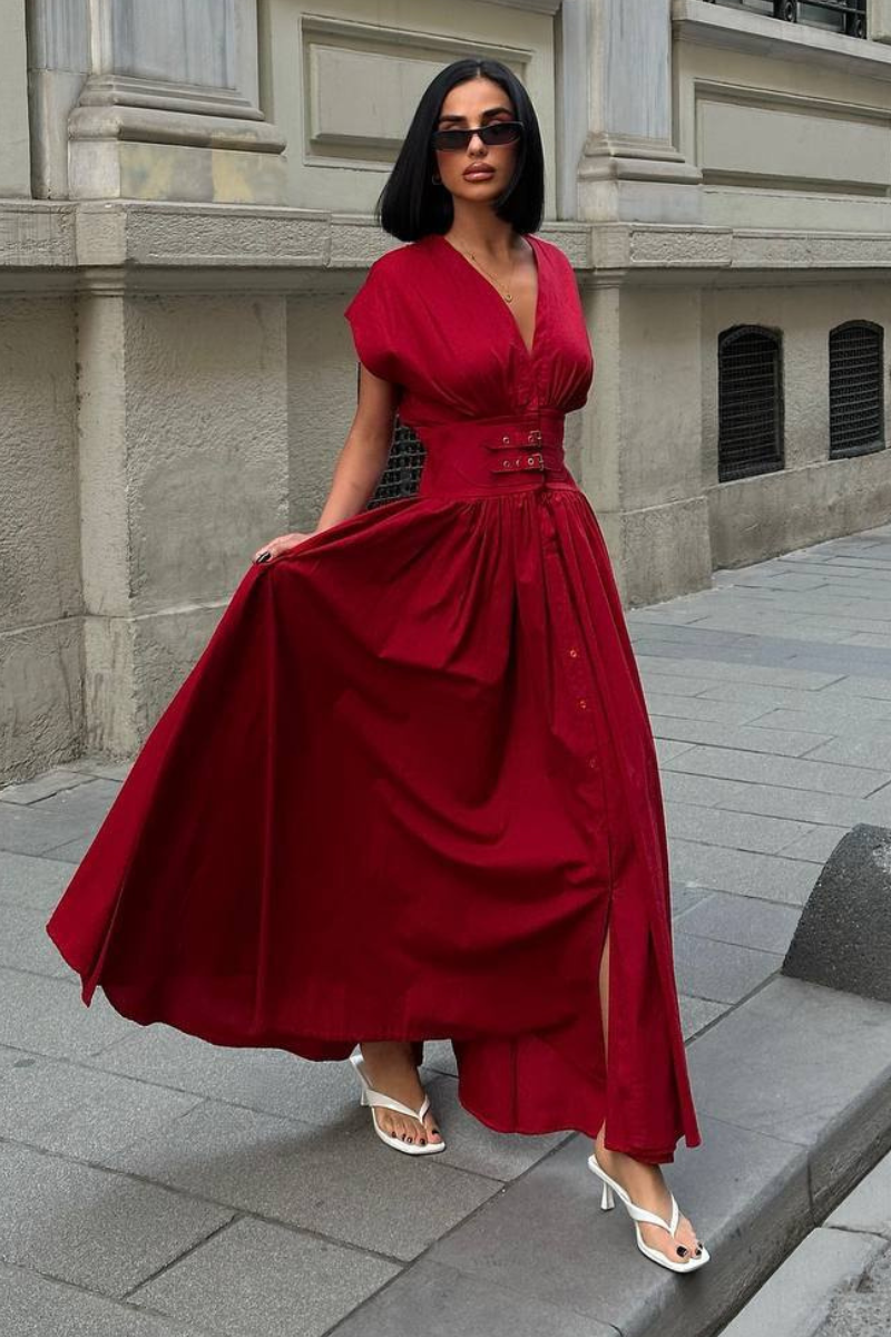 An elegant floor-length dress designed with a defined belted waist for a flattering silhouette.