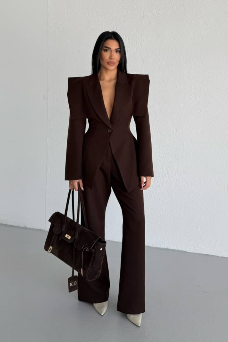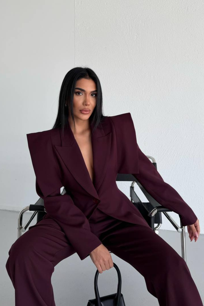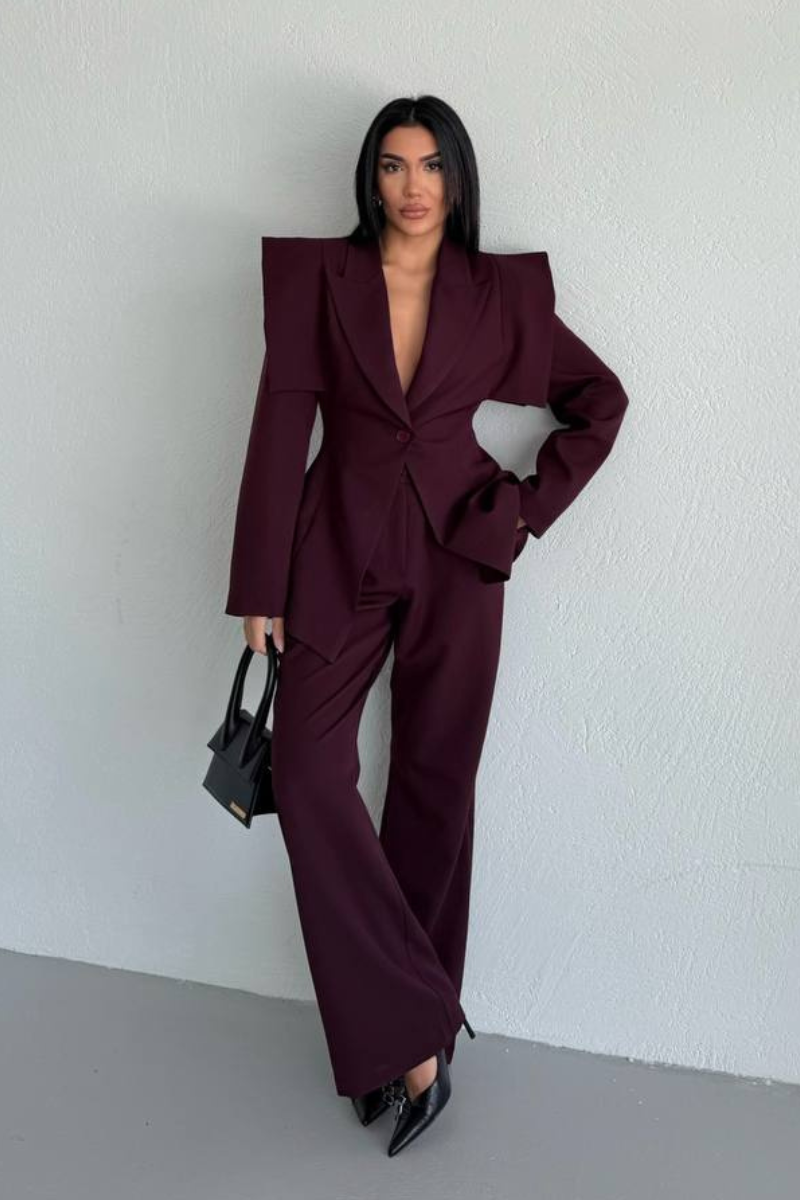 A polished matching set featuring a sharply tailored blazer and coordinating bottoms.