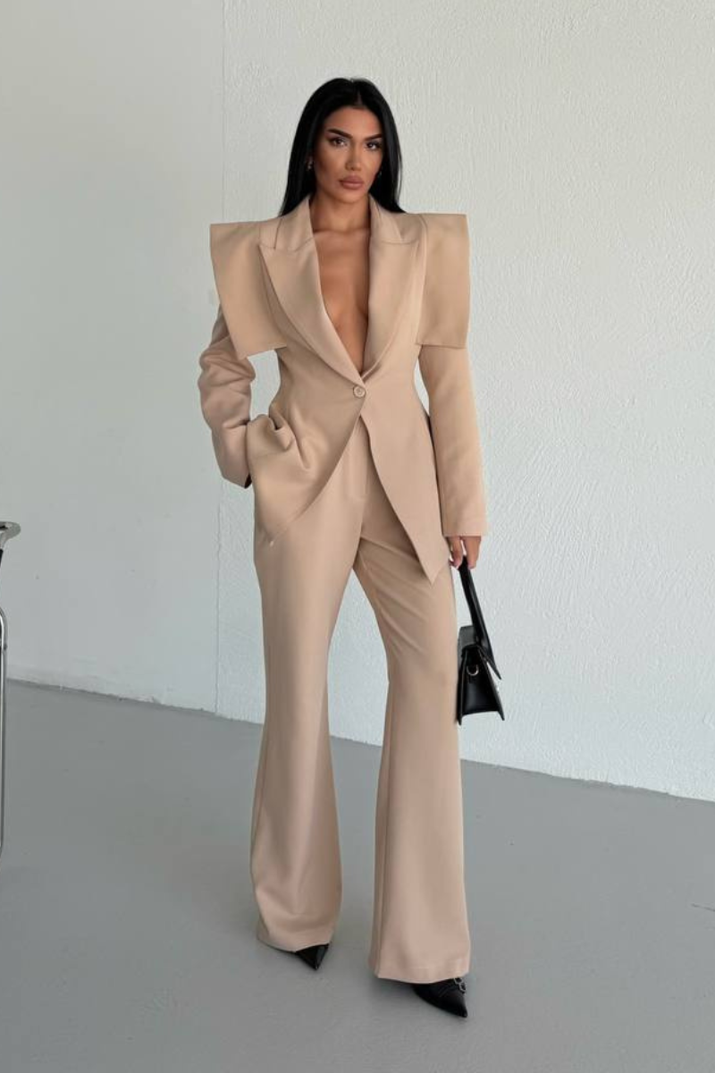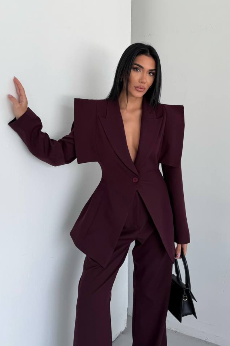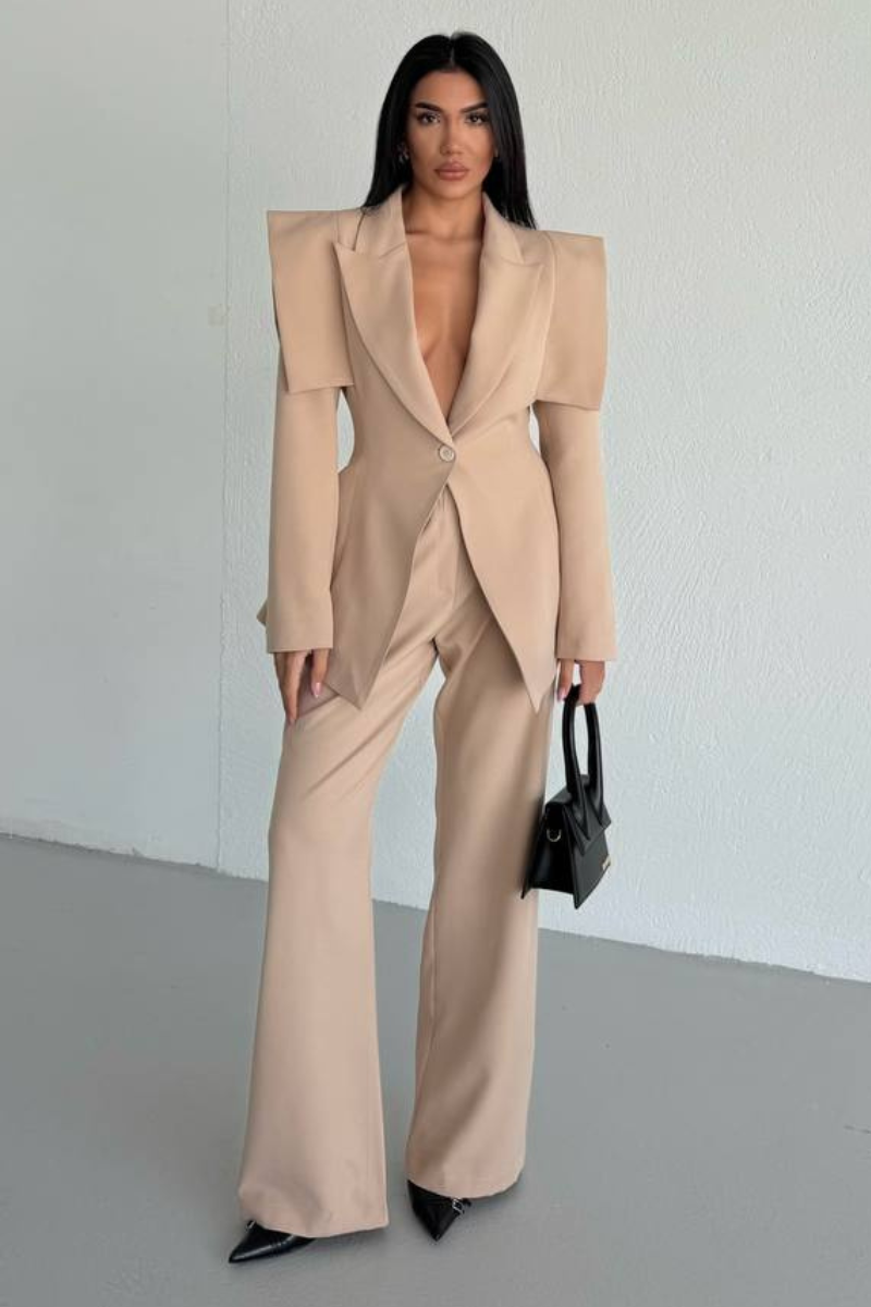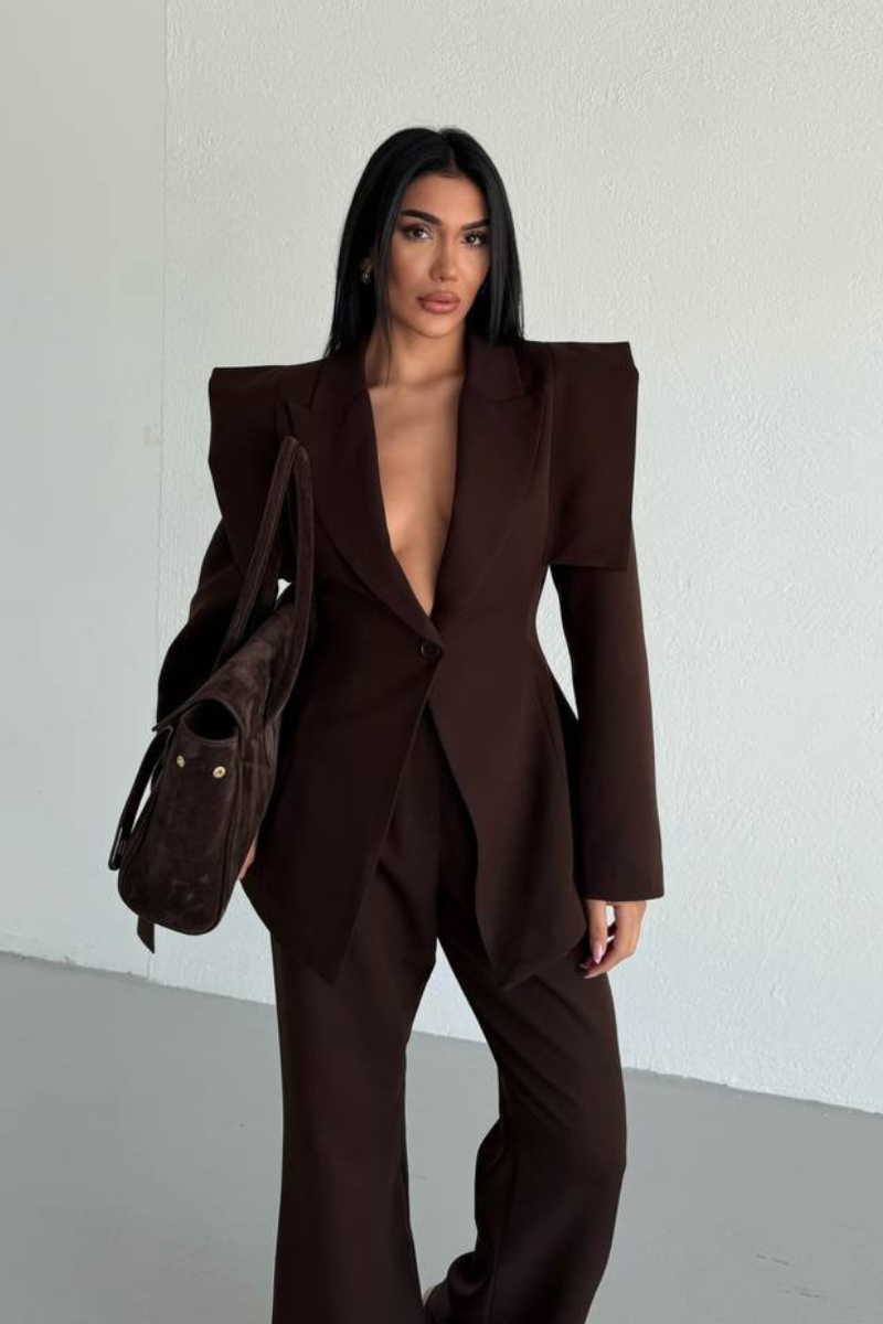 A polished matching set featuring a sharply tailored blazer and coordinating bottoms.