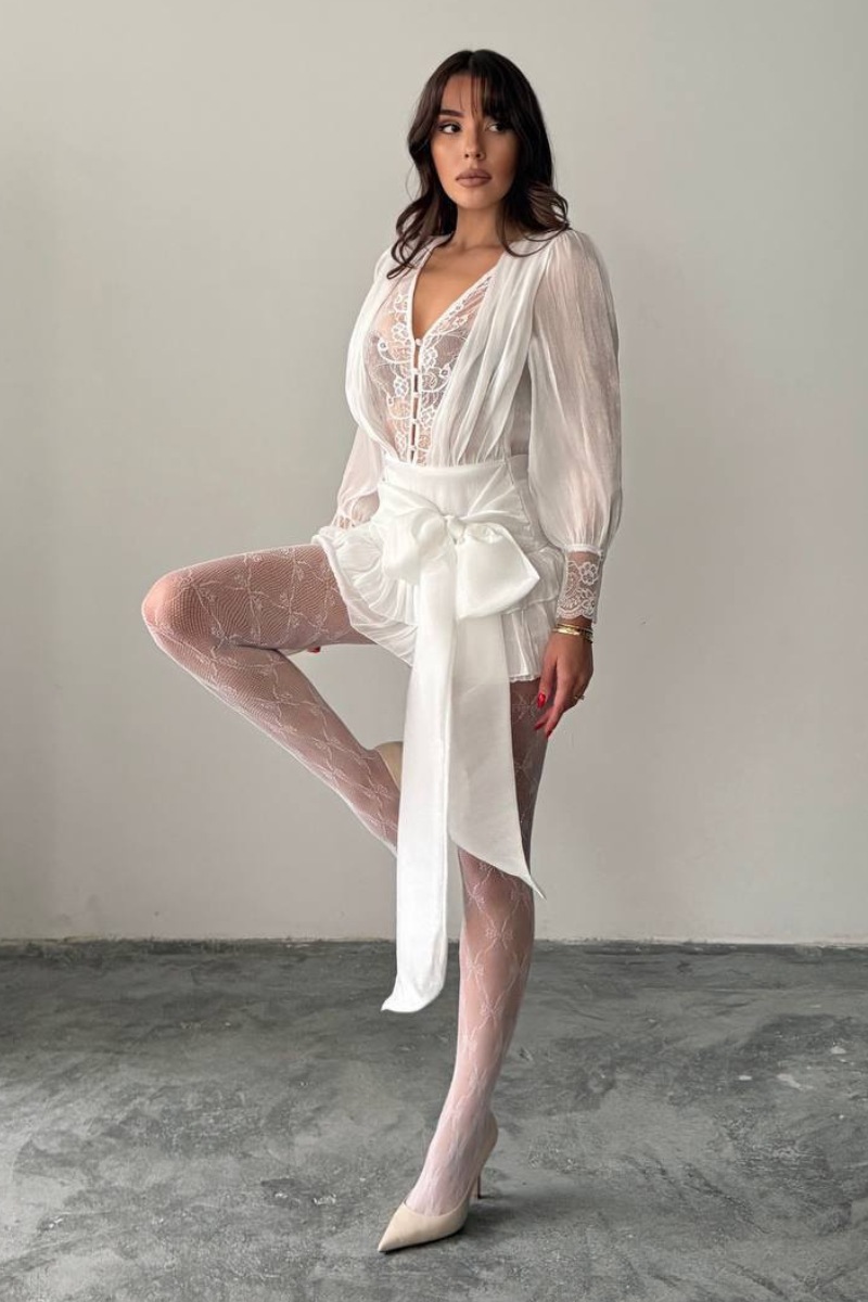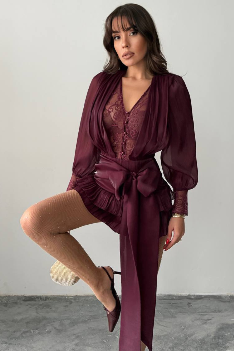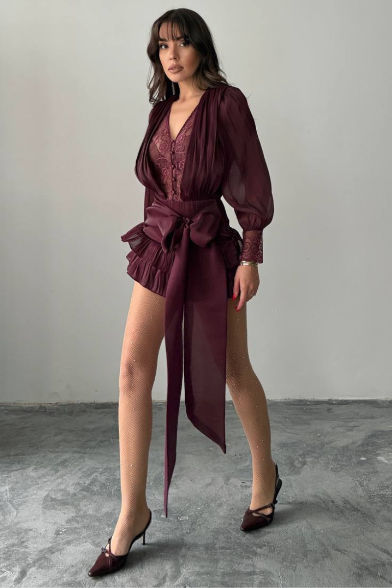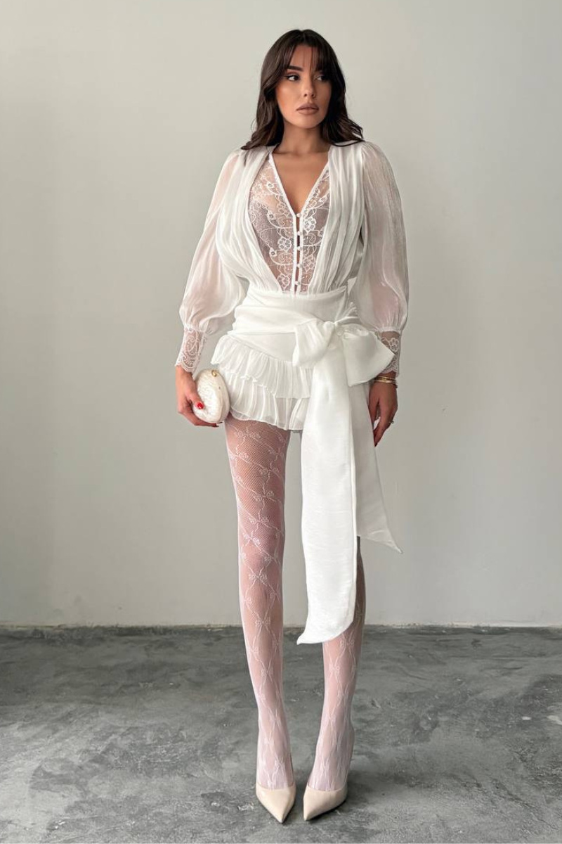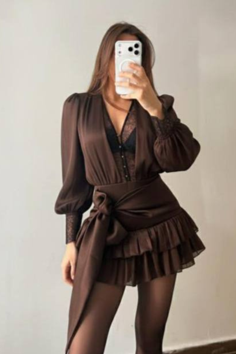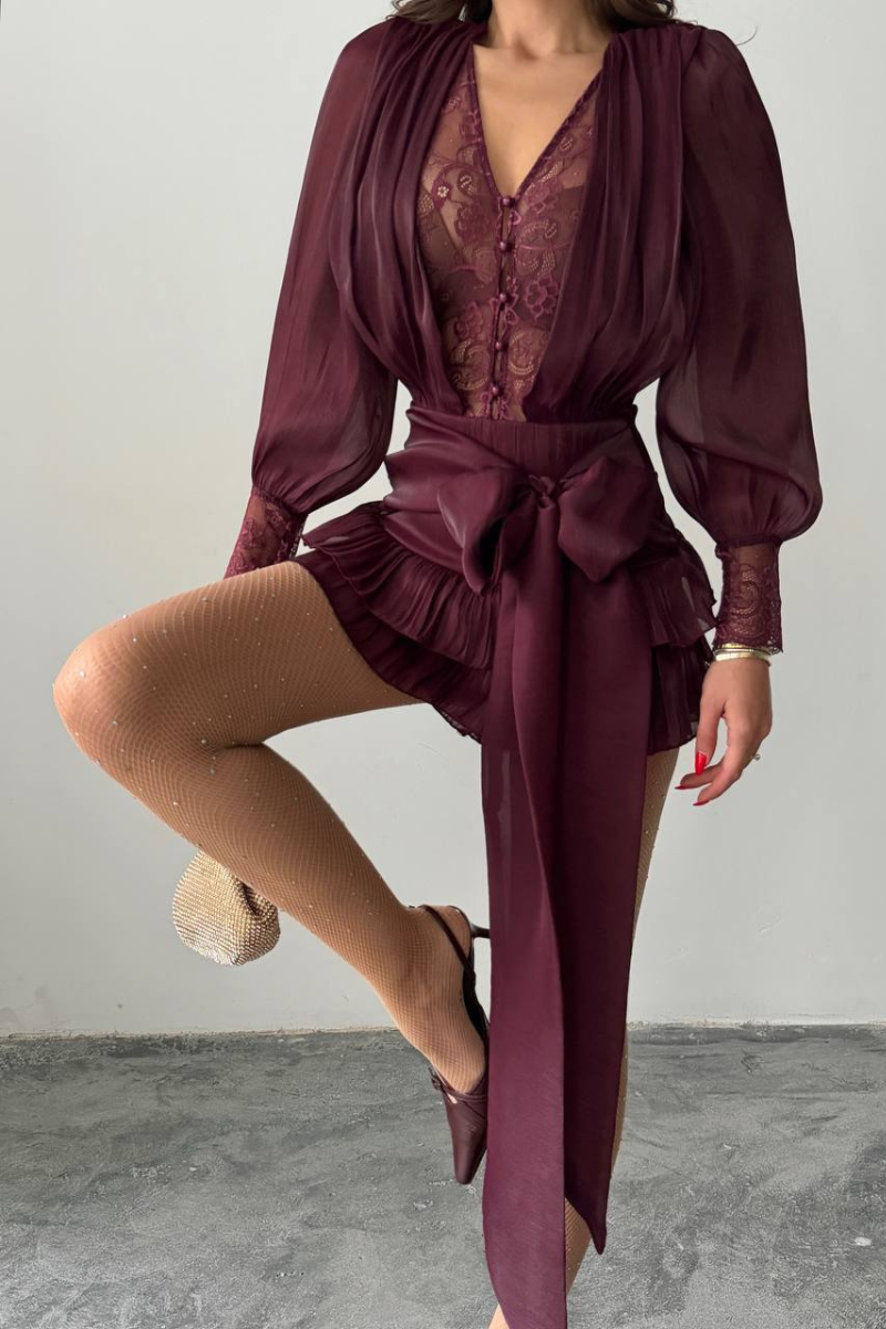 A lace-style mini dress with a flirty, fun ruffle hem that adds playful movement and charm.