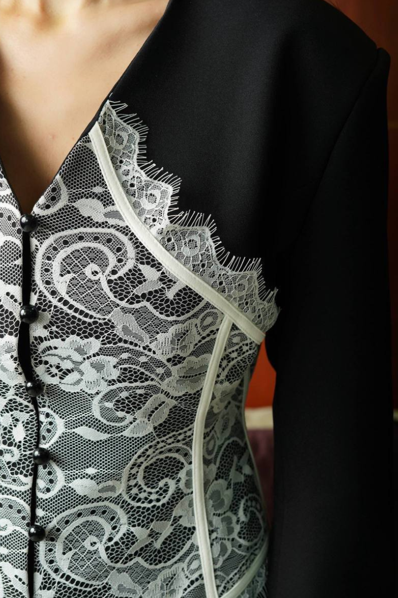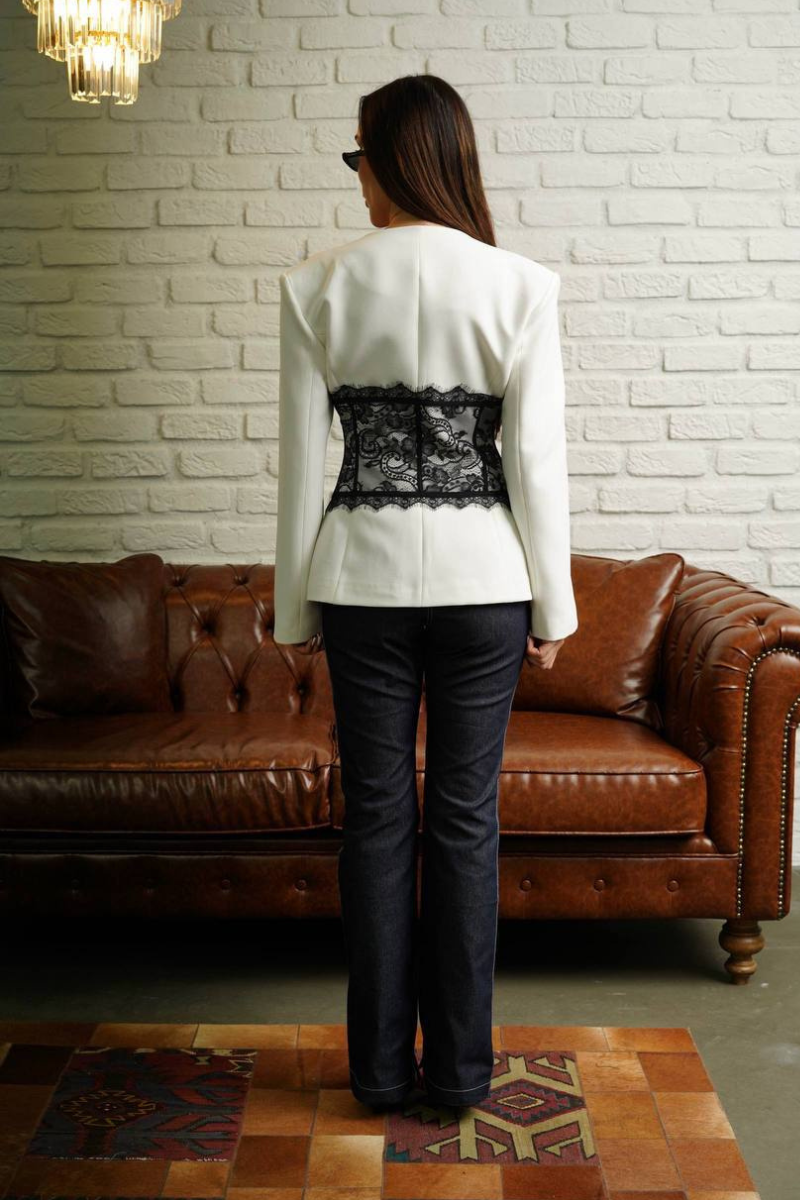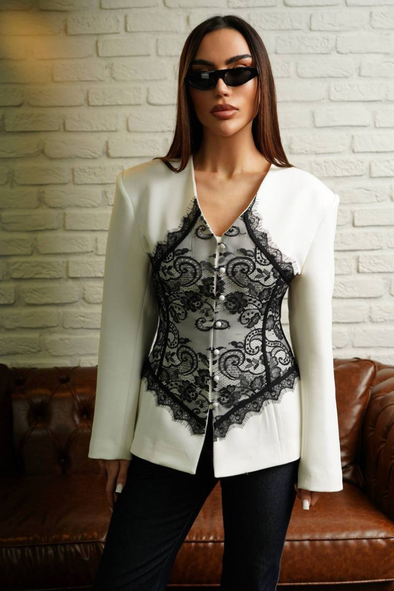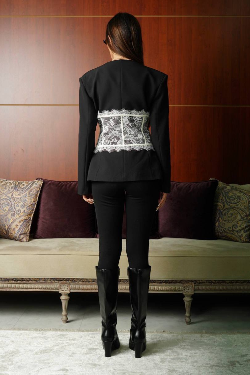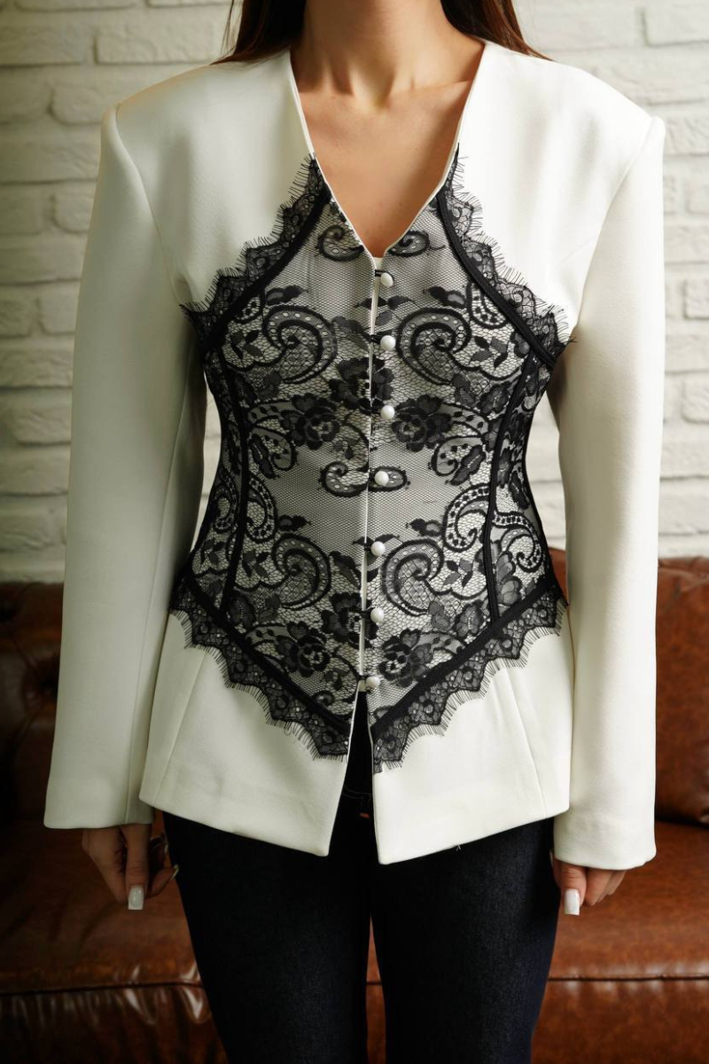 A stylish blend of tailored blazer with delicate lace detailing.