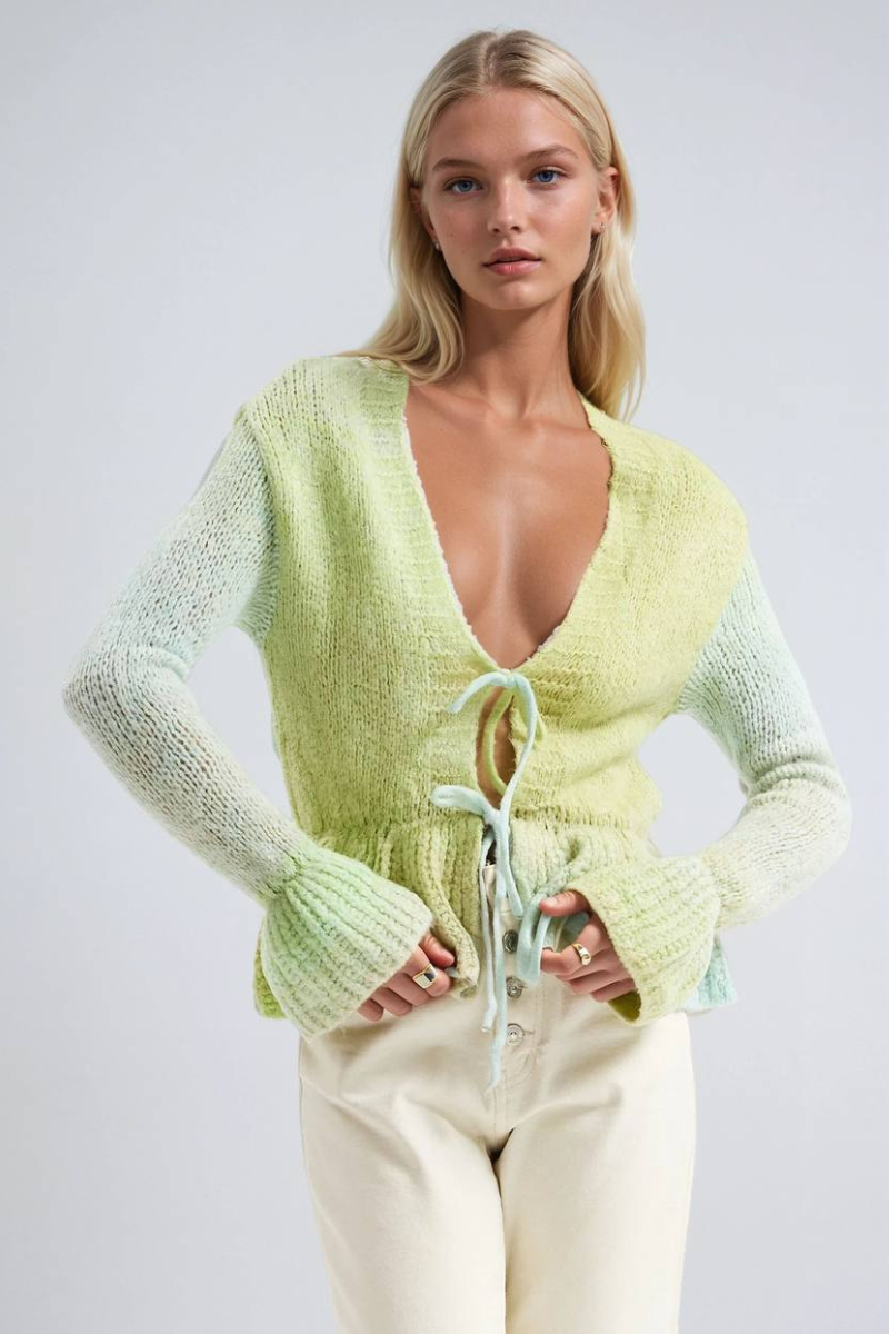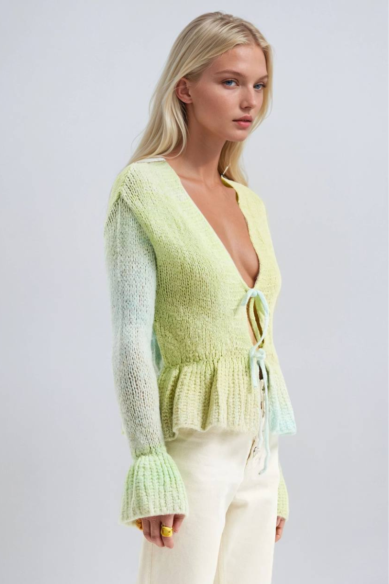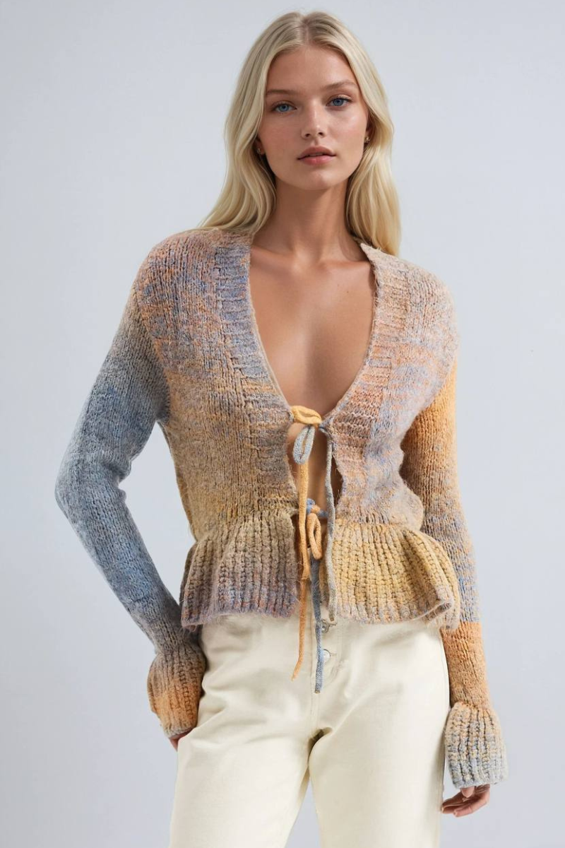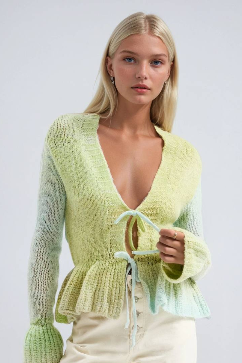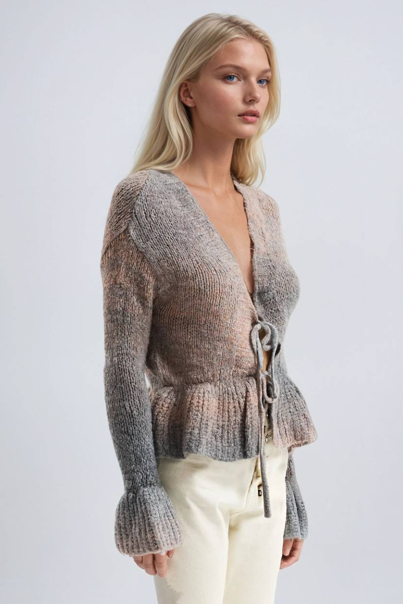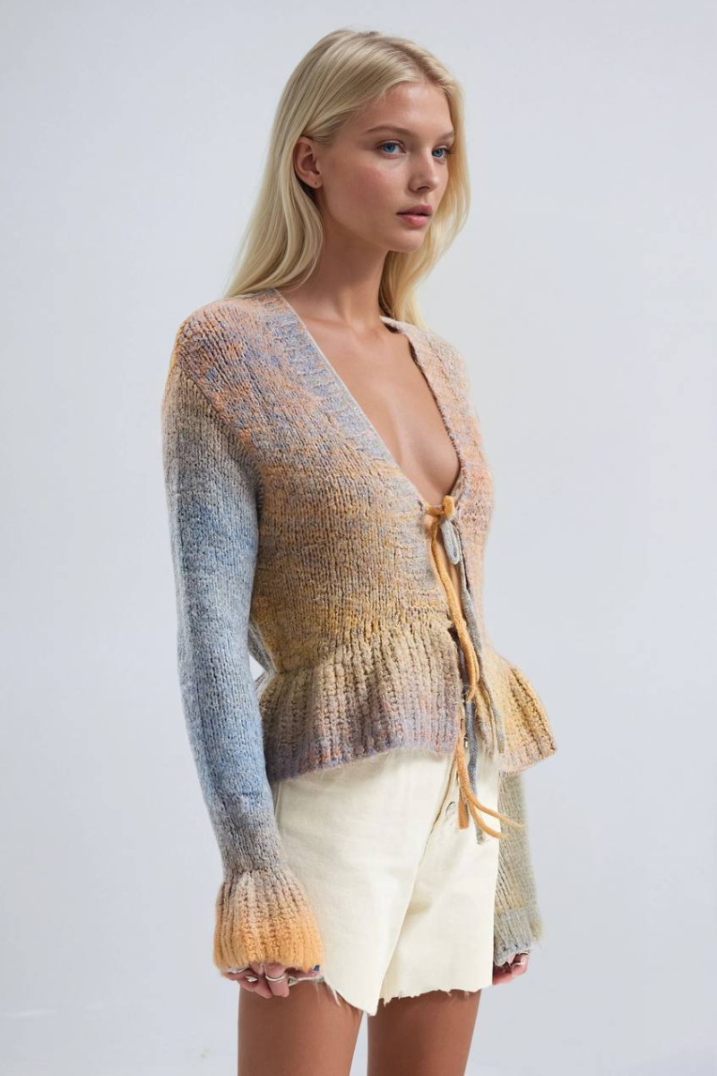 A cozy sweater-style jacket finished with delicate ruffle trim for a feminine touch.