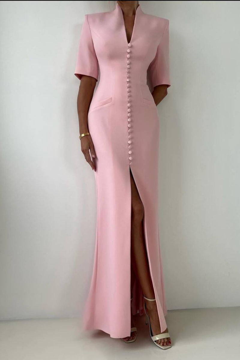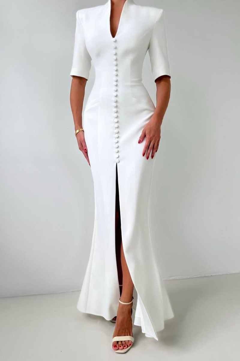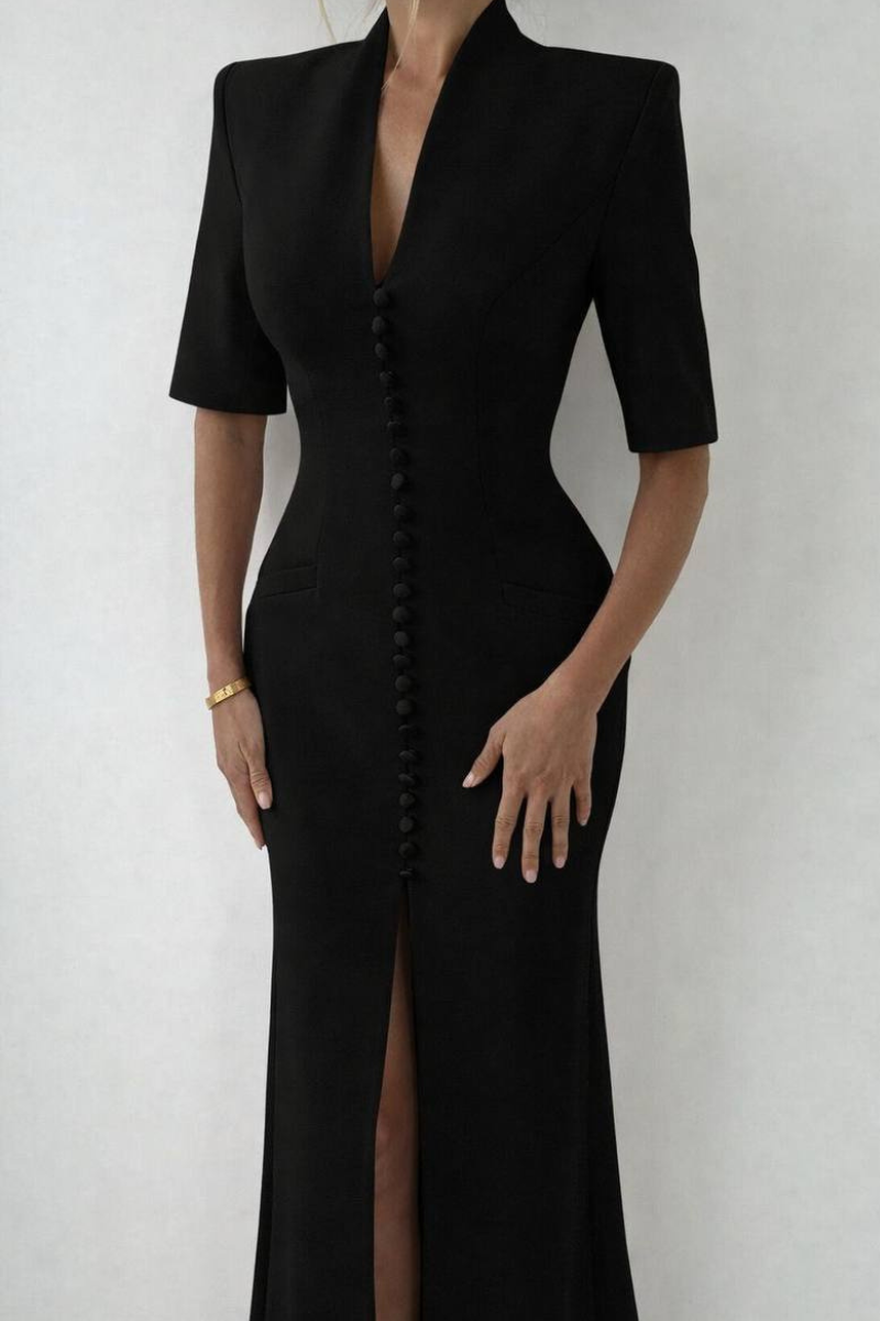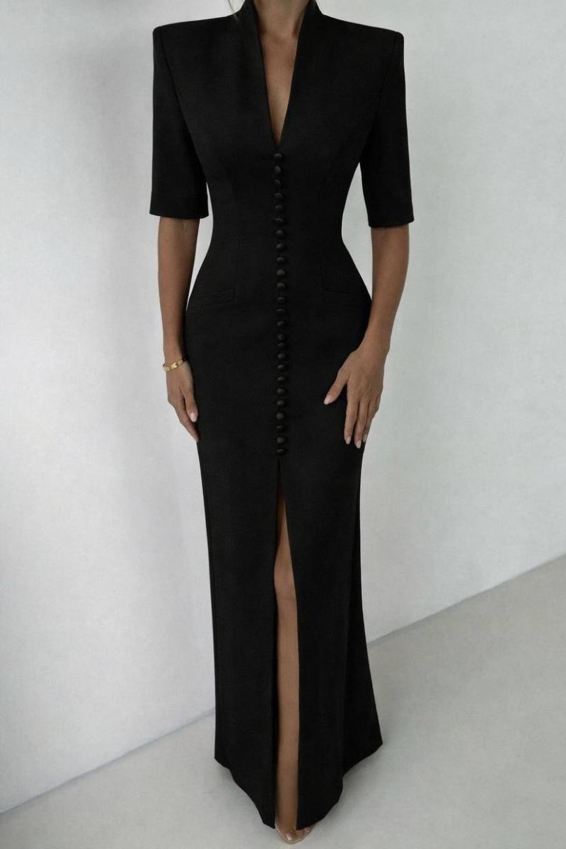 A refined maxi-length dress featuring a structured coat-style silhouette with a classic button-down front.