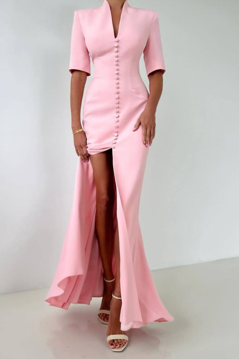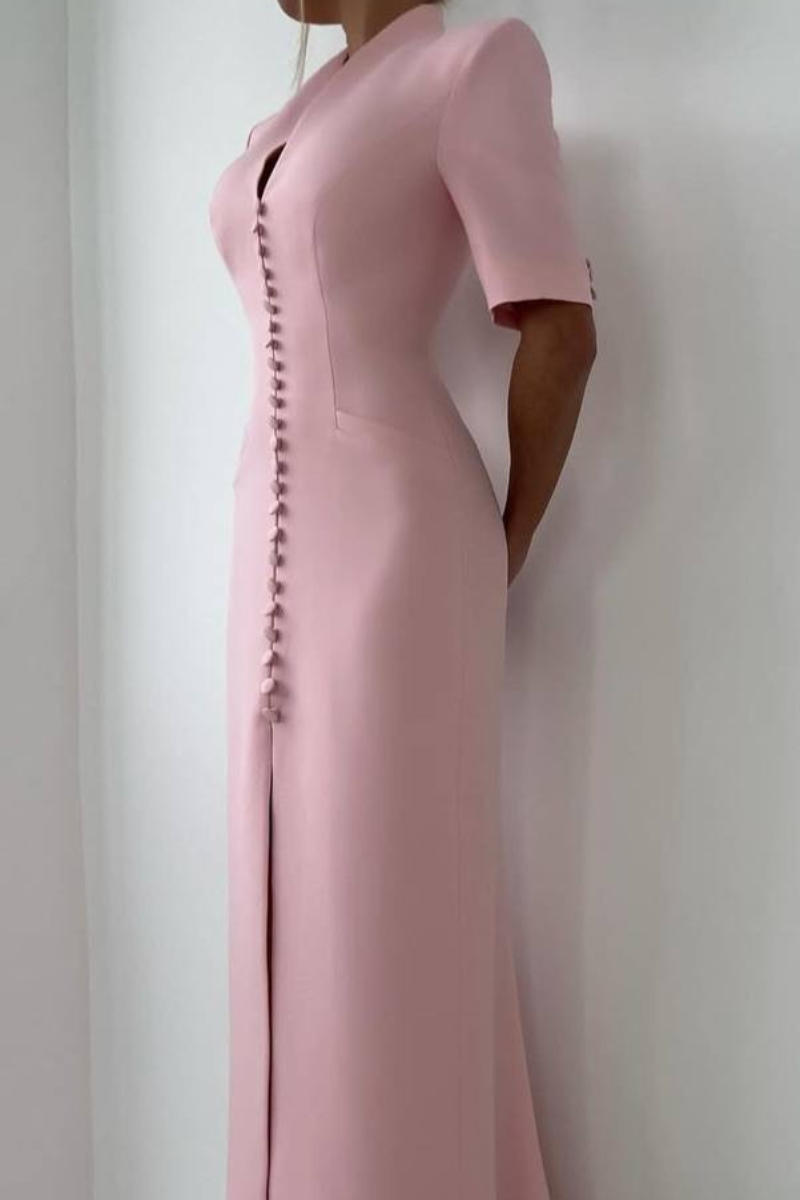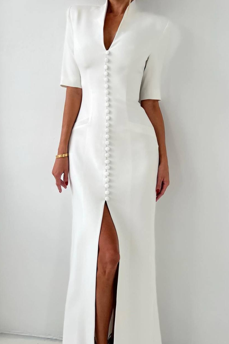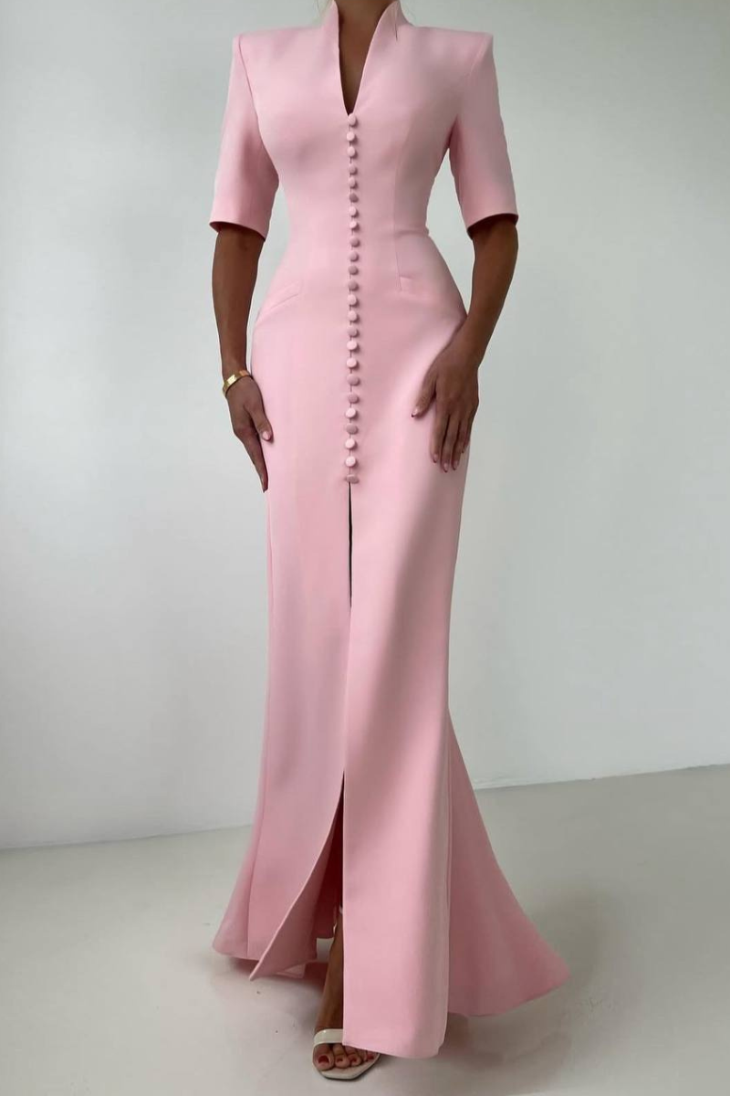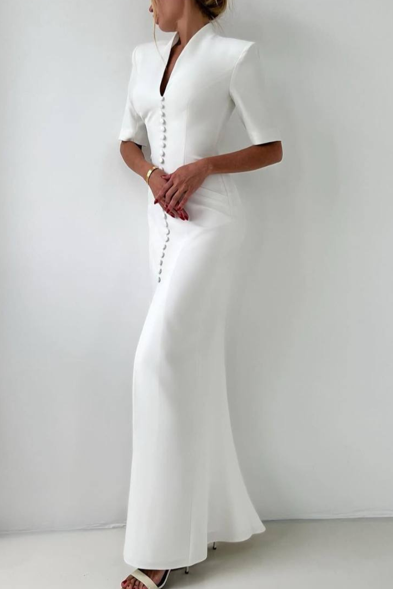A refined maxi-length dress featuring a structured coat-style silhouette with a classic button-down front.