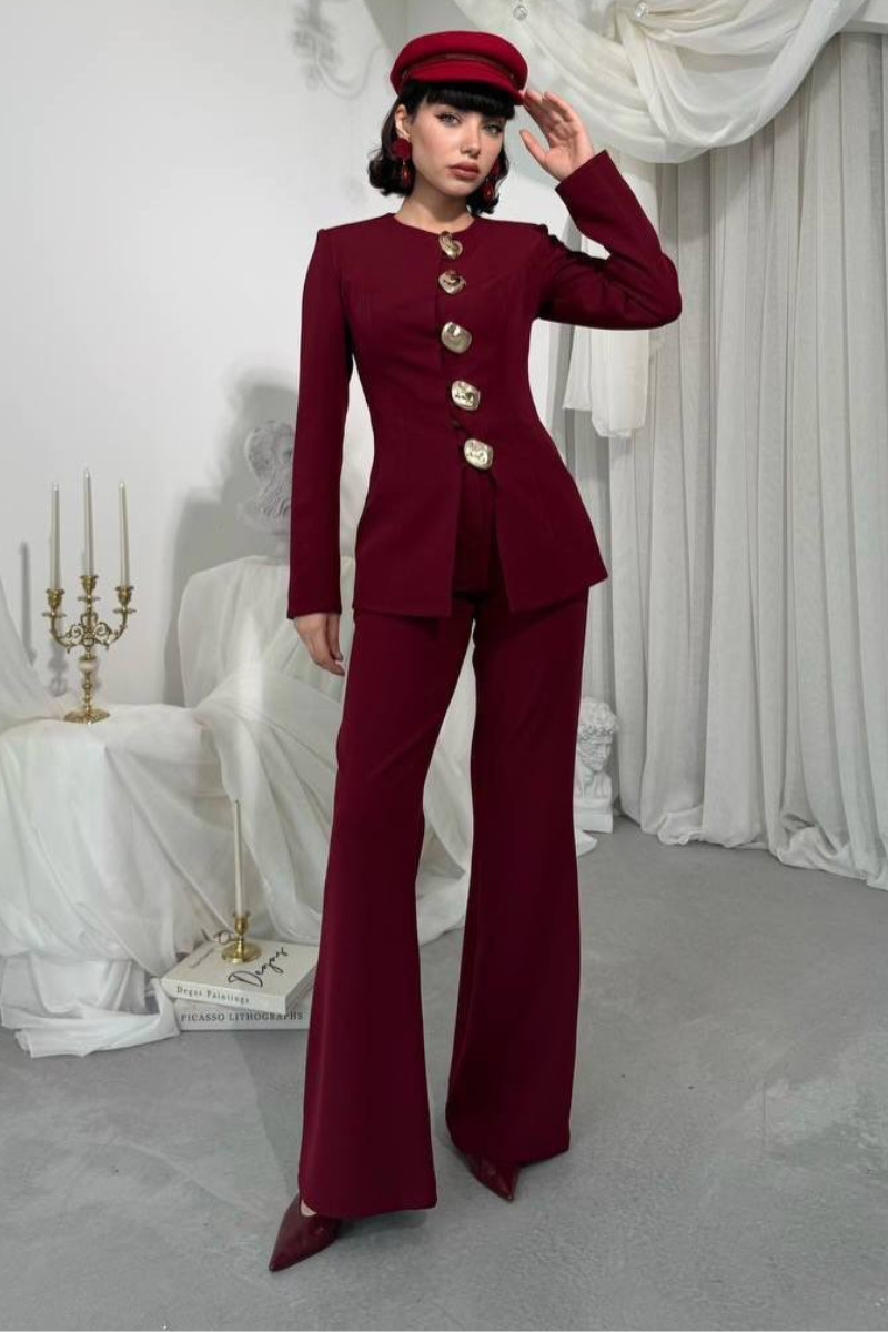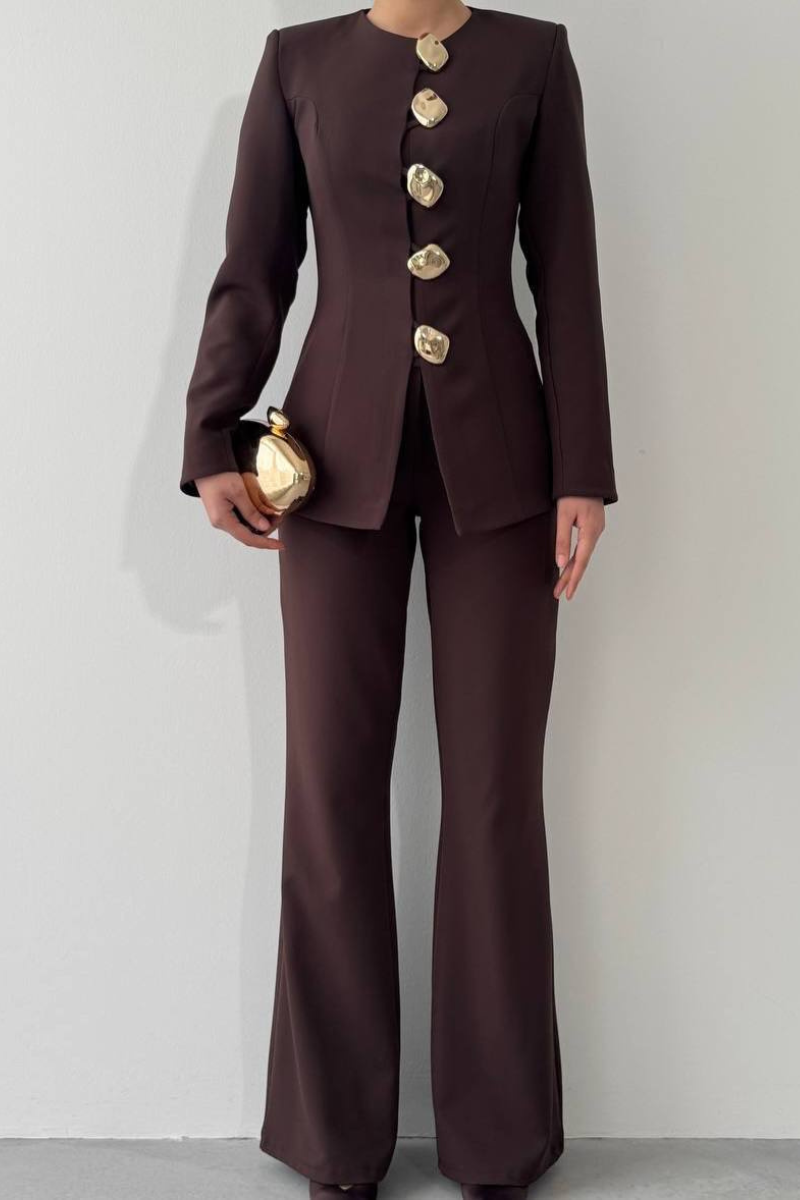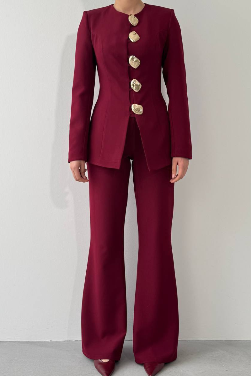 A sleek, tailored accent suit featuring elegant gold buttons for a refined, statement-making look.