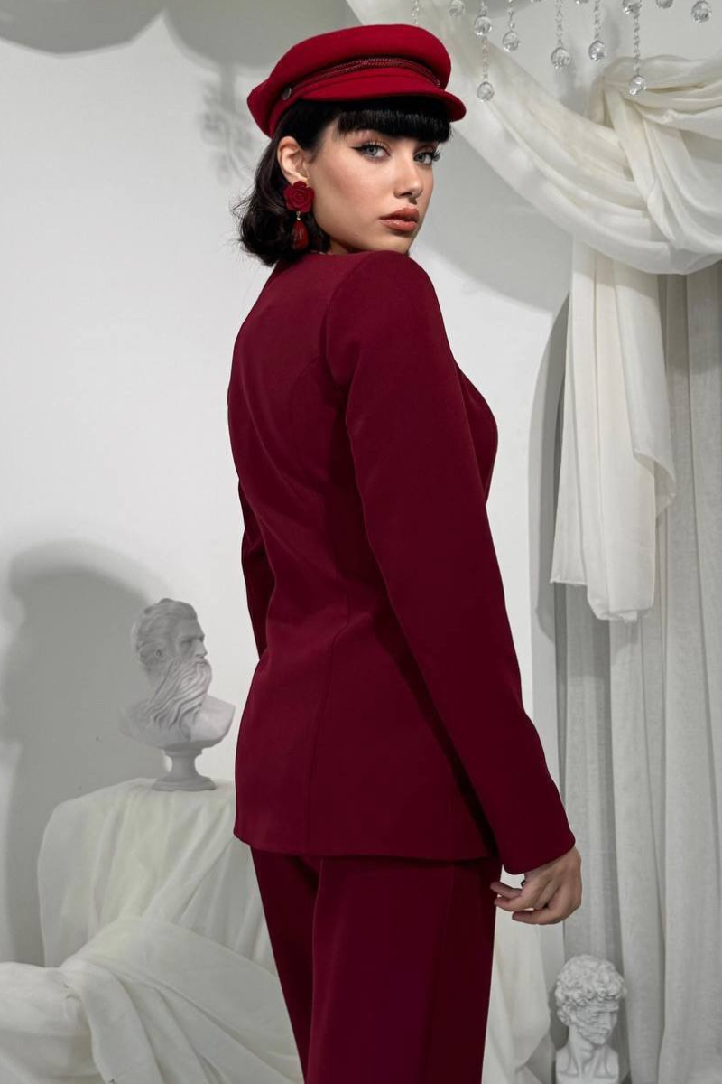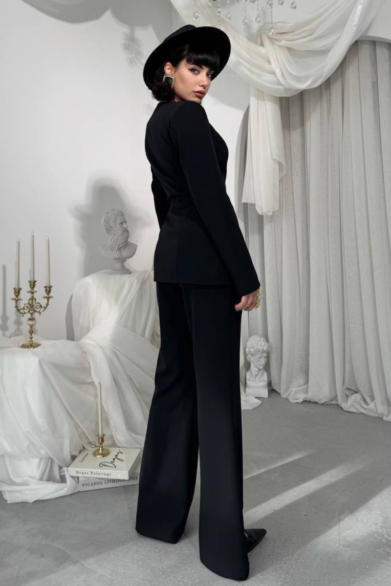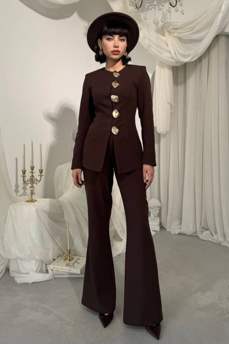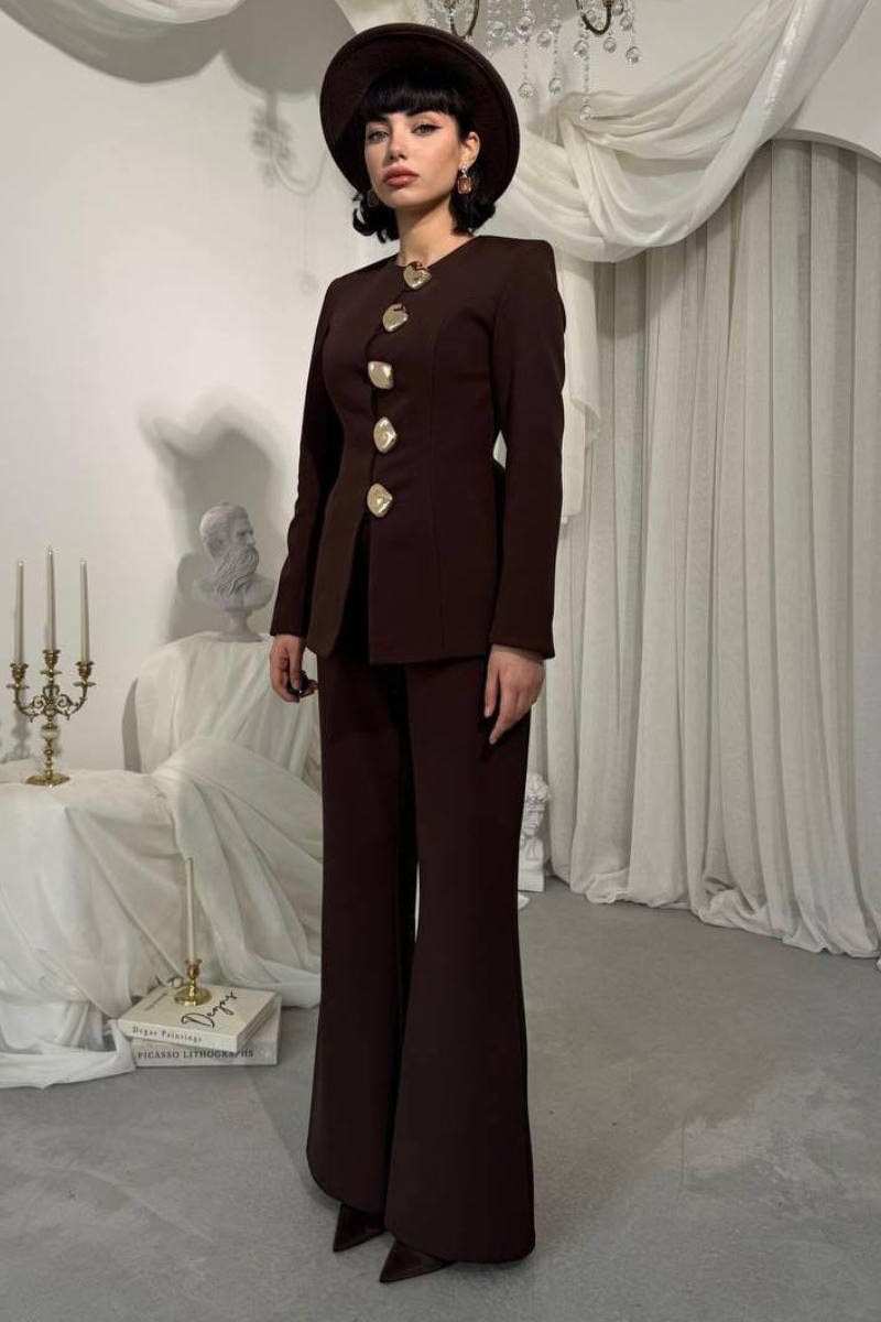 A sleek, tailored accent suit featuring elegant gold buttons for a refined, statement-making look.