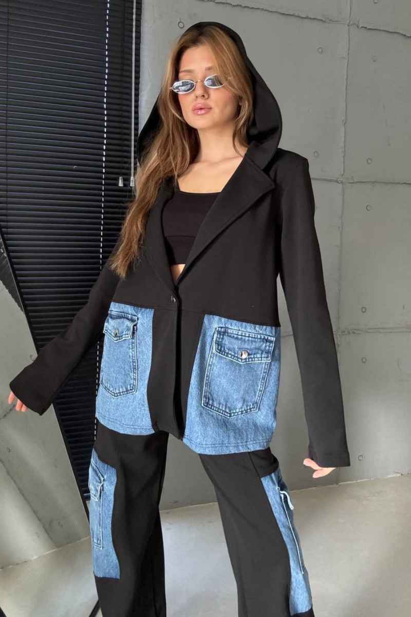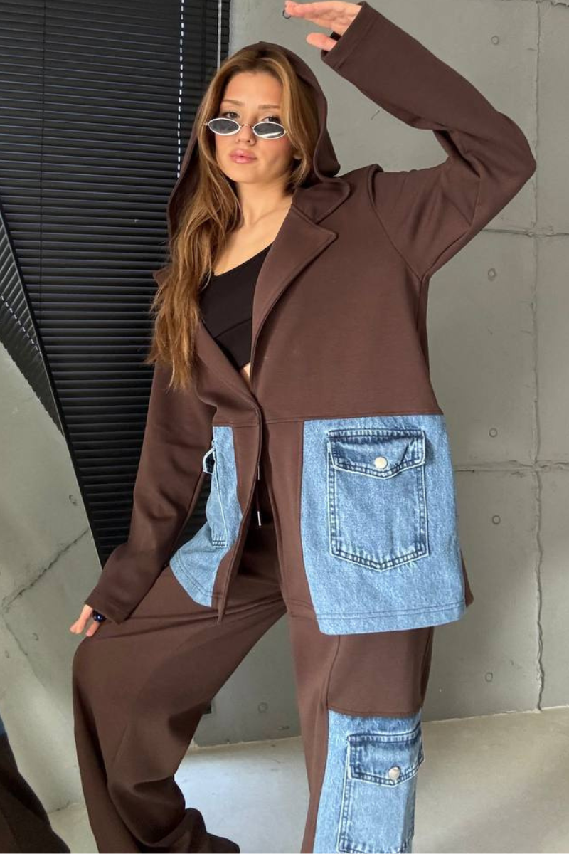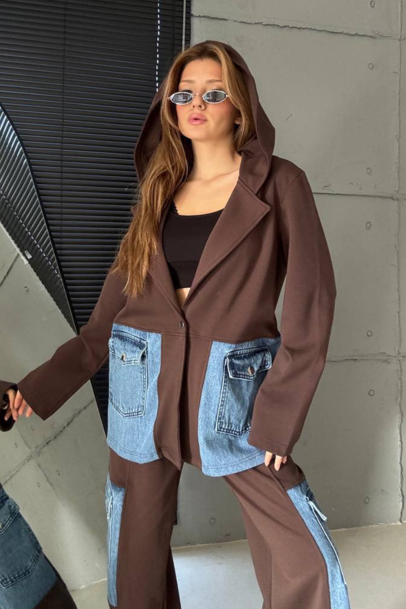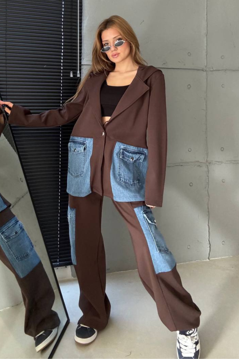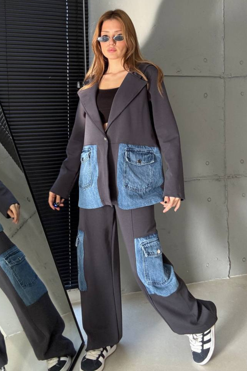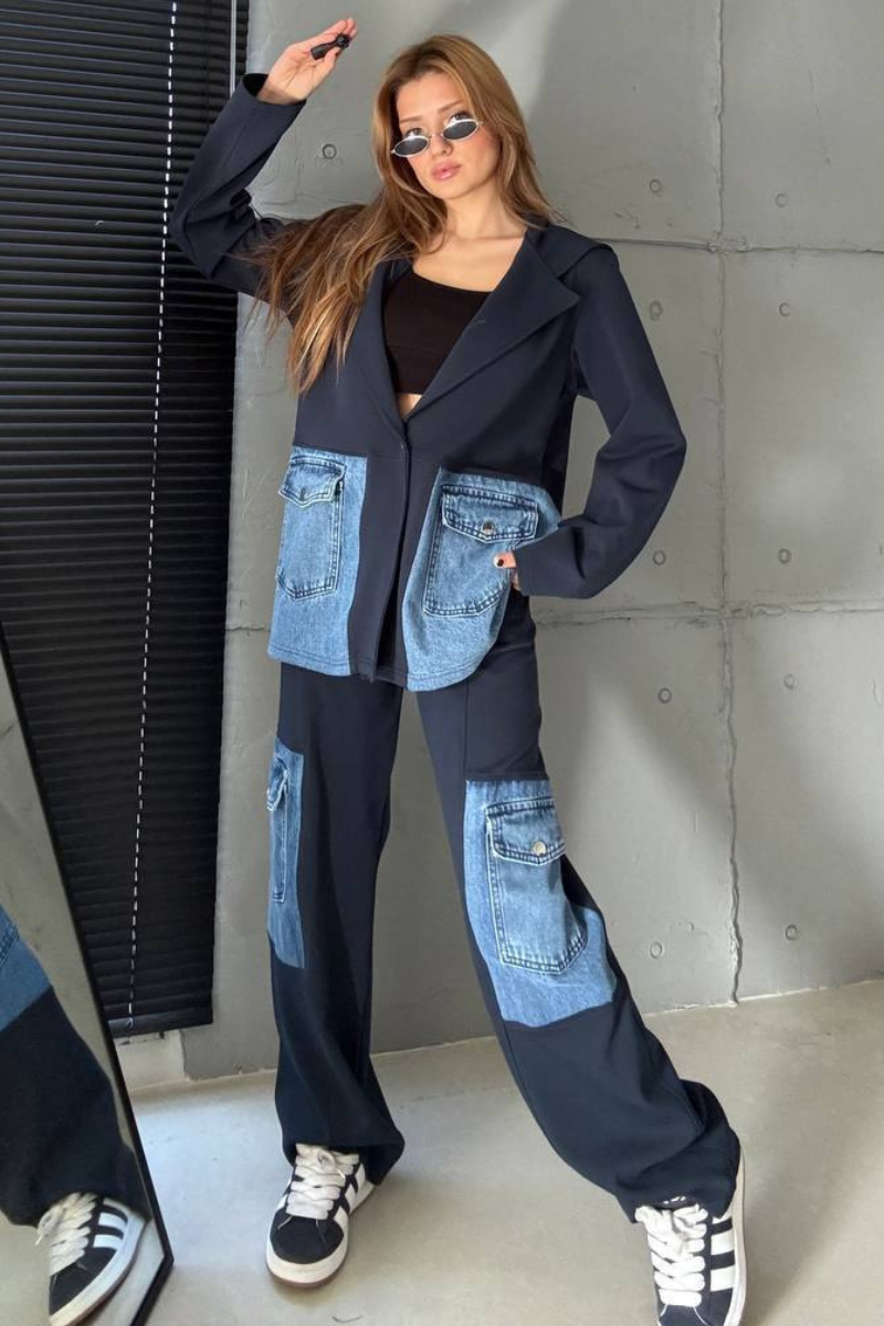 A stylish coordinated denim set featuring a tailored blazer and matching bottoms.