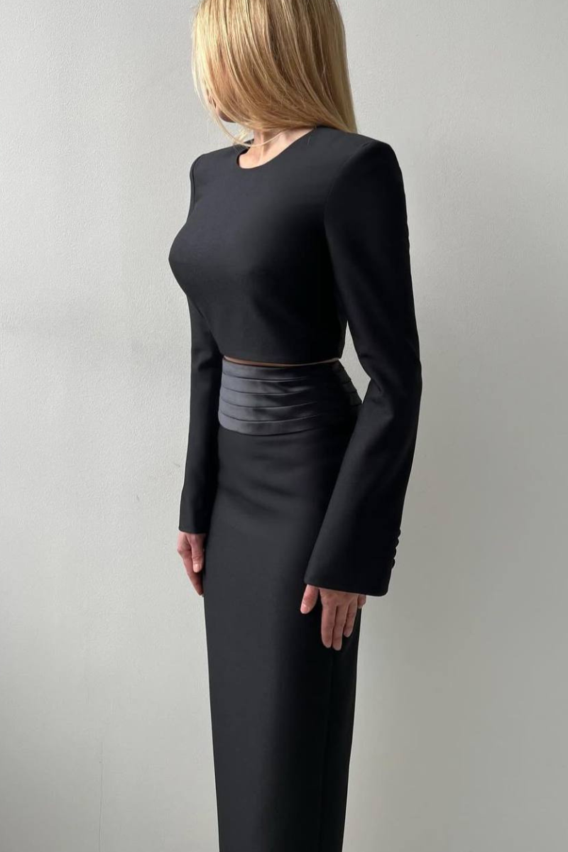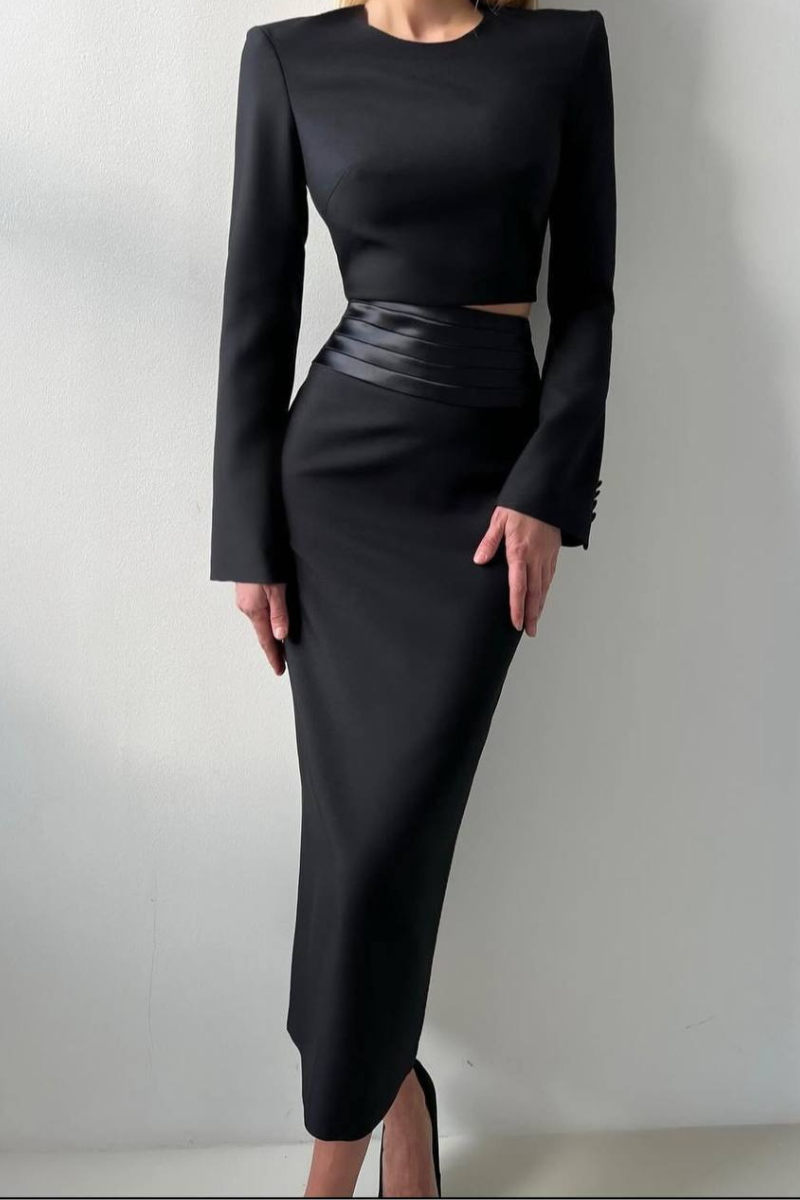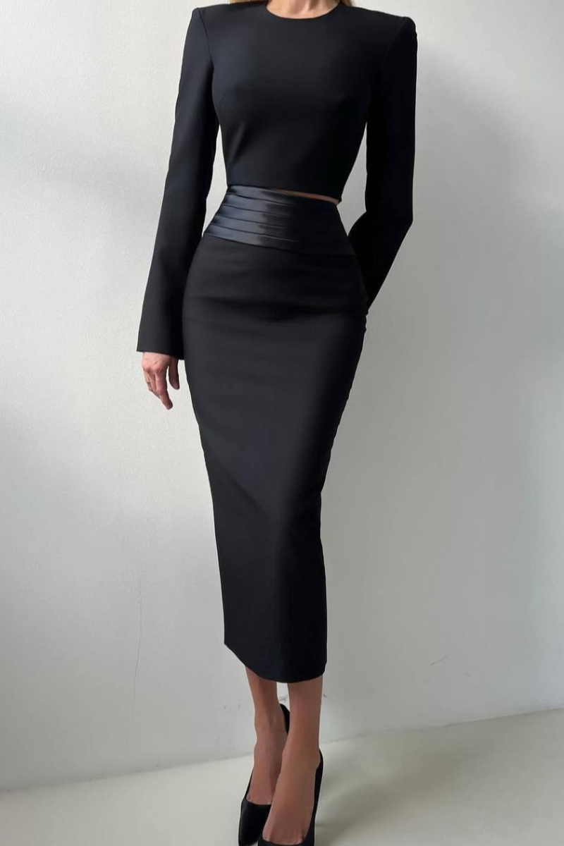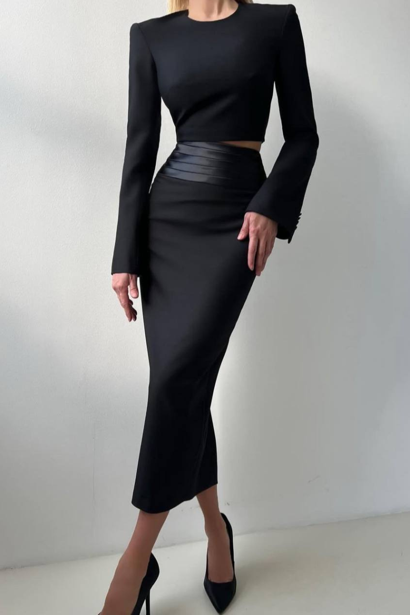 A chic matching set featuring a flattering midi skirt and coordinating top.