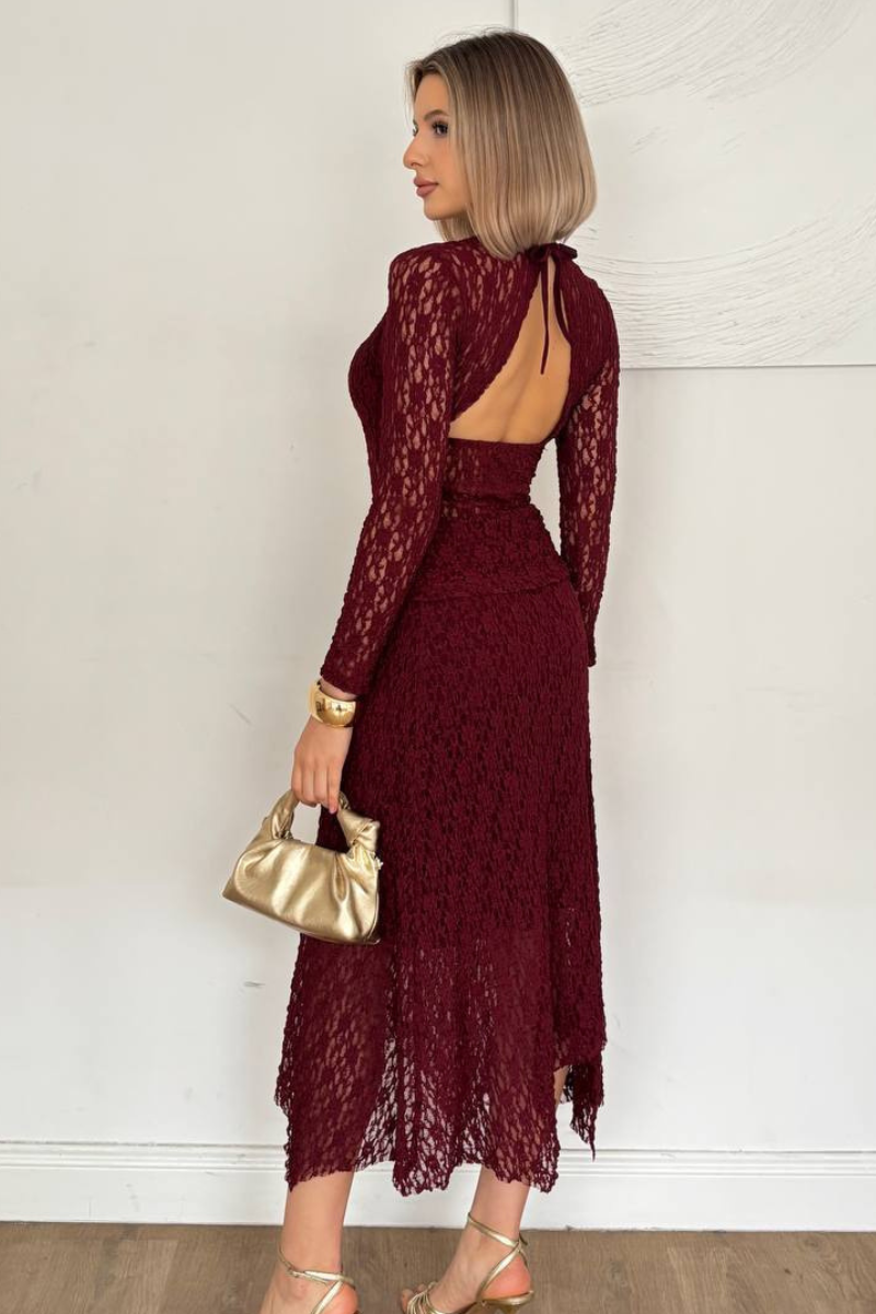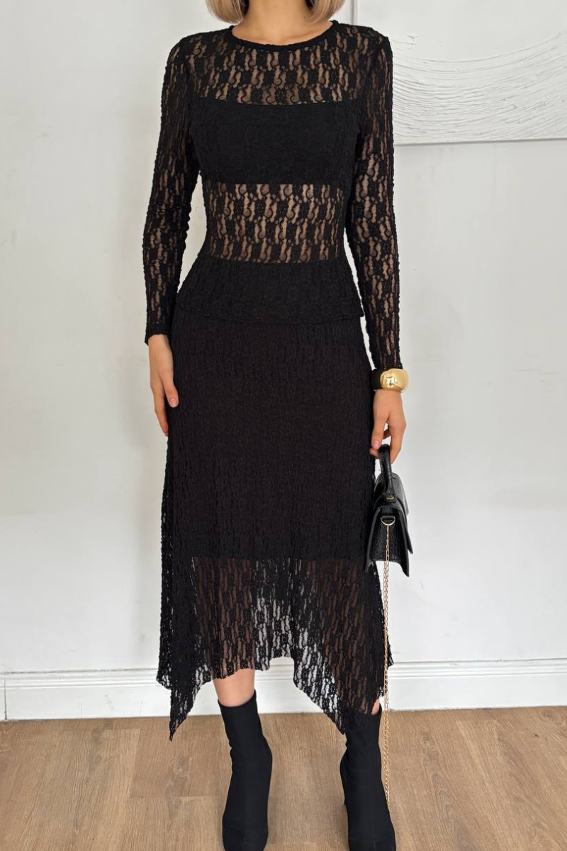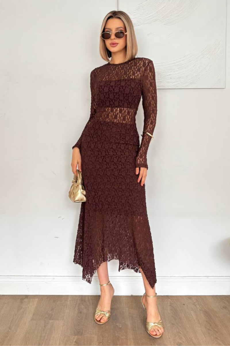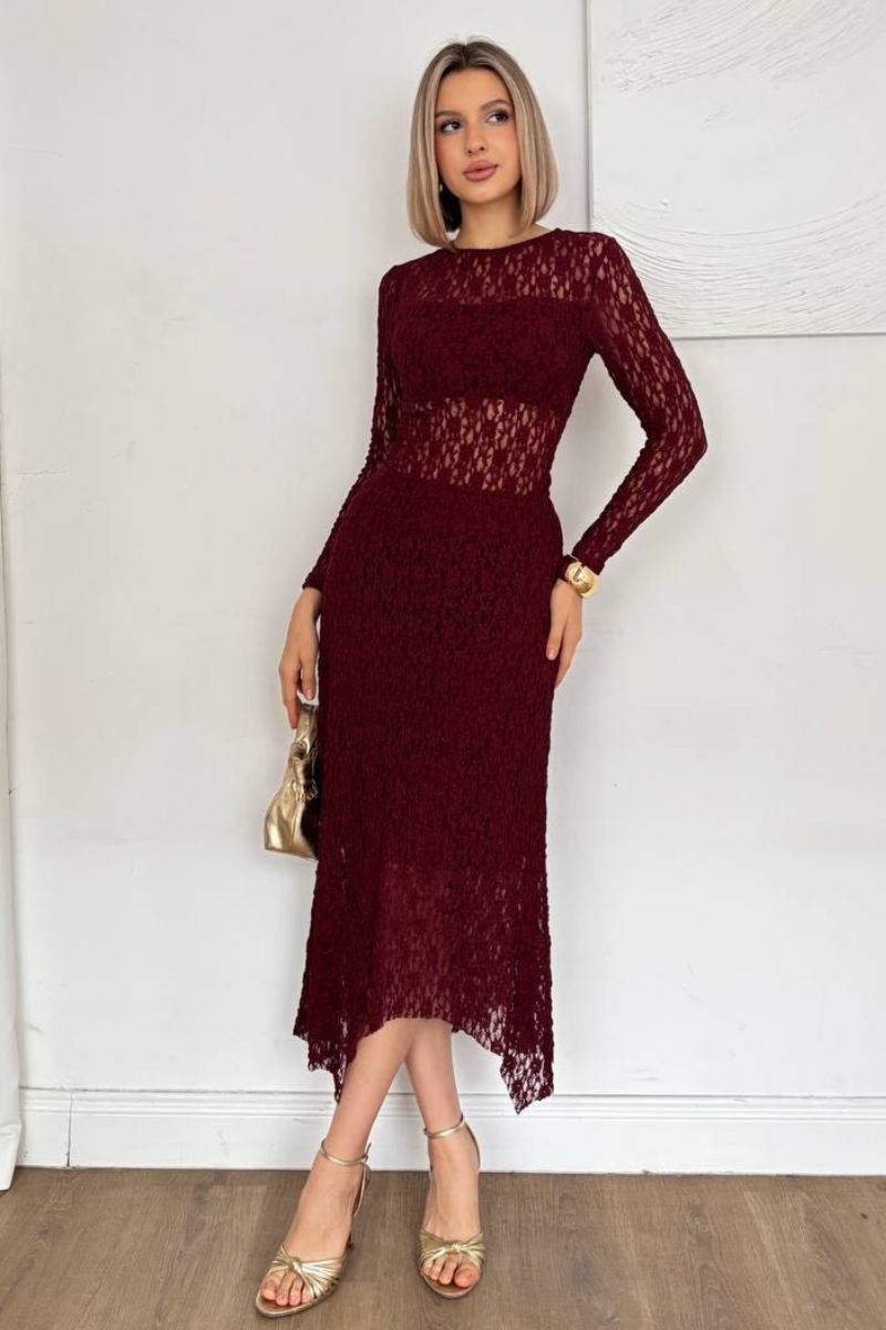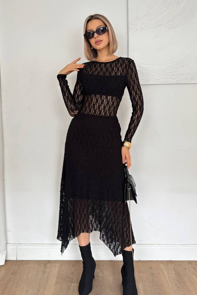 Stylish lace midi asymmetrical dress featuring delicate lace details and a modern uneven hem for an elegant, fashion-forward look.